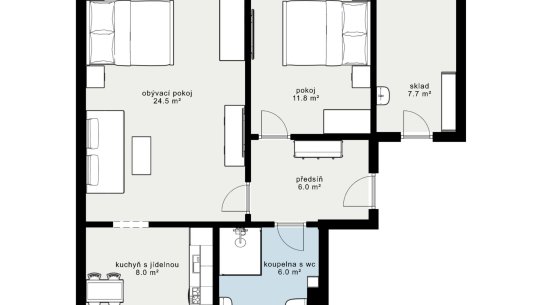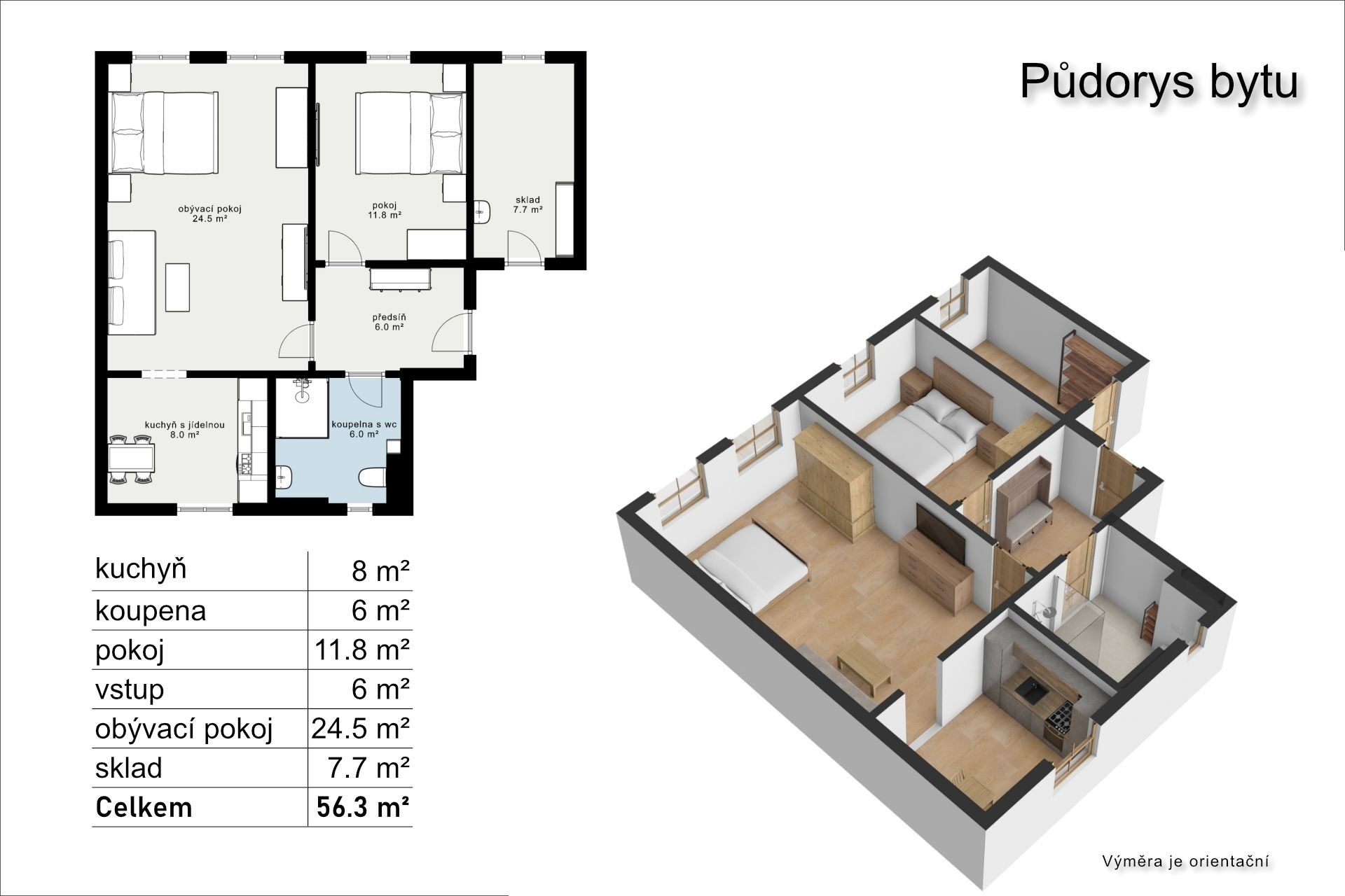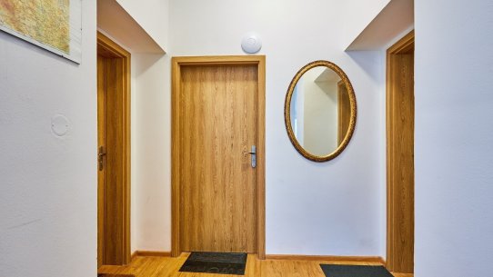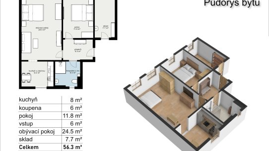 Apartmán má dispozici 2+1 a výměru 64 m2. Skládá se ze dvou pokojů, zařízené kuchyně, koupelny s WC a skládku. K apartmánu patří vlastní parkovací stání, na kola je tu společná kolárna a kolem domu zahrada.