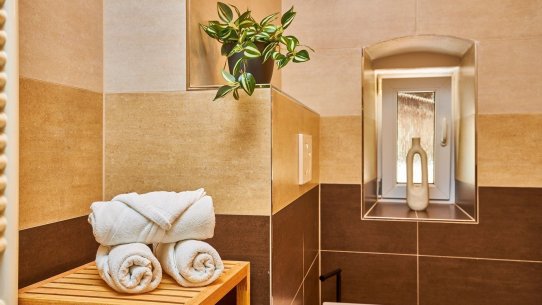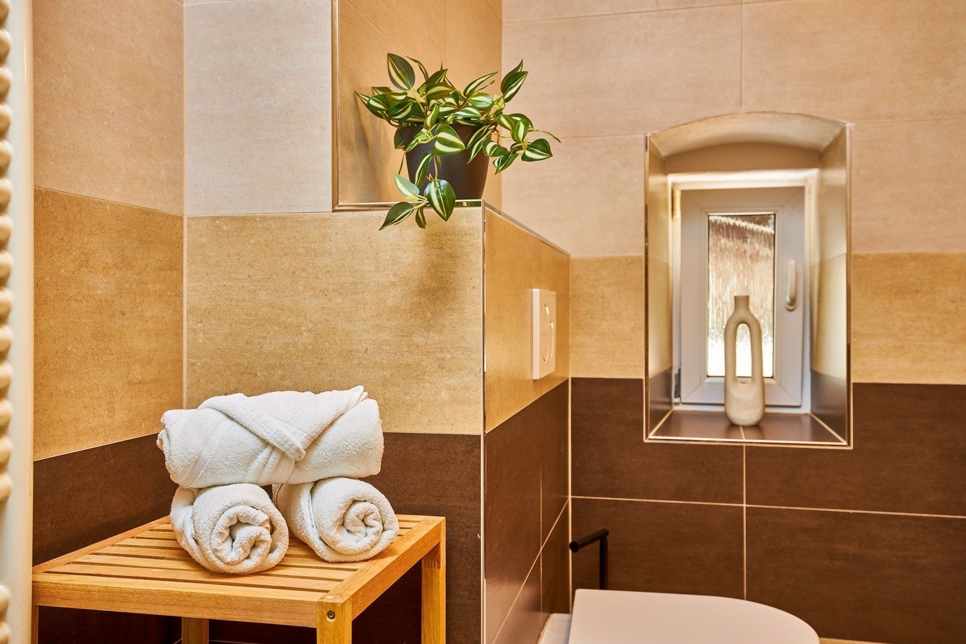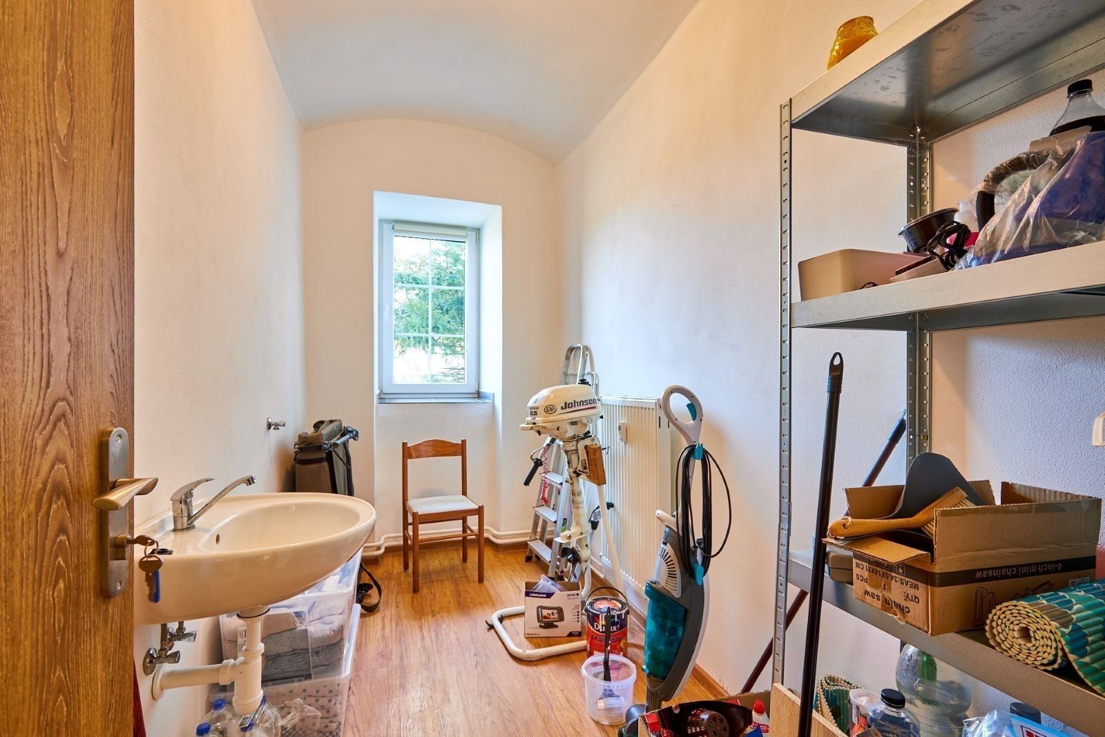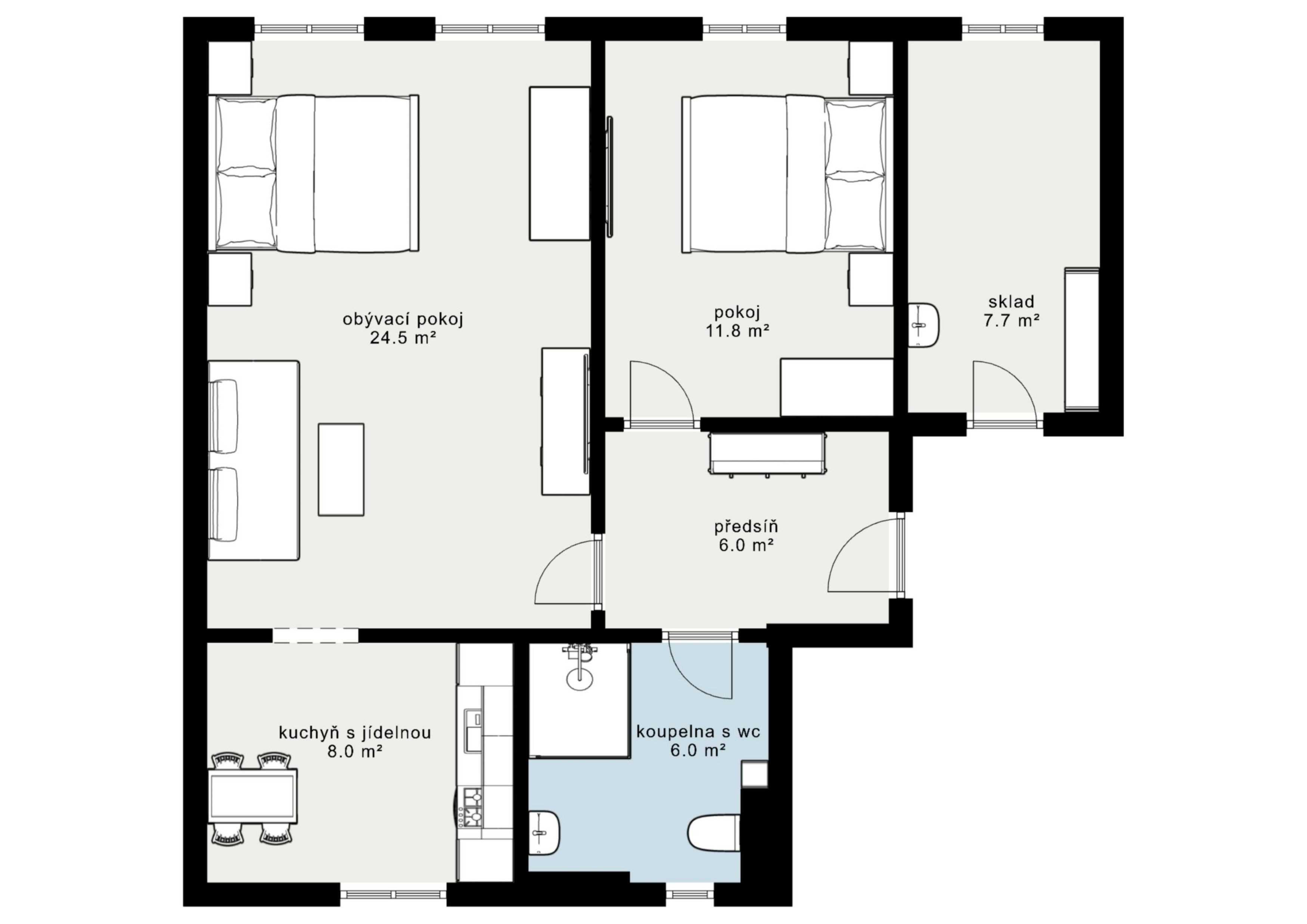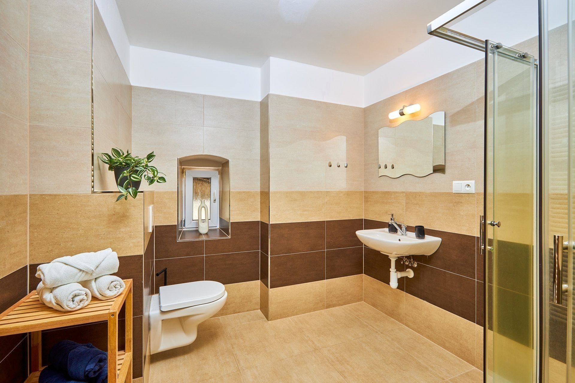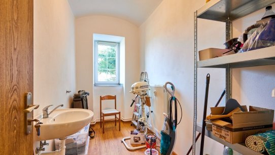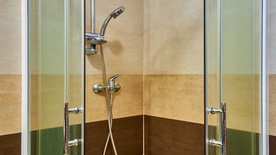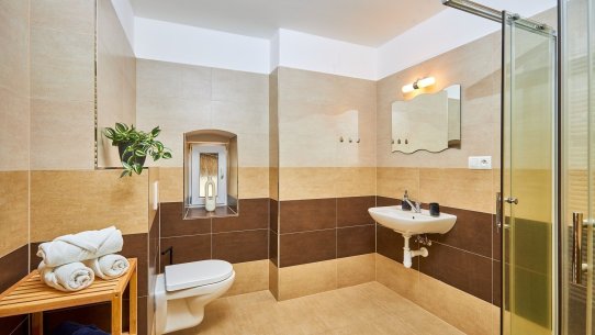 V koupelně je prostorný sprchový kout a toaleta. K tomu je tu sklad s umyvadlem, kam uložíte všechno, co se nevešlo jinam.