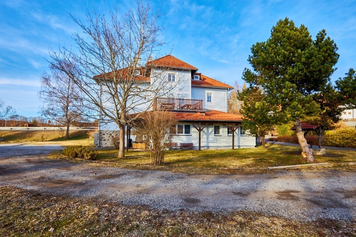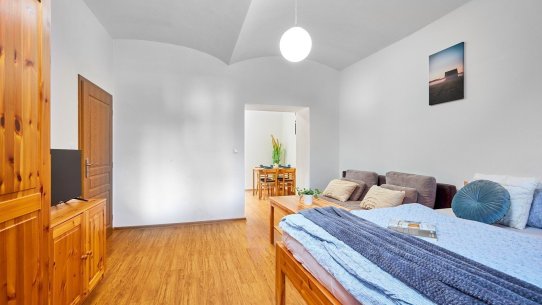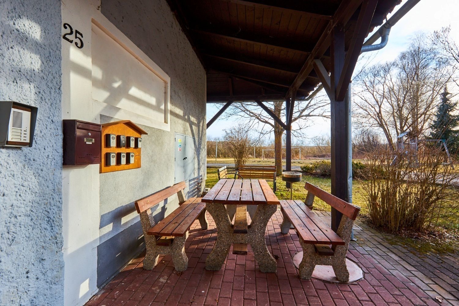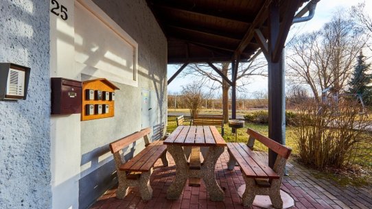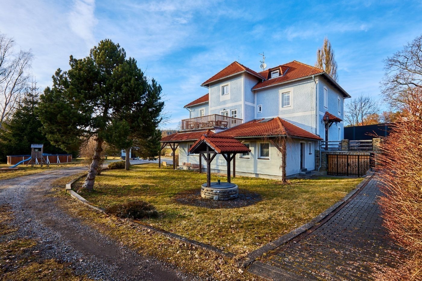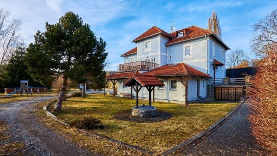 V domě je celkem 7 bytů a ten váš je umístěný v prvním patře. Na společné zahradě je bazén, ohniště a krytá pergola, která vám zpříjemní letní večery.