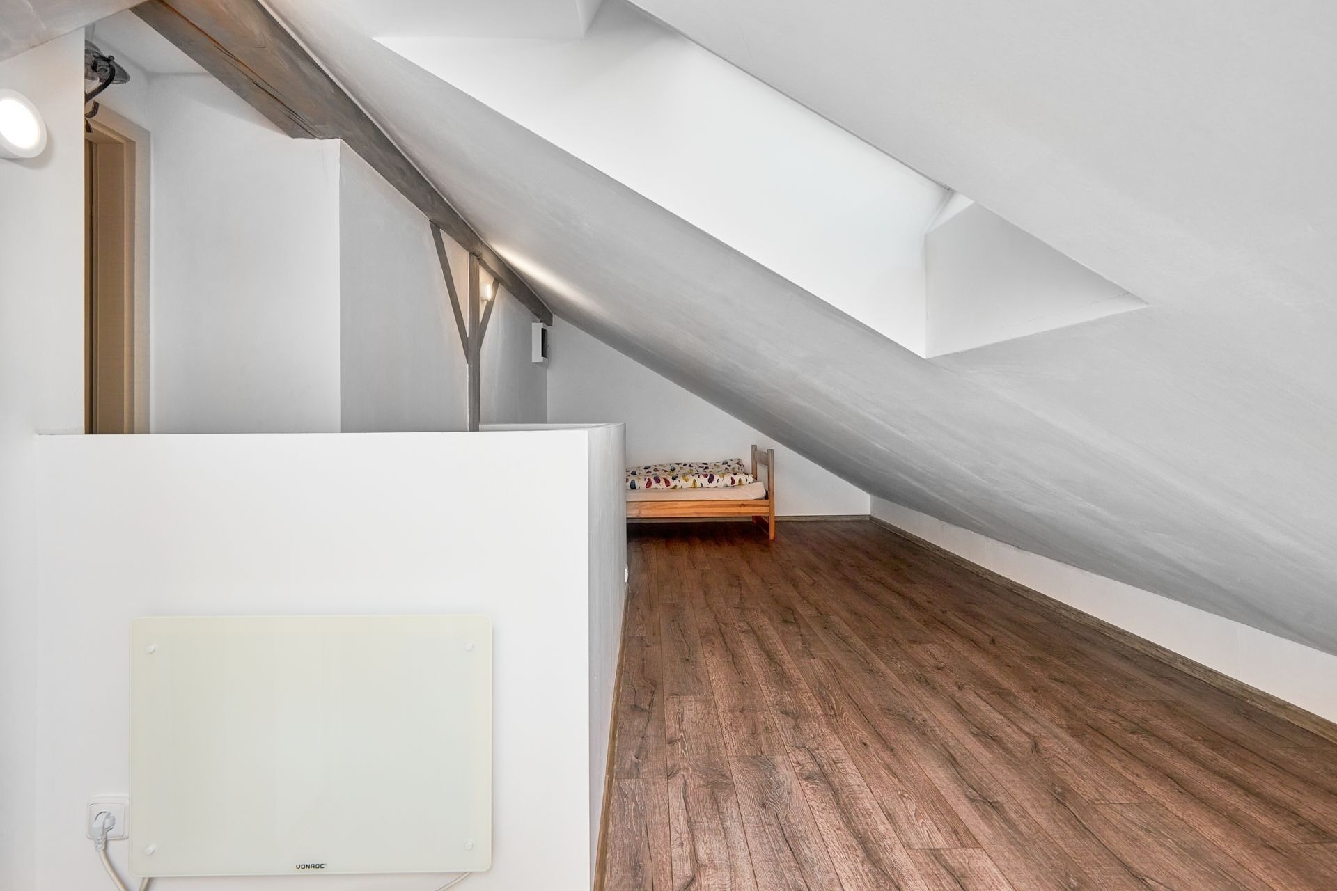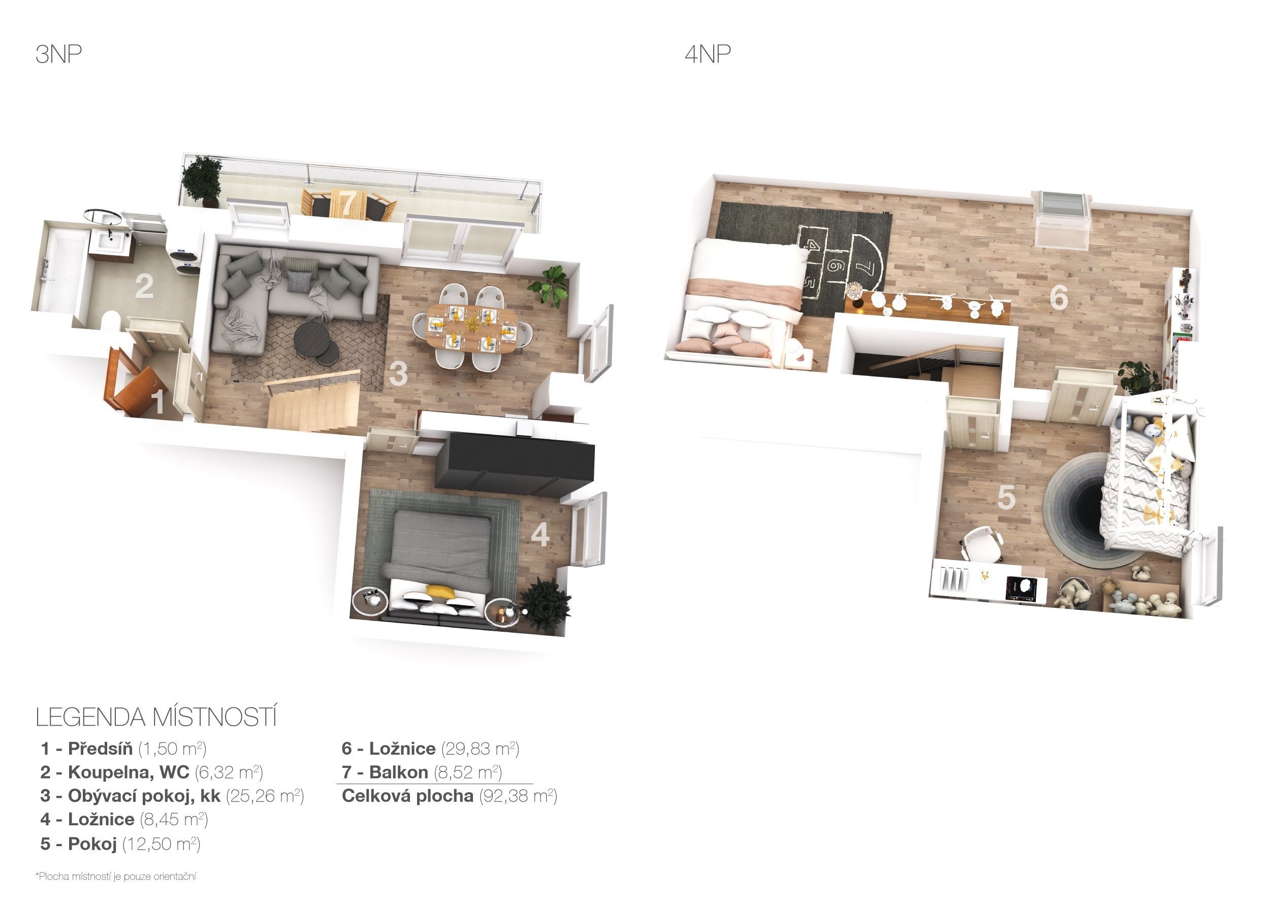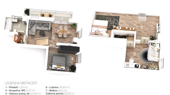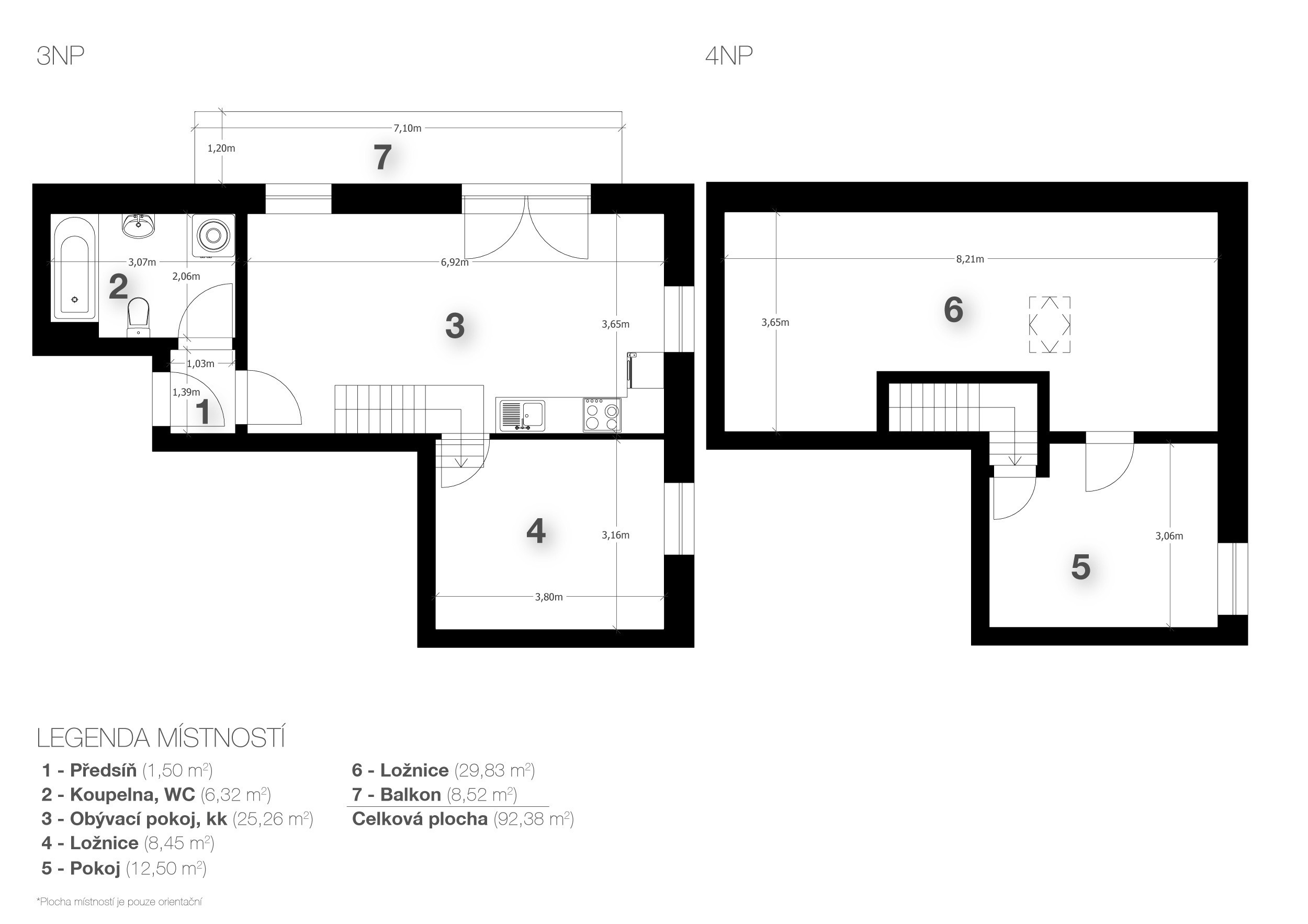 Byt je mezonetový, má dispozici 3+kk a výměru 94 m². Nachází se ve 3. patře, které bylo dostavěno v roce 2023 – vše je tu jako ze škatulky.