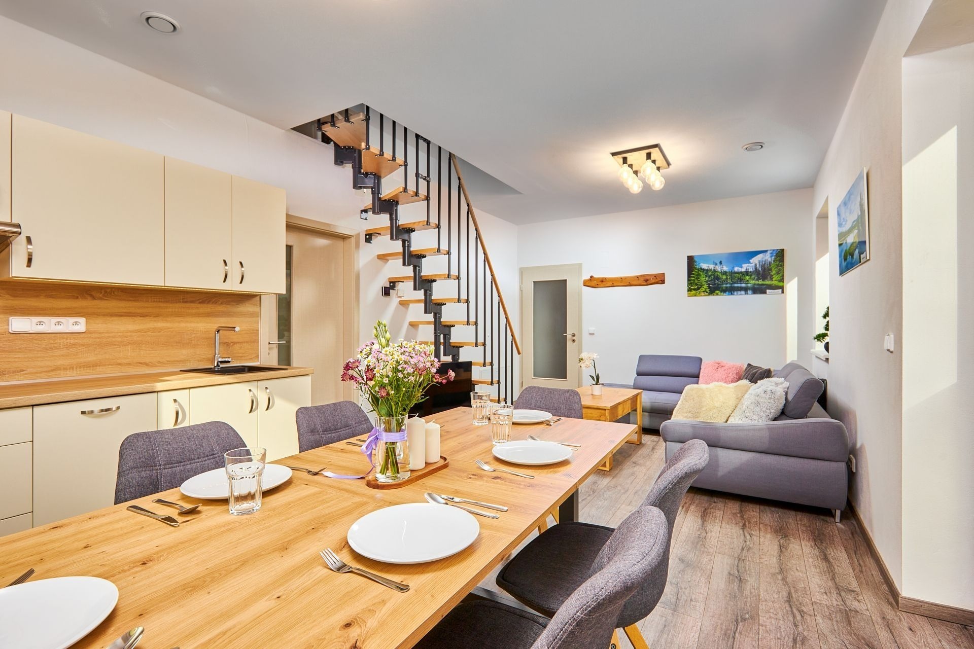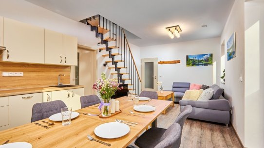 Obývací pokoj s kuchyňským koutem a balkonem si zamilujete. Snídaně vám zpříjemní výhled na šumavskou přírodu a večer si tu zahrajete deskovky s celou partou.
