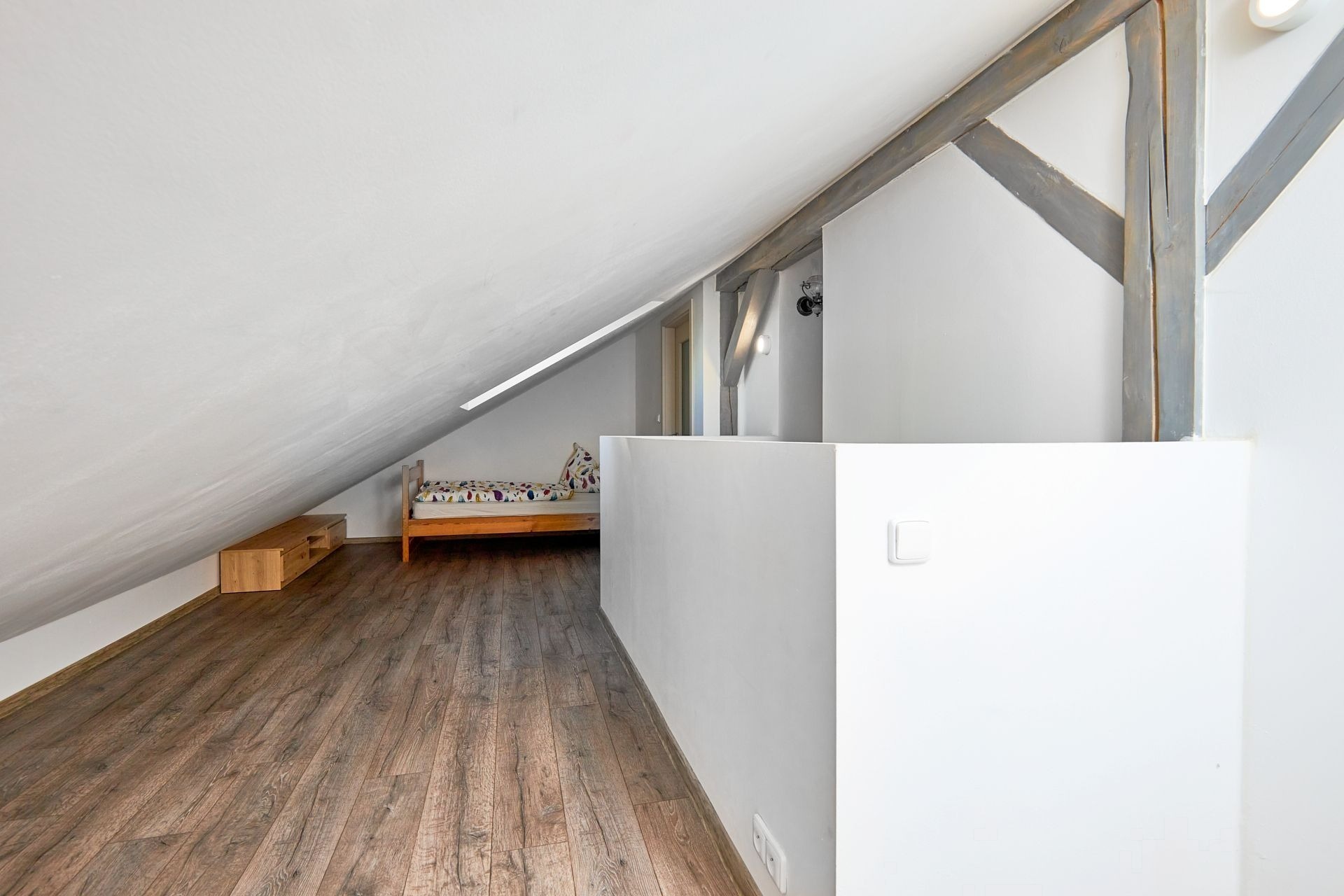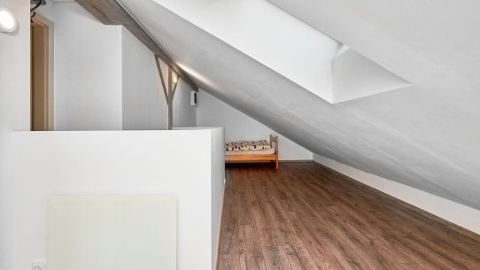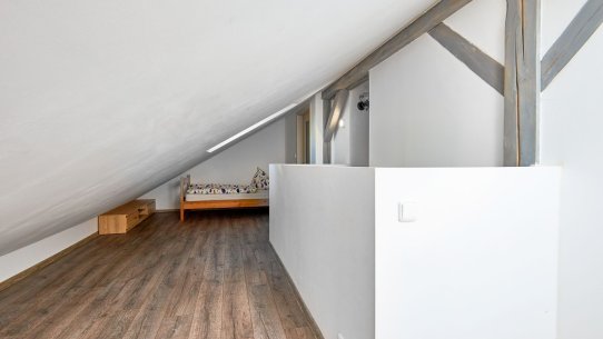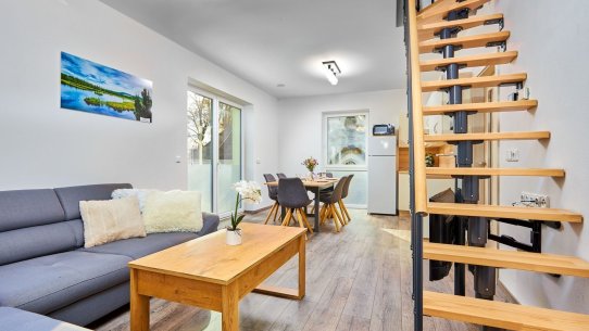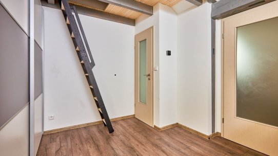 V přízemí je obývací pokoj s kuchyní, ložnice a koupelna, v patře je další pokoj a přístup do půdního prostoru. K bytu patří sklep, balkon a společná kolárna. K dispozici je možnost zakoupení parkovacího stání pro komfortní parkování.