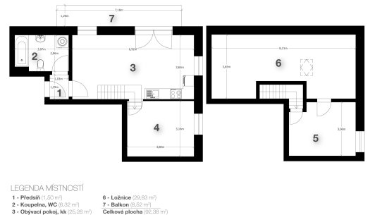 V přízemí je obývací pokoj s kuchyní, ložnice a koupelna, v patře je další pokoj a přístup do půdního prostoru. K bytu patří sklep, balkon a společná kolárna. Na pozemku za domem je soukromé parkoviště, kde vždycky v klidu zaparkujete.