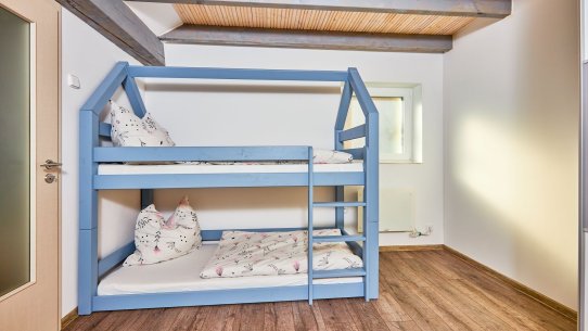 Při vaření u praktické kuchyňské linky zůstanete v kontaktu se zbytkem rodiny. Ve dvou ložnicích v přízemí a patře se pohodlně složí i početnější rodina nebo parta přátel. V koupelně je sprchový kout a WC.
