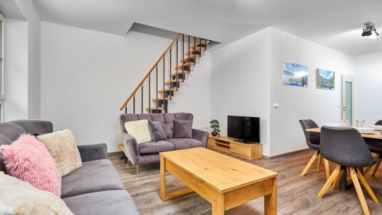 Obývací pokoj s velkými okny a jihozápadní orientací si zamilujete. Snídaně vám zpříjemní výhled na šumavskou přírodu a večer si tu zahrajete deskovky s celou partou.