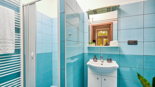 Byt č. 2 (1. patro) - má dispozici 1+1 a celkovou výměru 41 m². Kuchyně je umístěná hned za dveřmi, v pokoji je dost místa na postel i posezení. V koupelně je sprcha a WC.