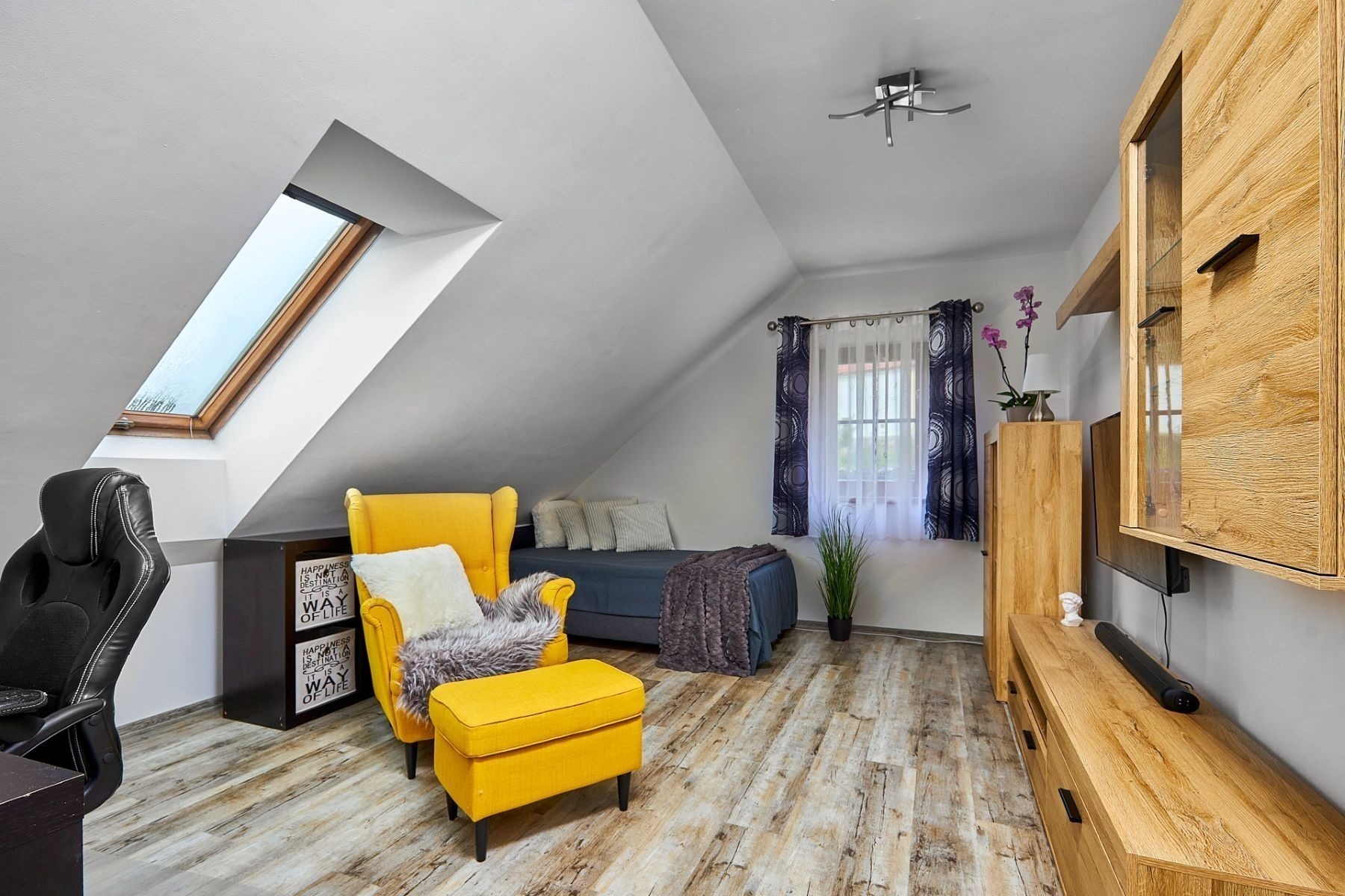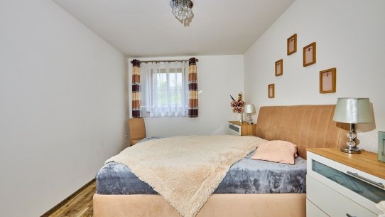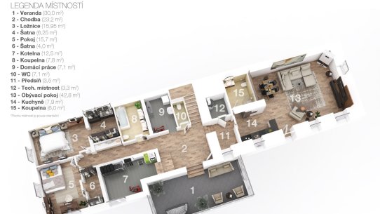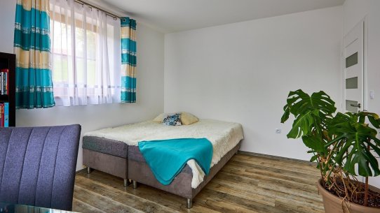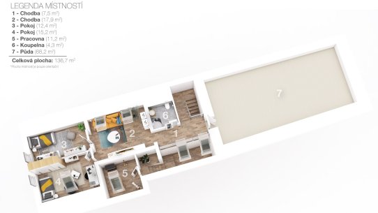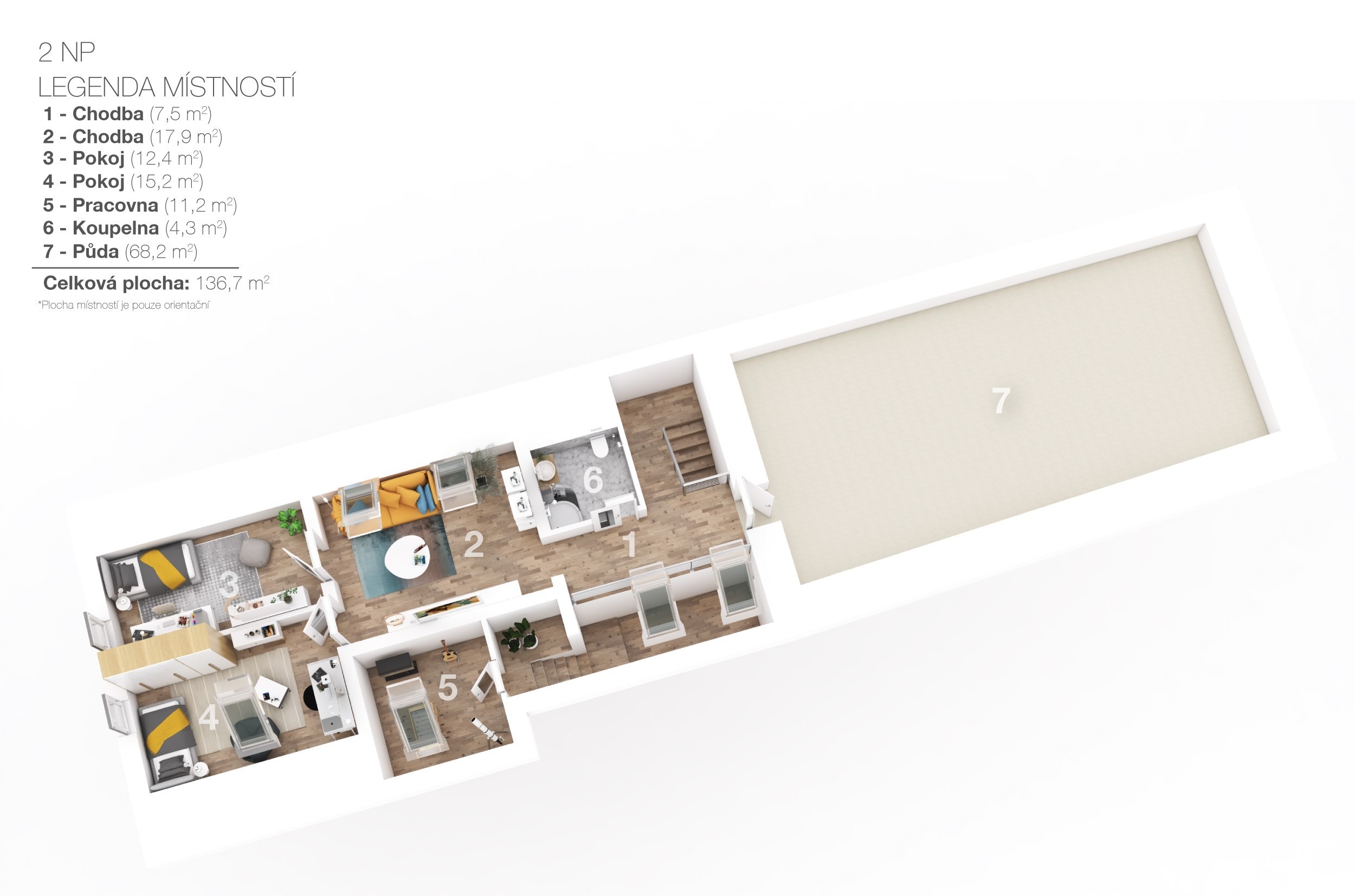 V přízemí jsou dvě ložnice se šatnou, dvě koupelny a samostatné WC. Další dvě ložnice a místo pro budoucí koupelnu najdete v podkroví. Tam na vás taky čeká pracovna pro klidnou práci z domova a chodba s prostorem na posezení.