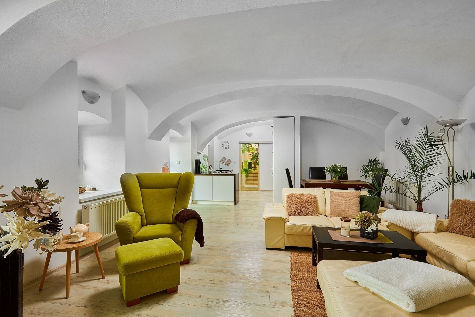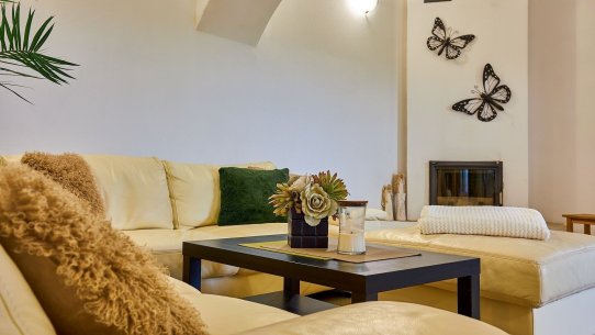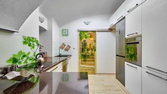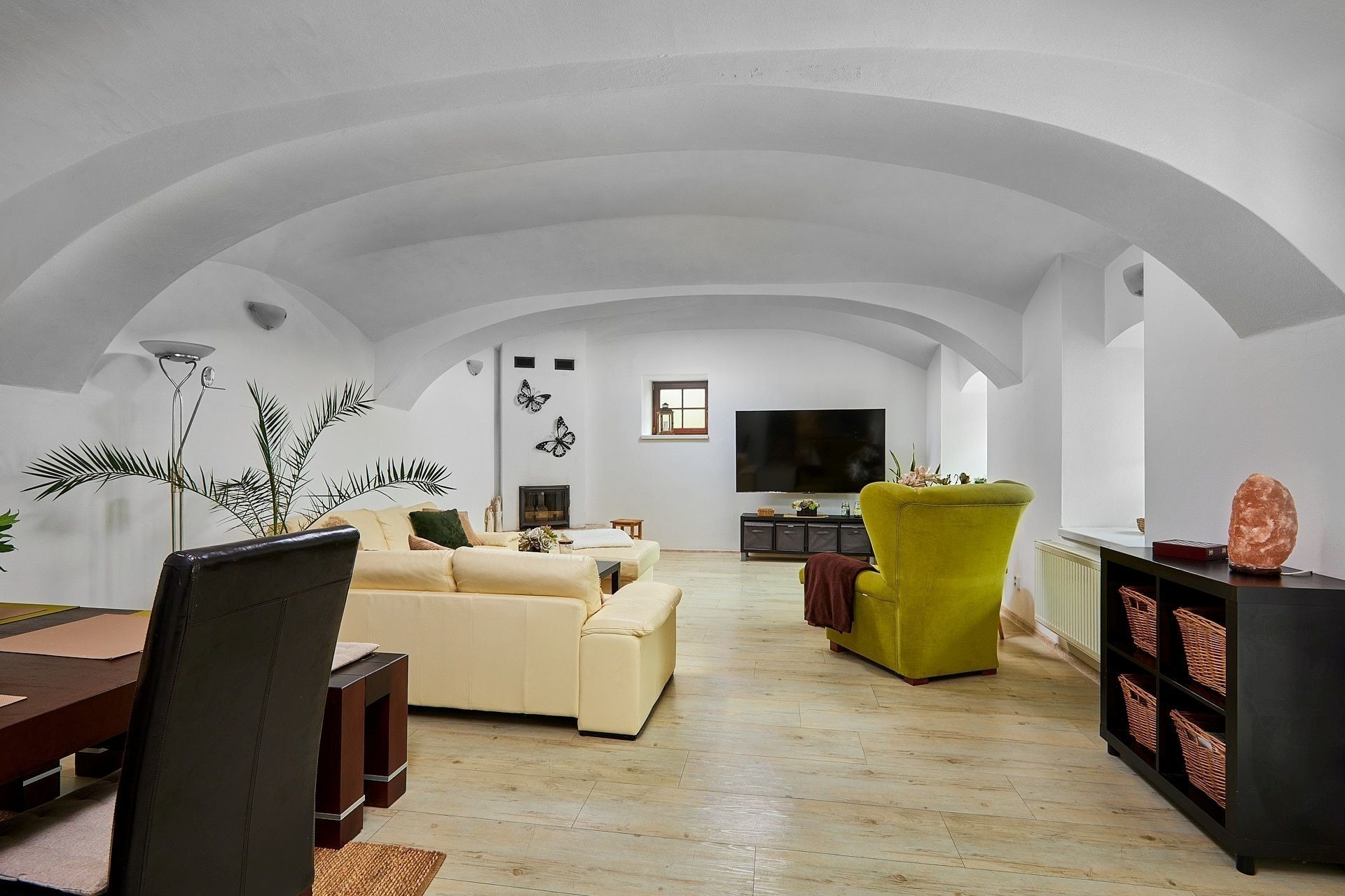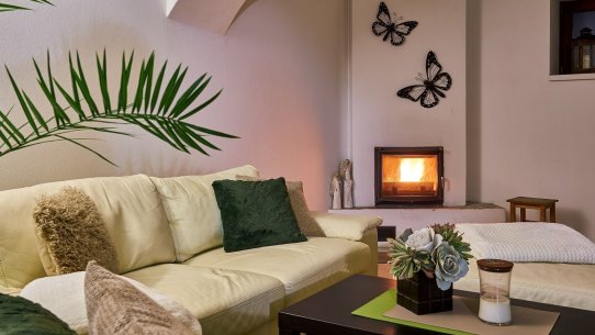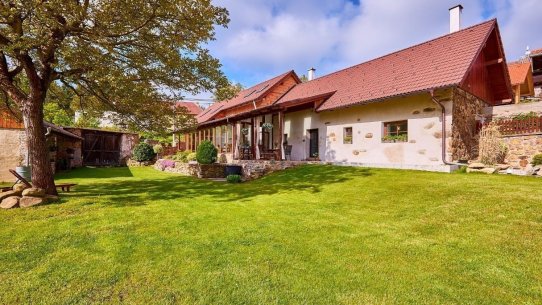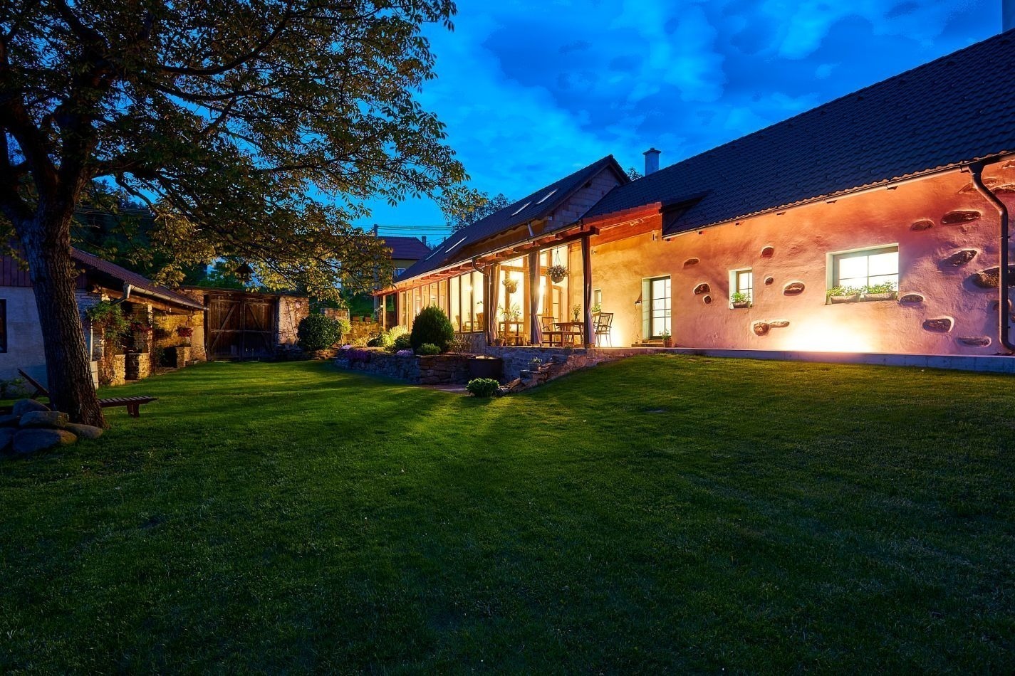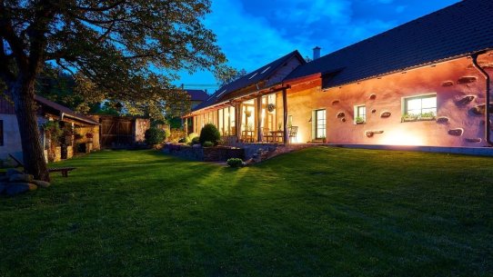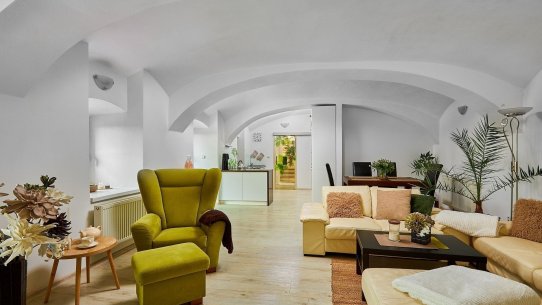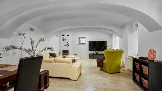 Opravdový duch místa na vás dýchne v obývacím pokoji, který se nachází v prostorách bývalé maštale. Atypické klenuté stropy mu společně s krbem dodávají jedinečnou atmosféru.