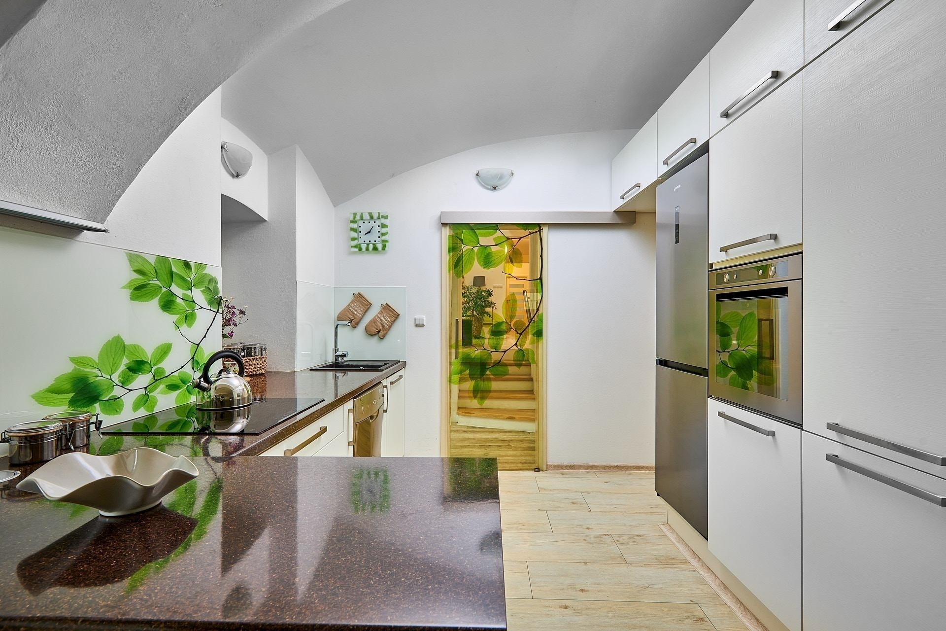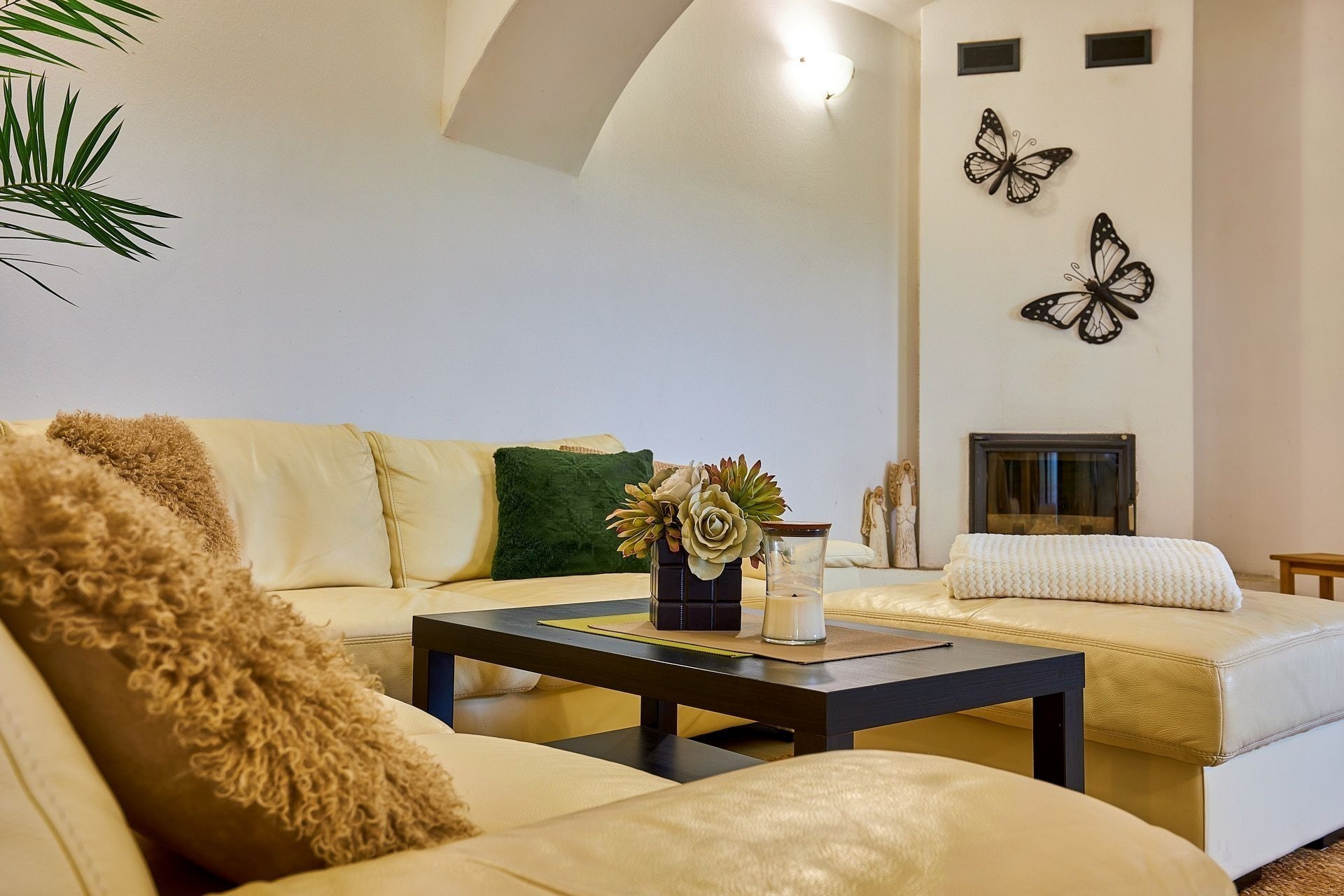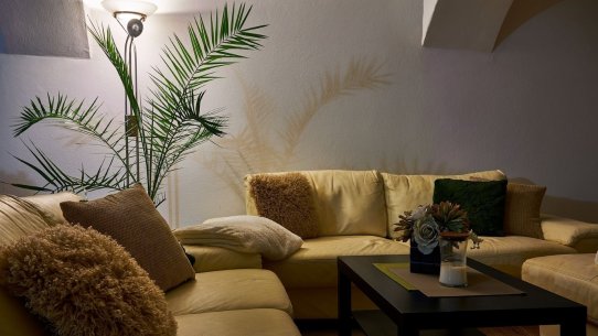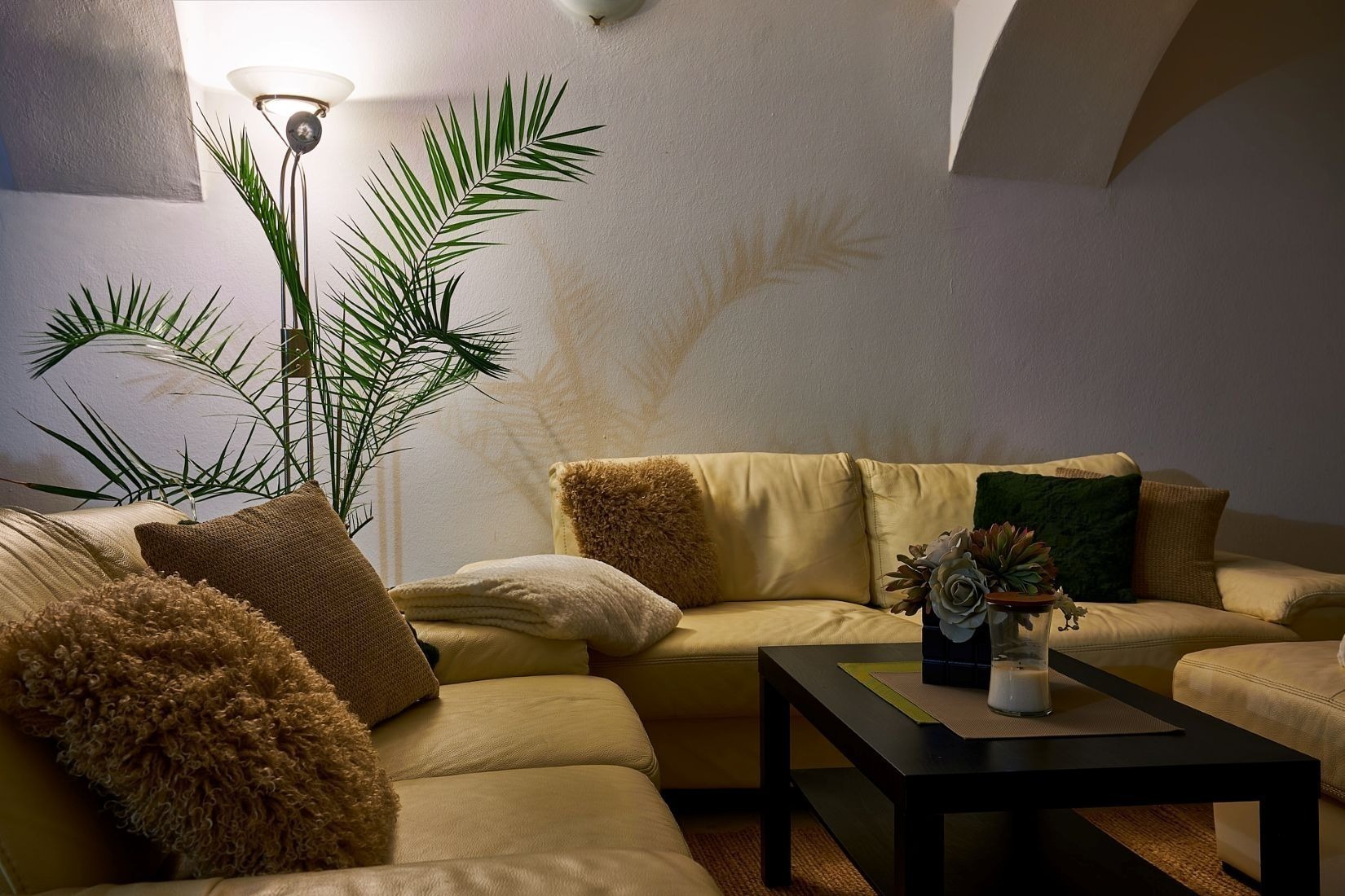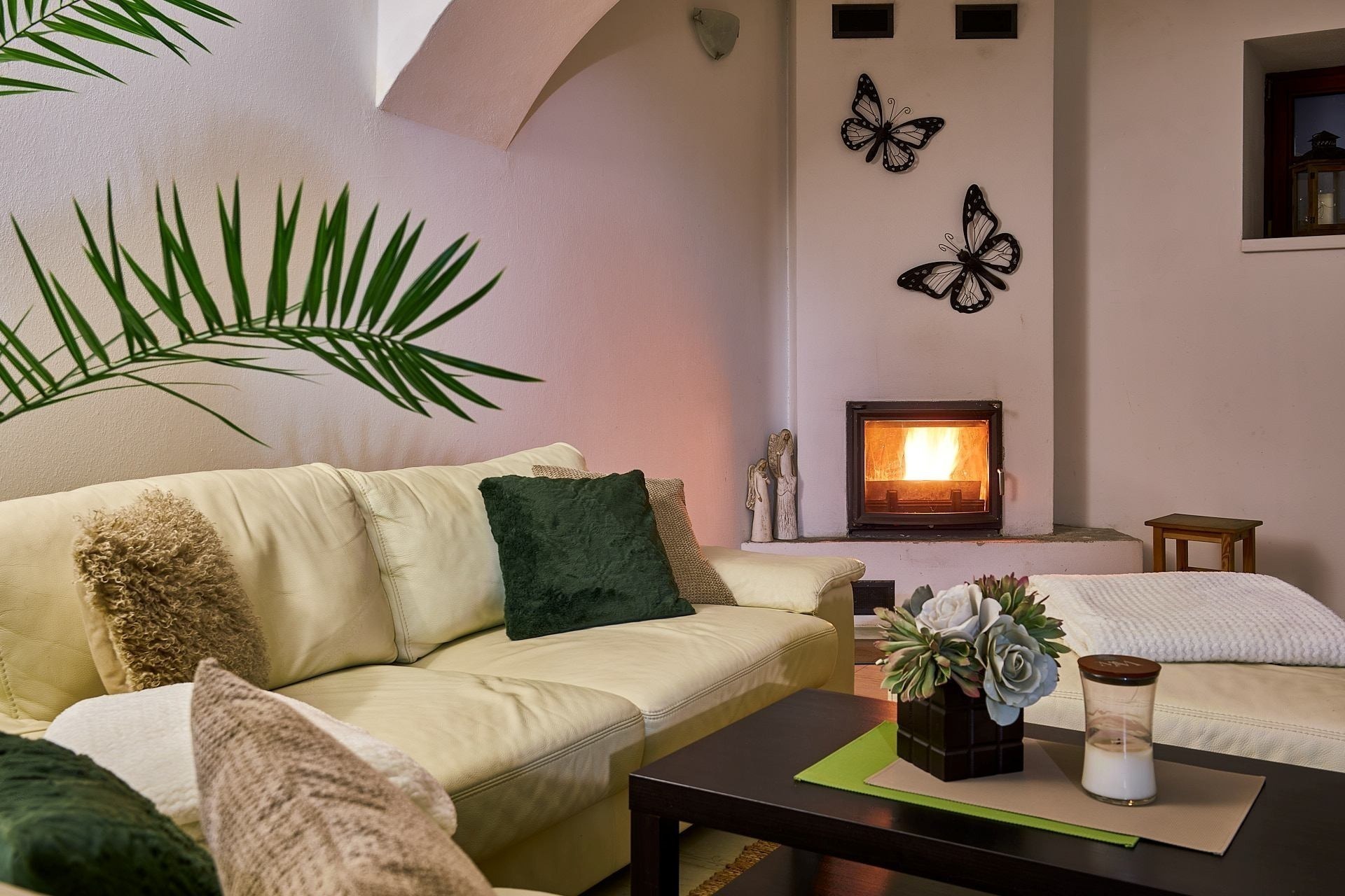 Opravdový duch místa na vás dýchne v obývacím pokoji, který se nachází v prostorách bývalé maštale. Atypické klenuté stropy mu společně s krbem dodávají jedinečnou atmosféru.