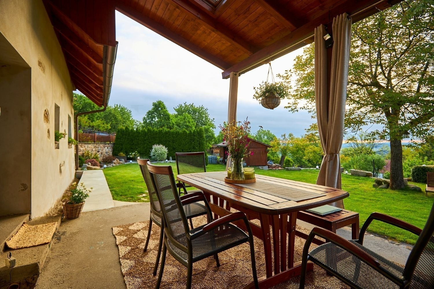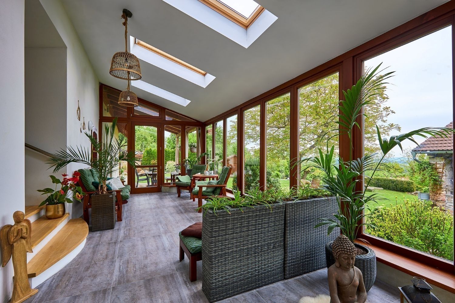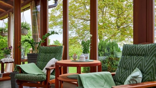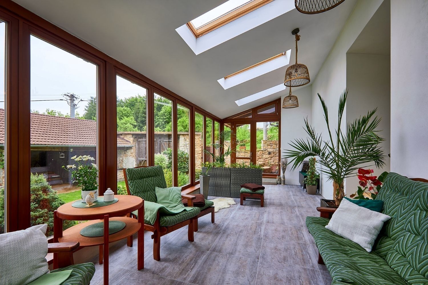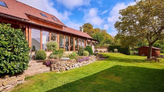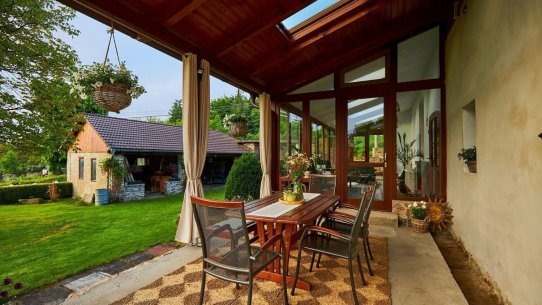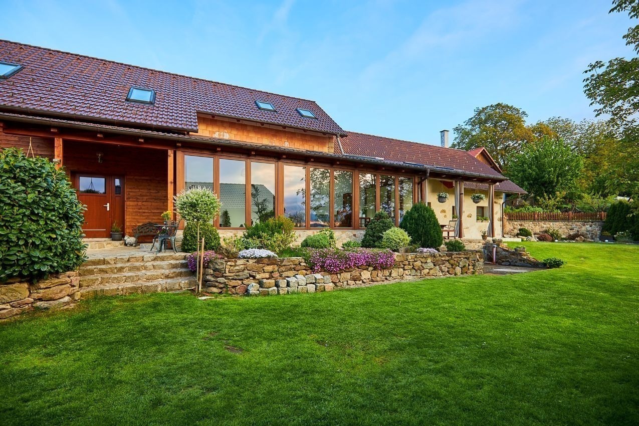 A kdyby náhodou nevyšlo počasí, můžete si ranní kávu nebo večerní skleničku vypít v zimní zahradě plné světla. Ta vás propojí s přírodou i když zůstanete uvnitř. A venku na vás čeká 1 600 m² pozemku s pečlivě udržovanou zahradou, kde si vždy najdete svůj zelený koutek pro odpočinek a rozjímání.