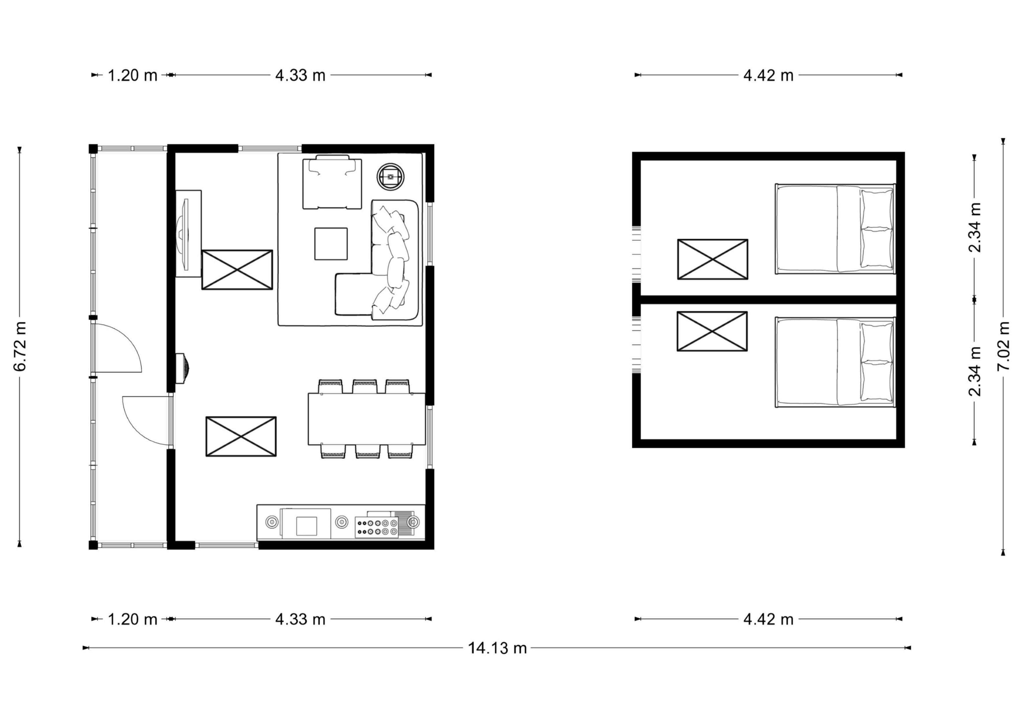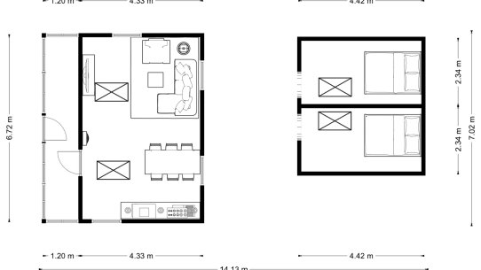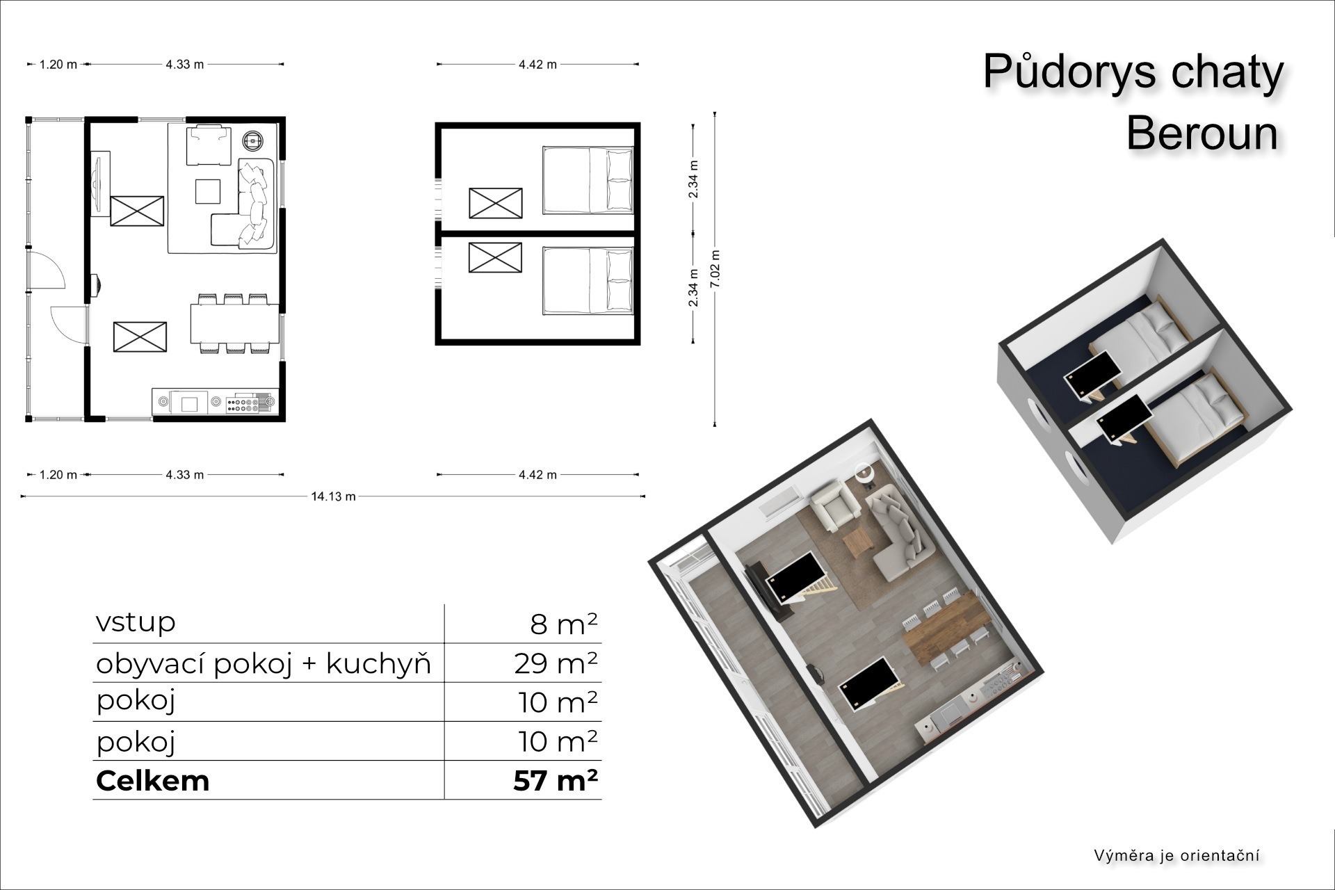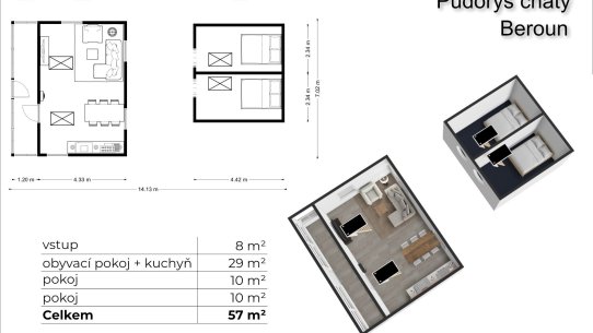 Chata má výměru 57 m² a skládá se z přízemí, podkroví a sklepa. V obývacím pokoji se za chladnějších večerů ohřejete u kamen, něco na zub připravíte u malé linky a vyspíte se v jedné ze dvou podkrovních ložnic.