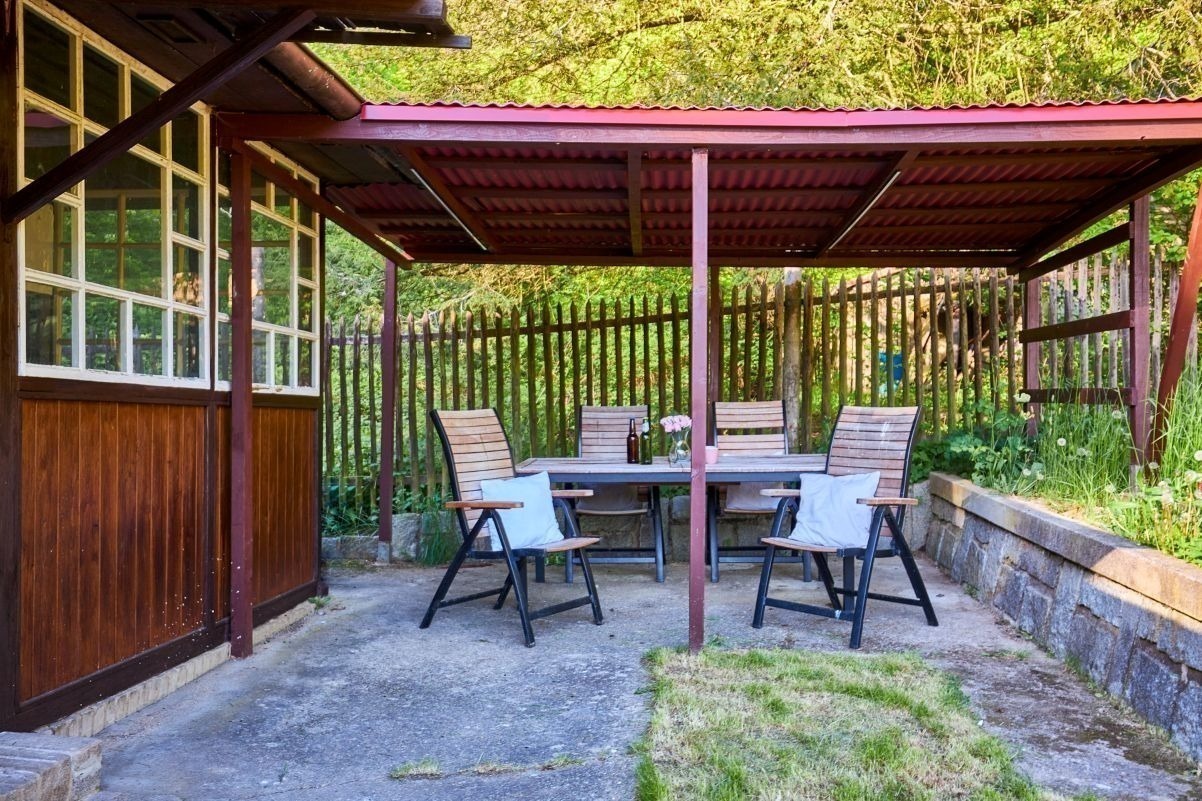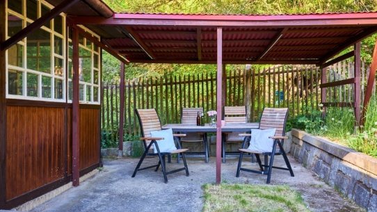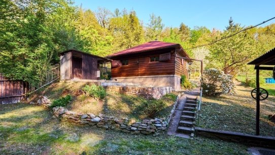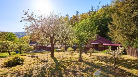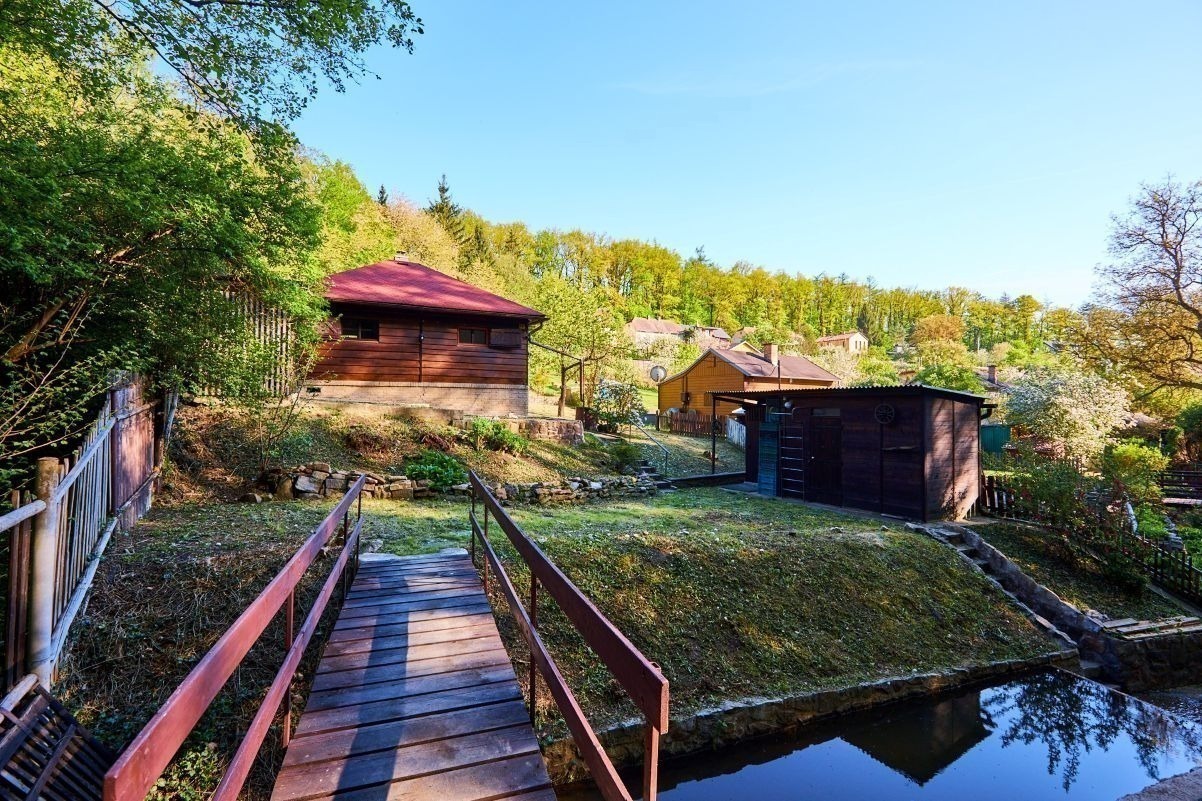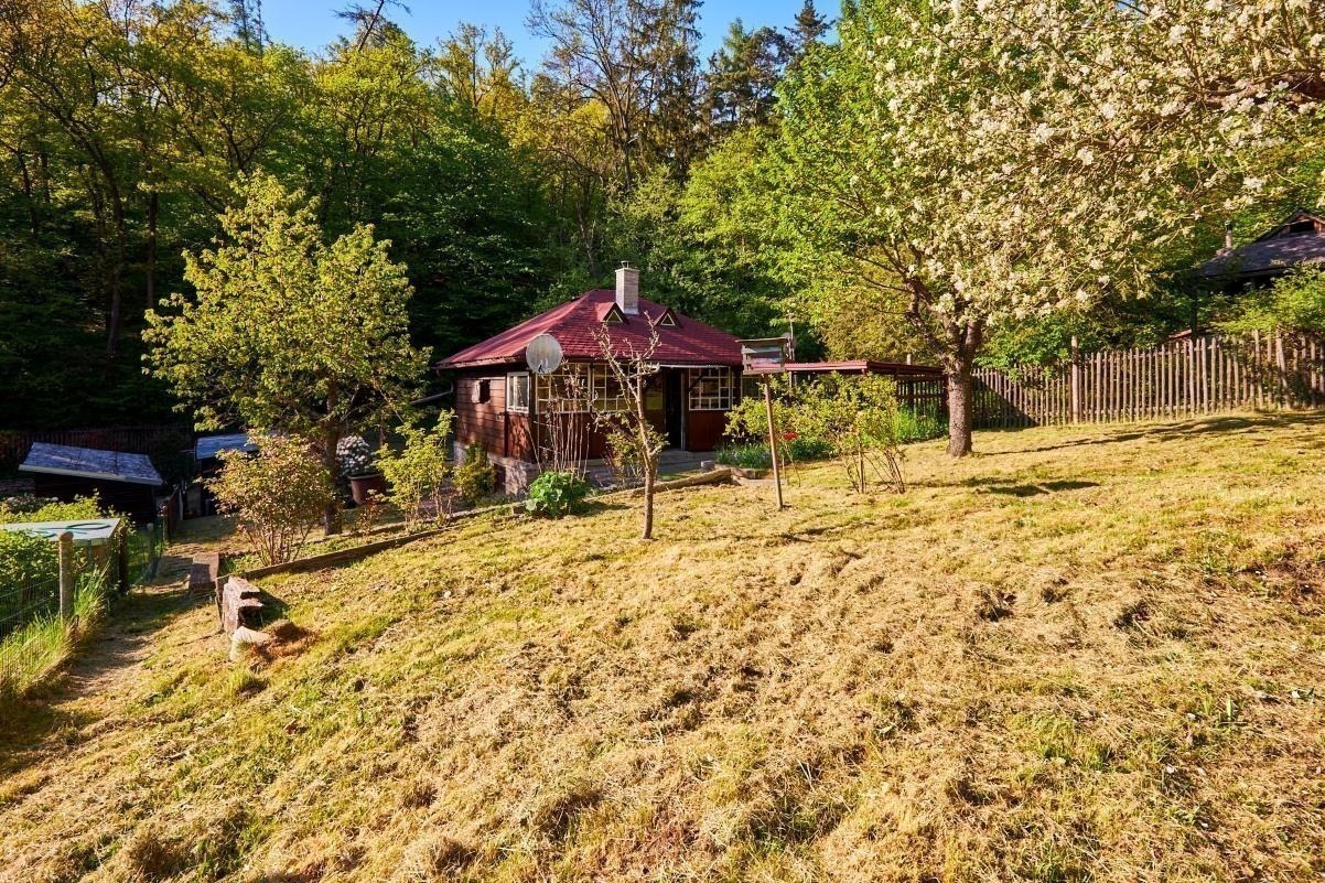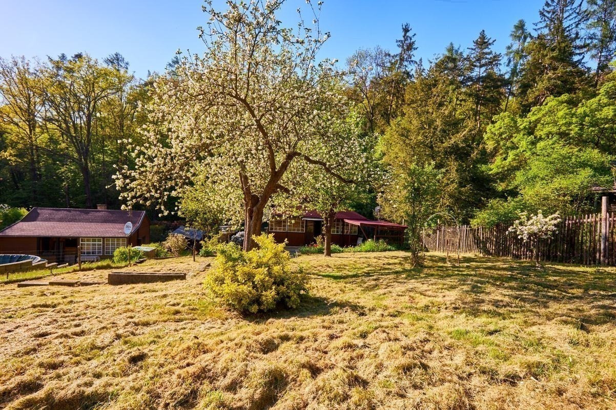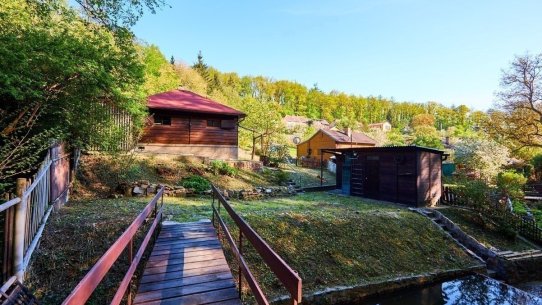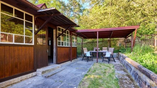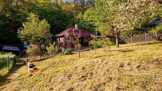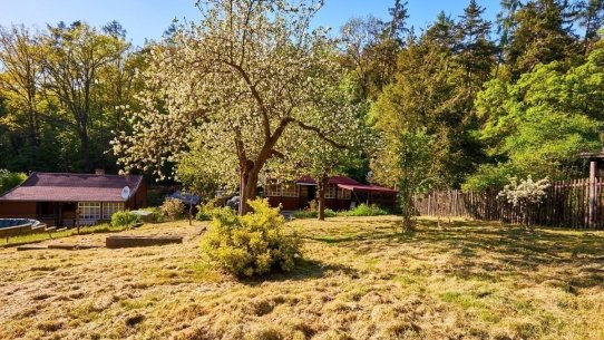 Na pozemku o velikosti 763 m² se rozkládá zahrada s pergolou a vzrostlými stromy. A protože je chata na samém konci chatové oblasti, budete tu mít naprostý klid. Osvěžit se můžete v potůčku, který teče pod chatou – a pokud toužíte po plnohodnotné koupačce, místa je tu dost i na bazén.