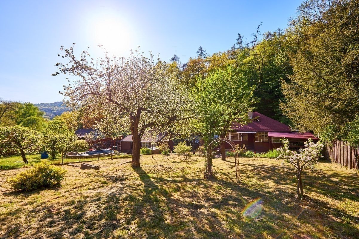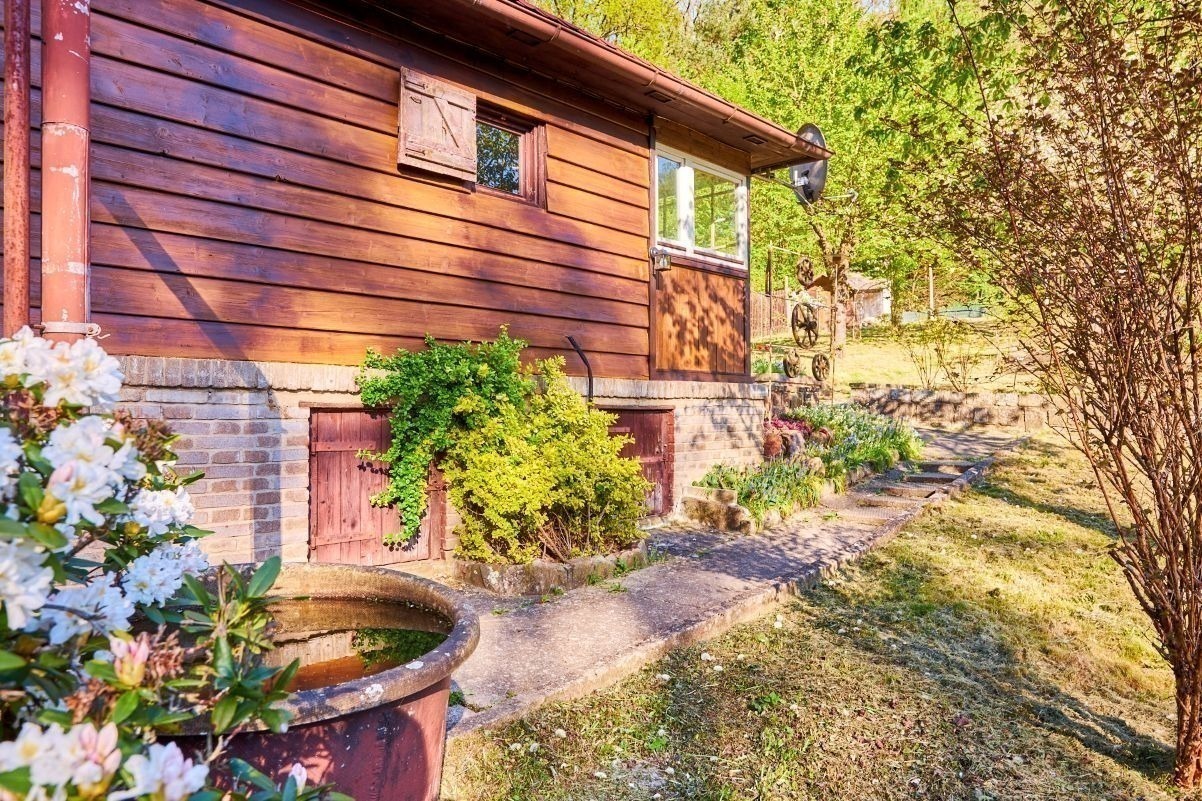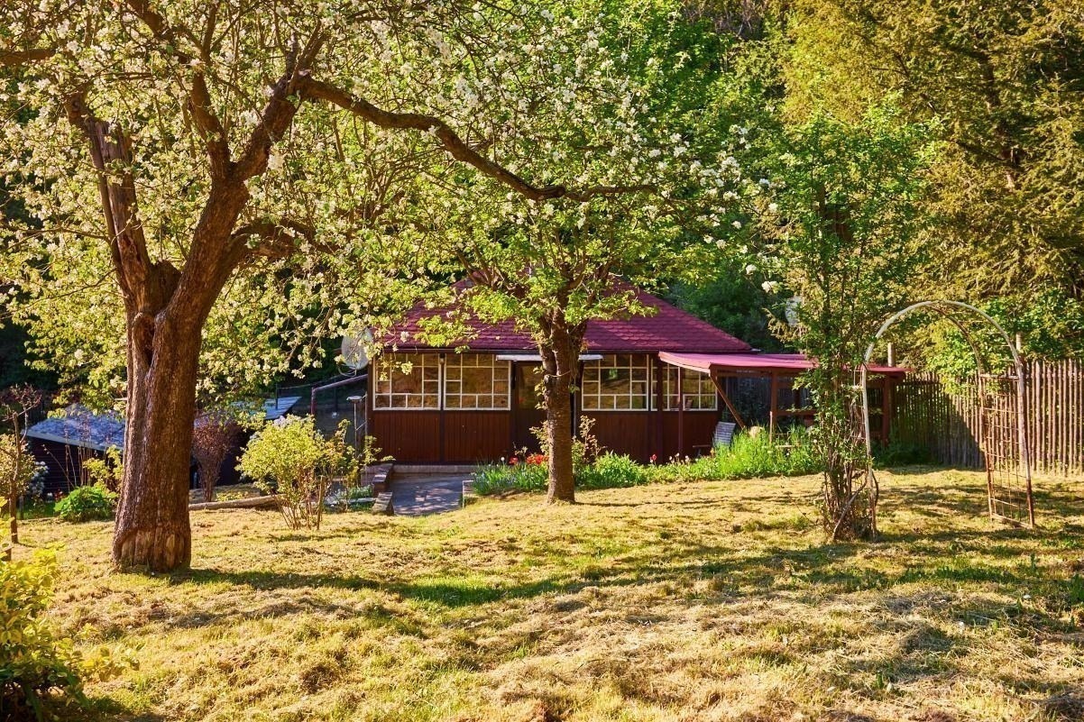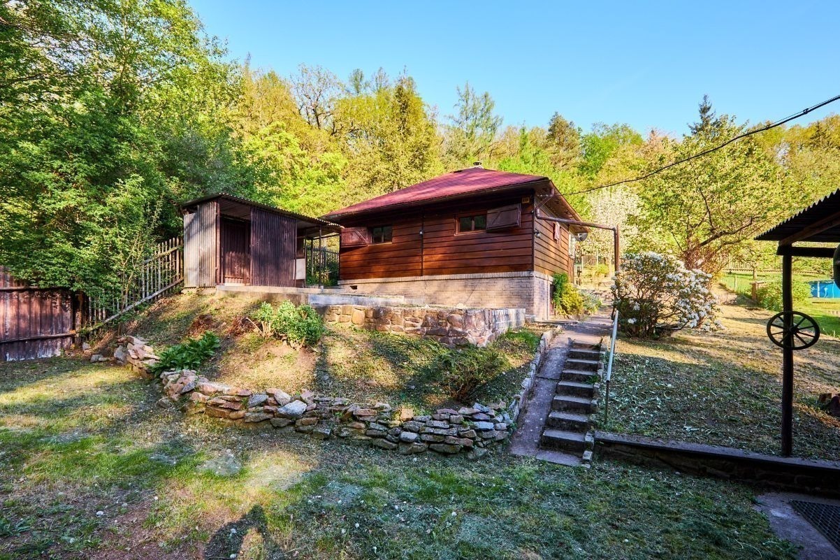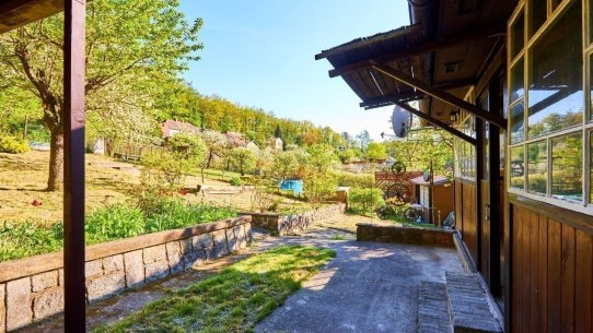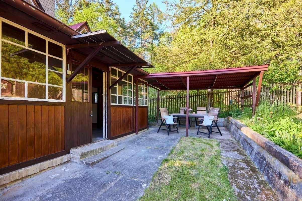 Na pozemku o velikosti 763 m² se rozkládá zahrada s pergolou a vzrostlými stromy. A protože je chata na samém konci chatové oblasti, budete tu mít naprostý klid. Osvěžit se můžete v potůčku, který teče pod chatou – a pokud toužíte po plnohodnotné koupačce, místa je tu dost i na bazén.