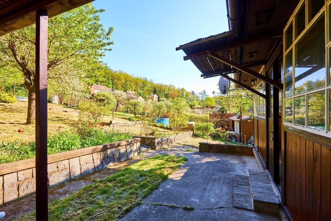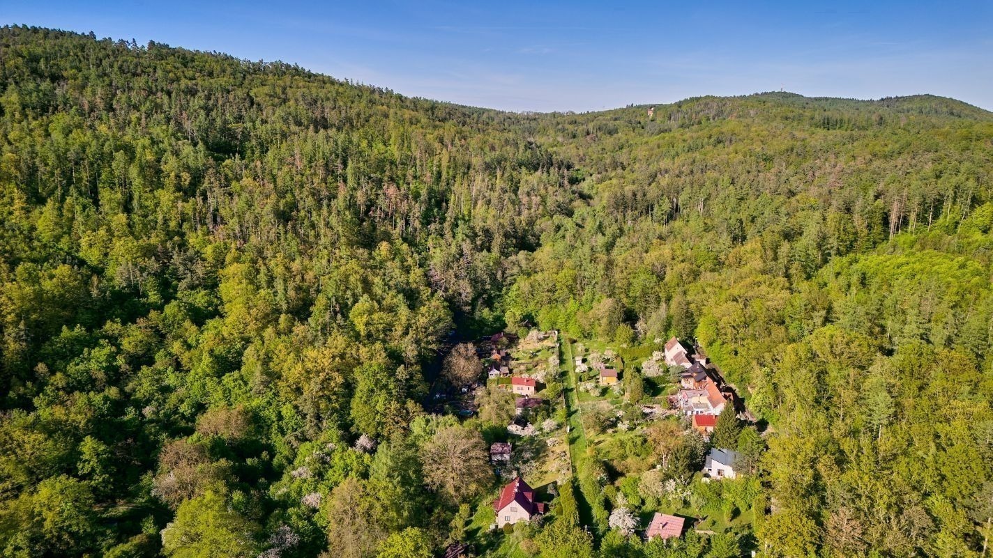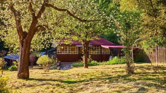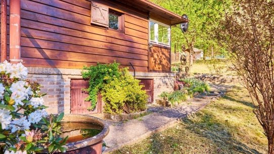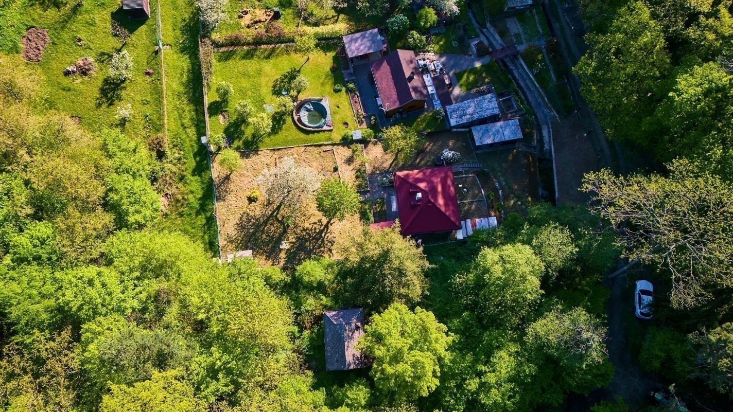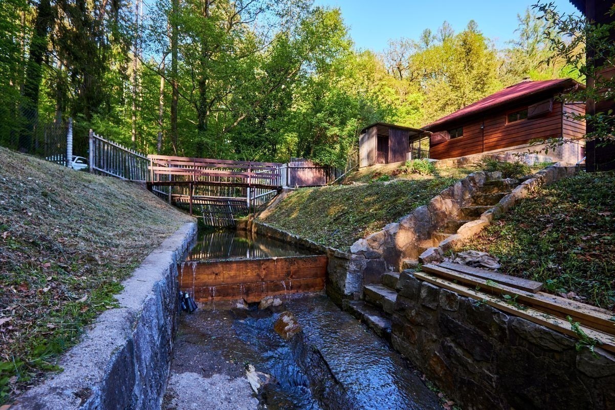 Na pozemku o velikosti 763 m² se rozkládá zahrada s pergolou a vzrostlými stromy. A protože je chata na samém konci chatové oblasti, budete tu mít naprostý klid. Osvěžit se můžete v potůčku, který teče pod chatou – a pokud toužíte po plnohodnotné koupačce, místa je tu dost i na bazén.