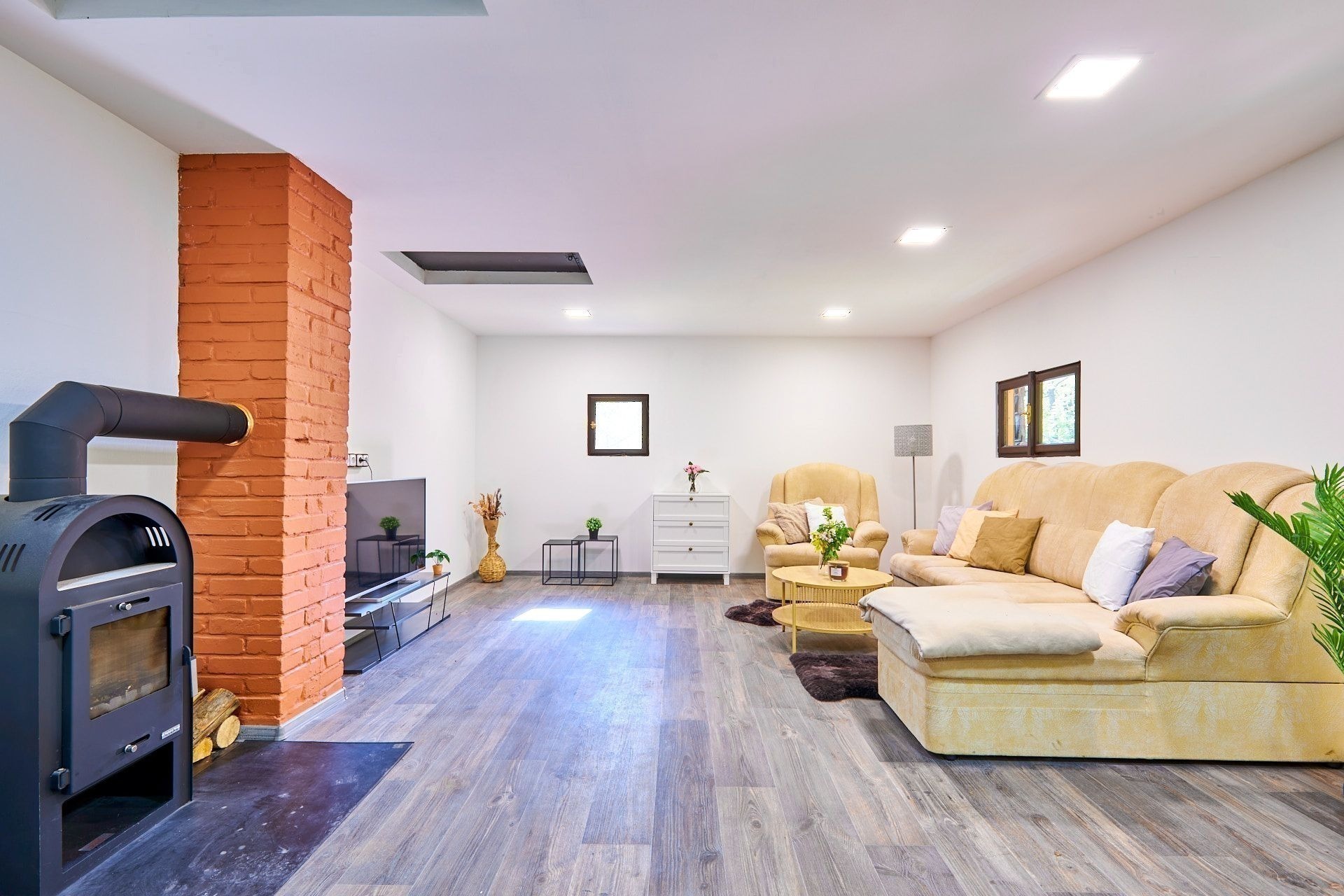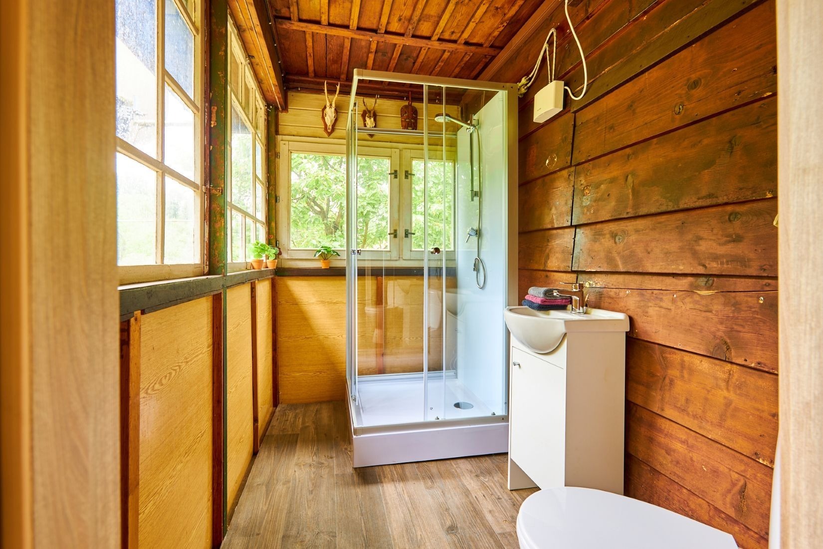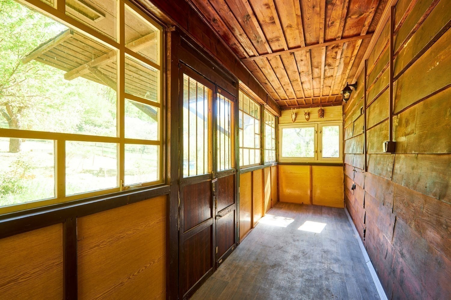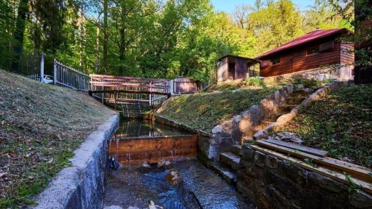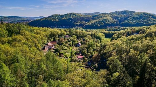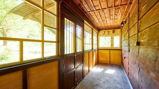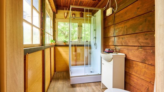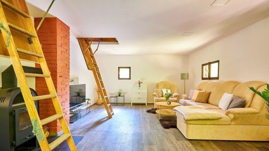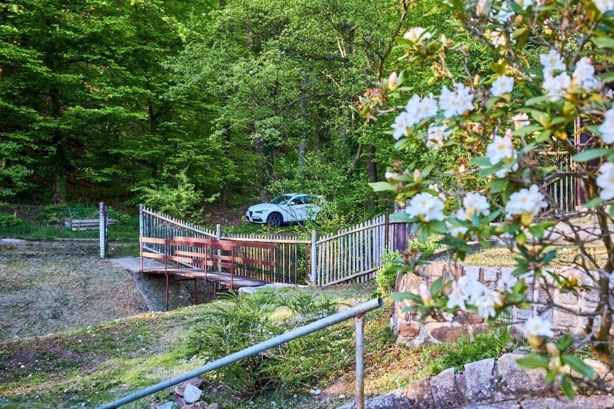Na pozemku o velikosti 763 m² se rozkládá zahrada s pergolou a vzrostlými stromy. A protože je chata na samém konci chatové oblasti, budete tu mít naprostý klid. Osvěžit se můžete v potůčku, který teče pod chatou – a pokud toužíte po plnohodnotné koupačce, místa je tu dost i na bazén.