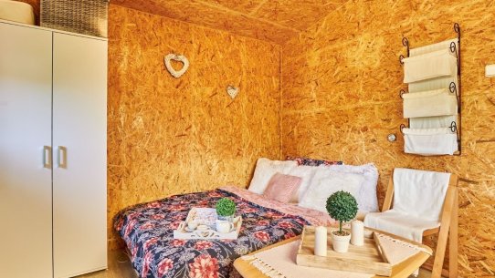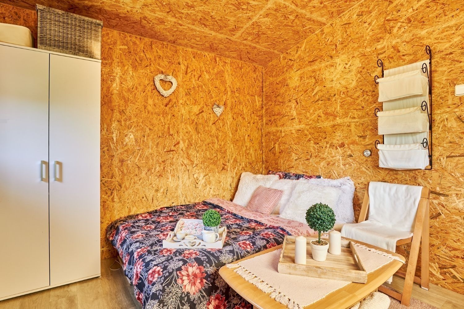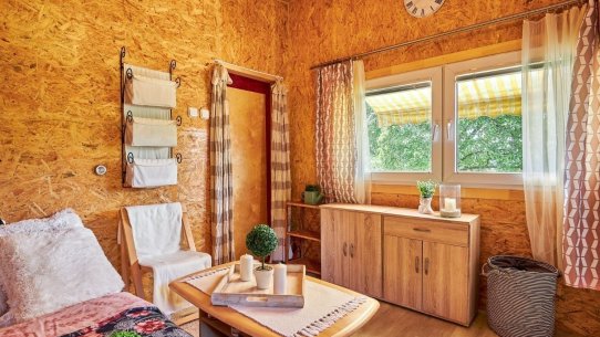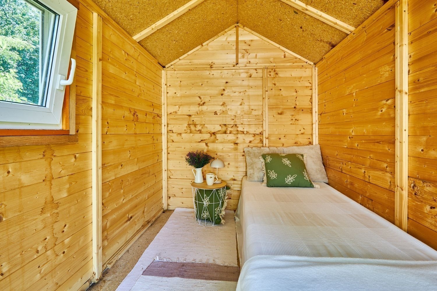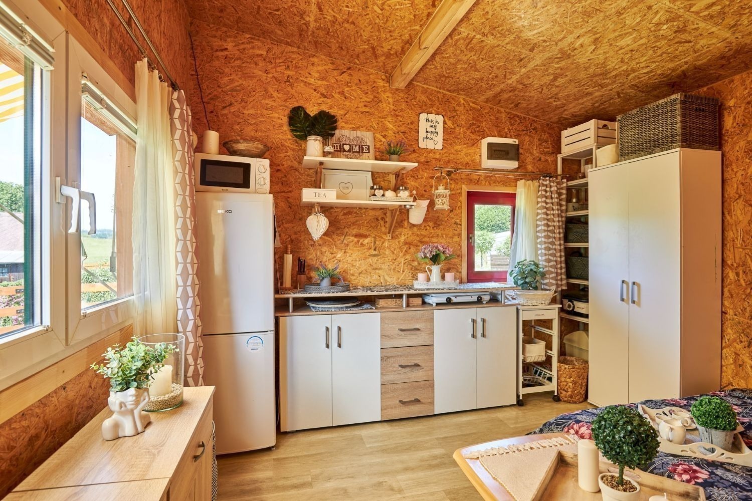 Srdcem celého místa je útulná dřevěná chatka. Uvnitř najdete praktickou kuchyňku a rozkládací gauč, na kterém si parádně odpočinete.