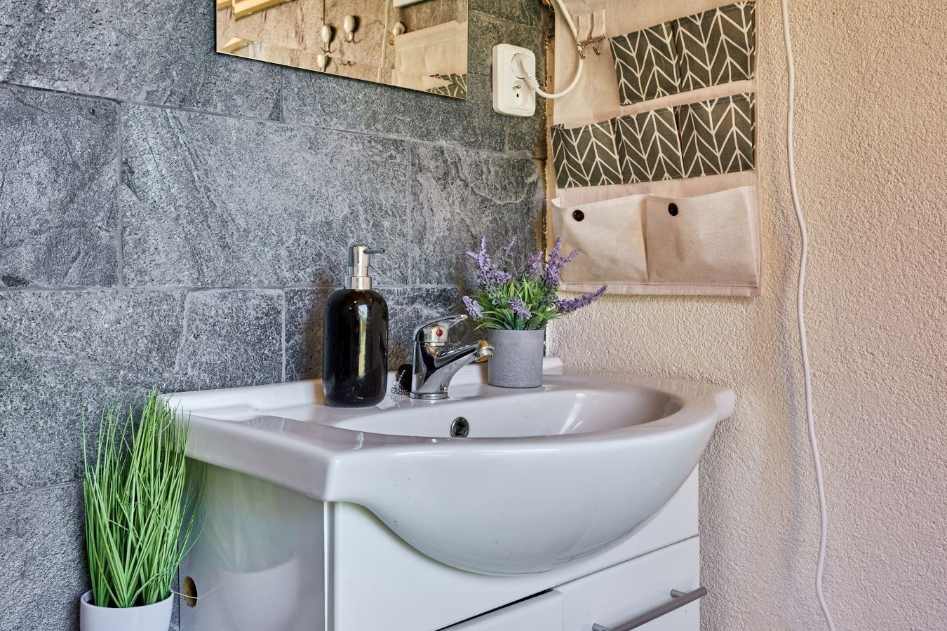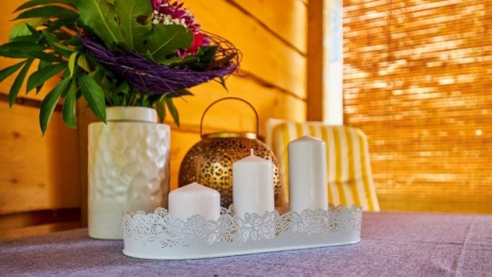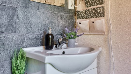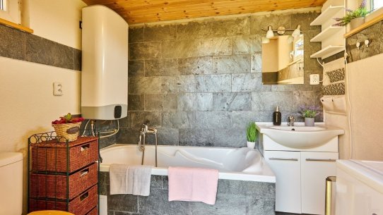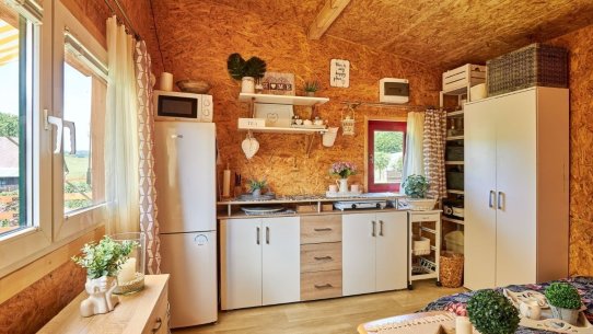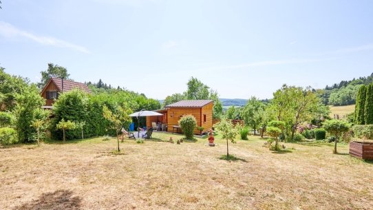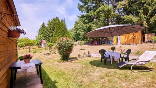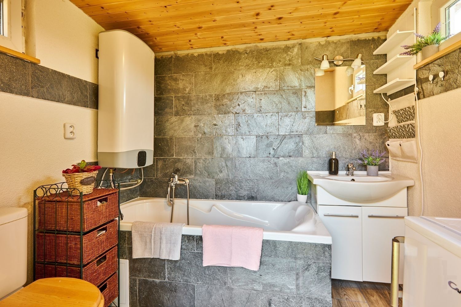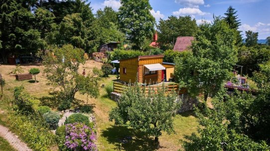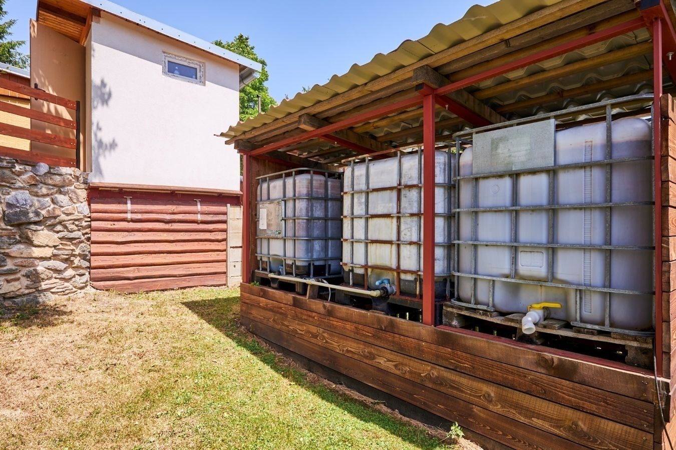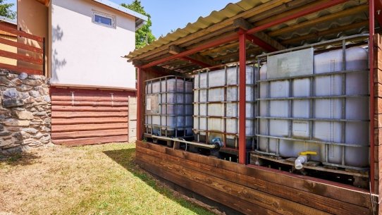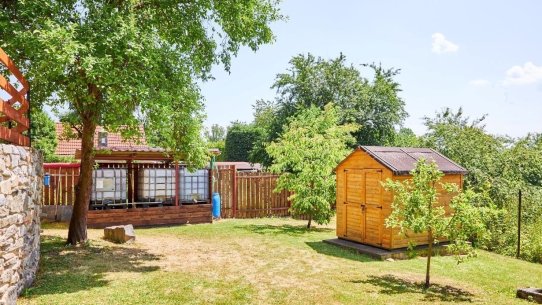 Návštěvu nebo hlasité spáče na noc uložíte do druhého dřevěného domku na pozemku. Po celém dni mezi záhonky si napustíte vanu v další samostatného stavbě, kde je taky umyvadlo a splachovací WC. Díky šikovnému systému sběru dešťové vody s čerpadlem a filtrem si užijete maximální komfort s minimálními náklady.