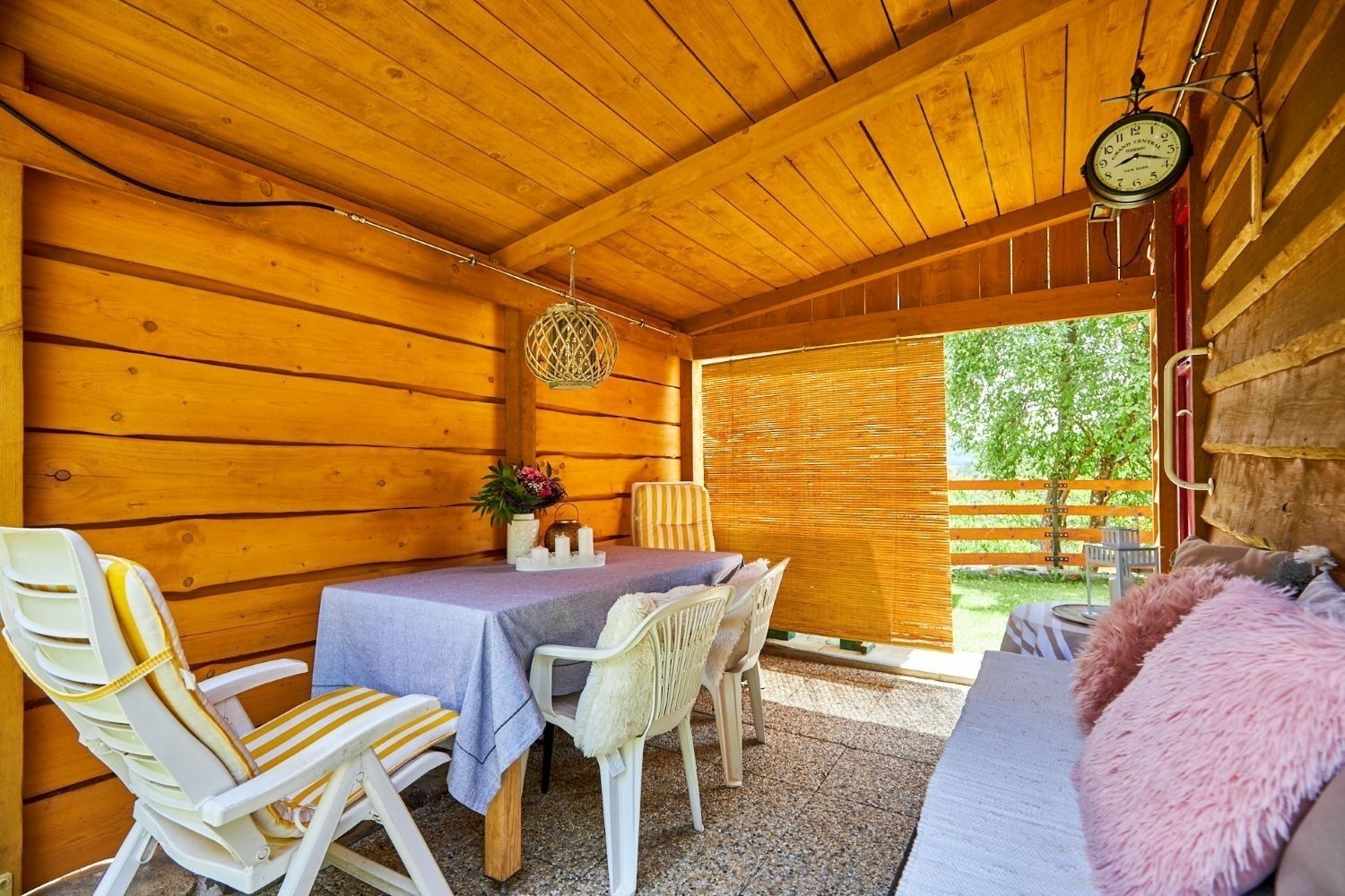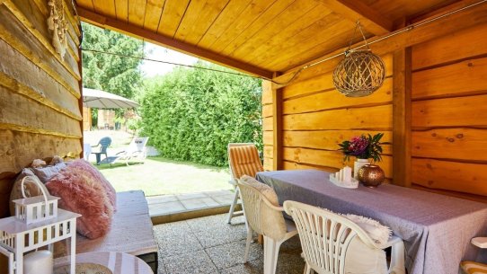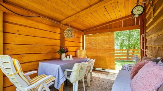 Před vstupem vás přivítá zastřešené posezení s možností využití mlhovacího systému – v parných letních dnech se tak příjemně ochladíte. A protože je chatka zateplená, můžete si sezónu protáhnout až do podzima.