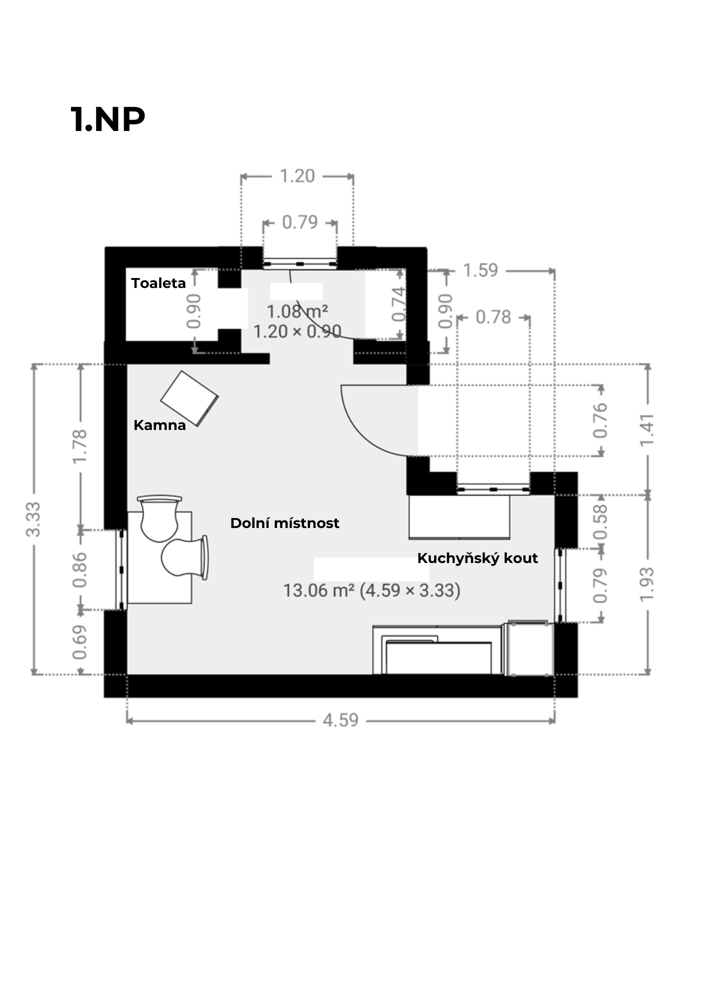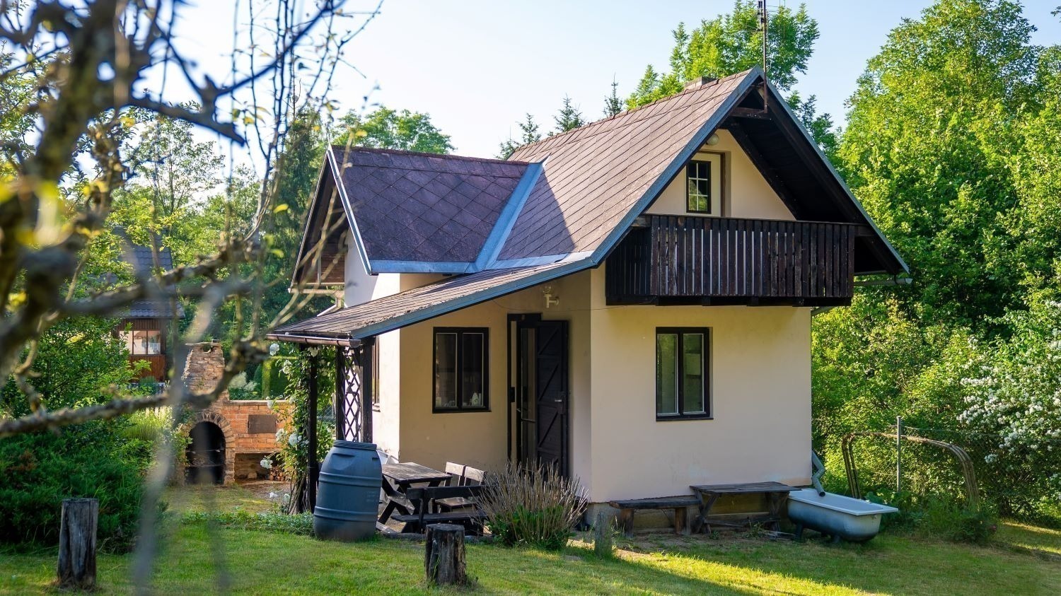 Chata má přízemí s výměrou 20 m² a obytné podkroví s balkonem o velikosti dalších 20 m². A k tomu je kompletně podsklepená – na ukládání jablek nebo basy s pivem budete mít místa dost.