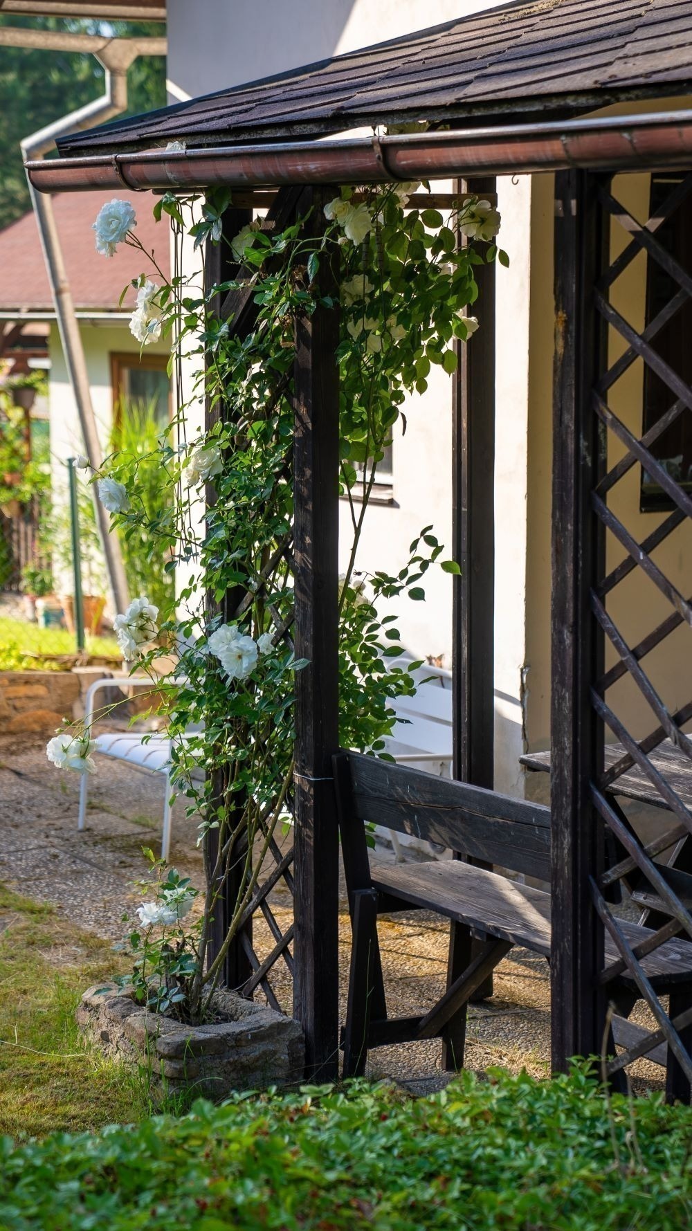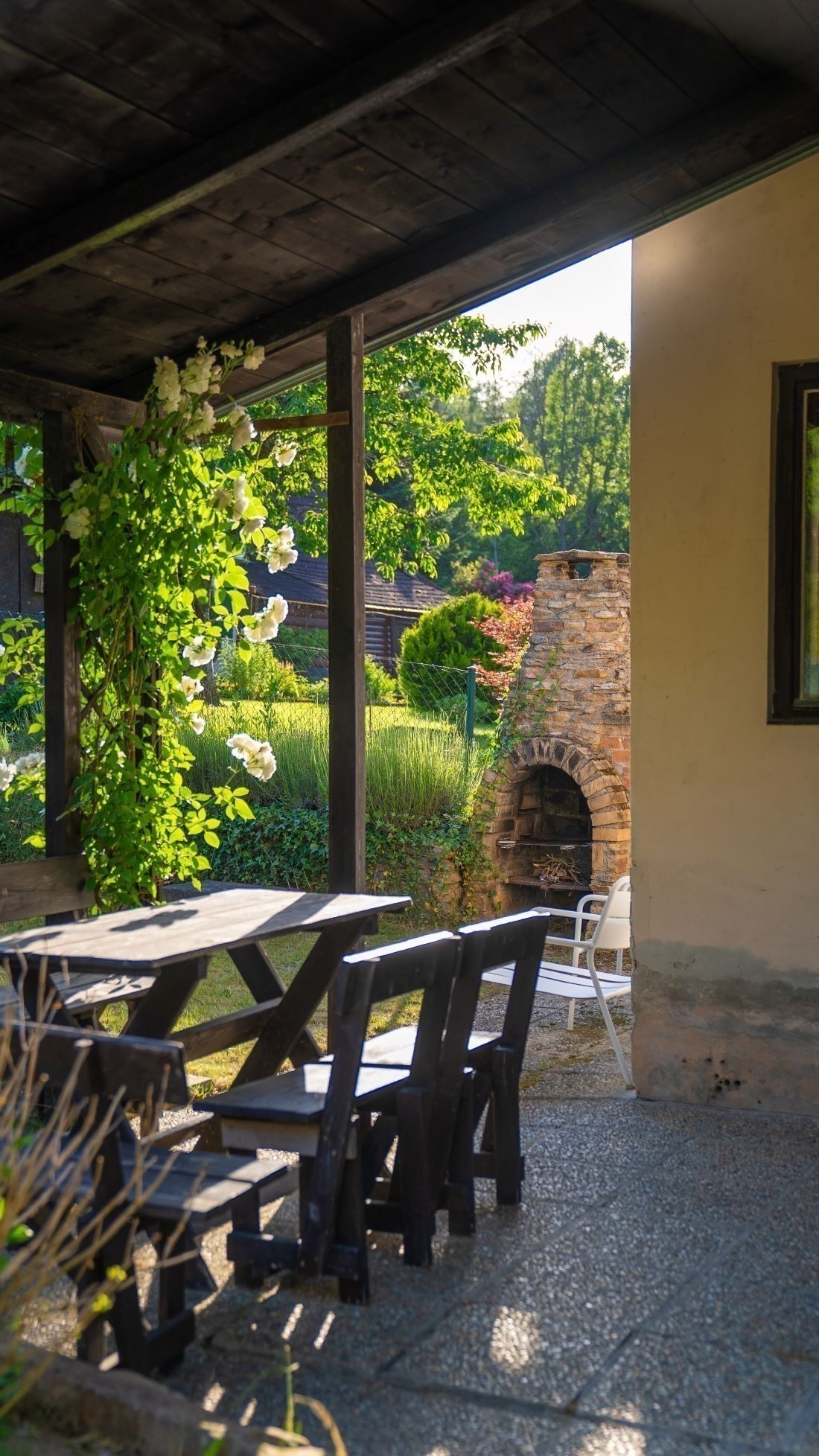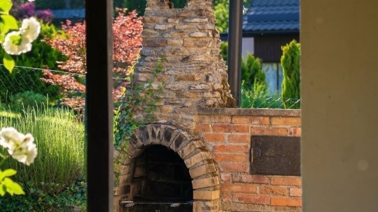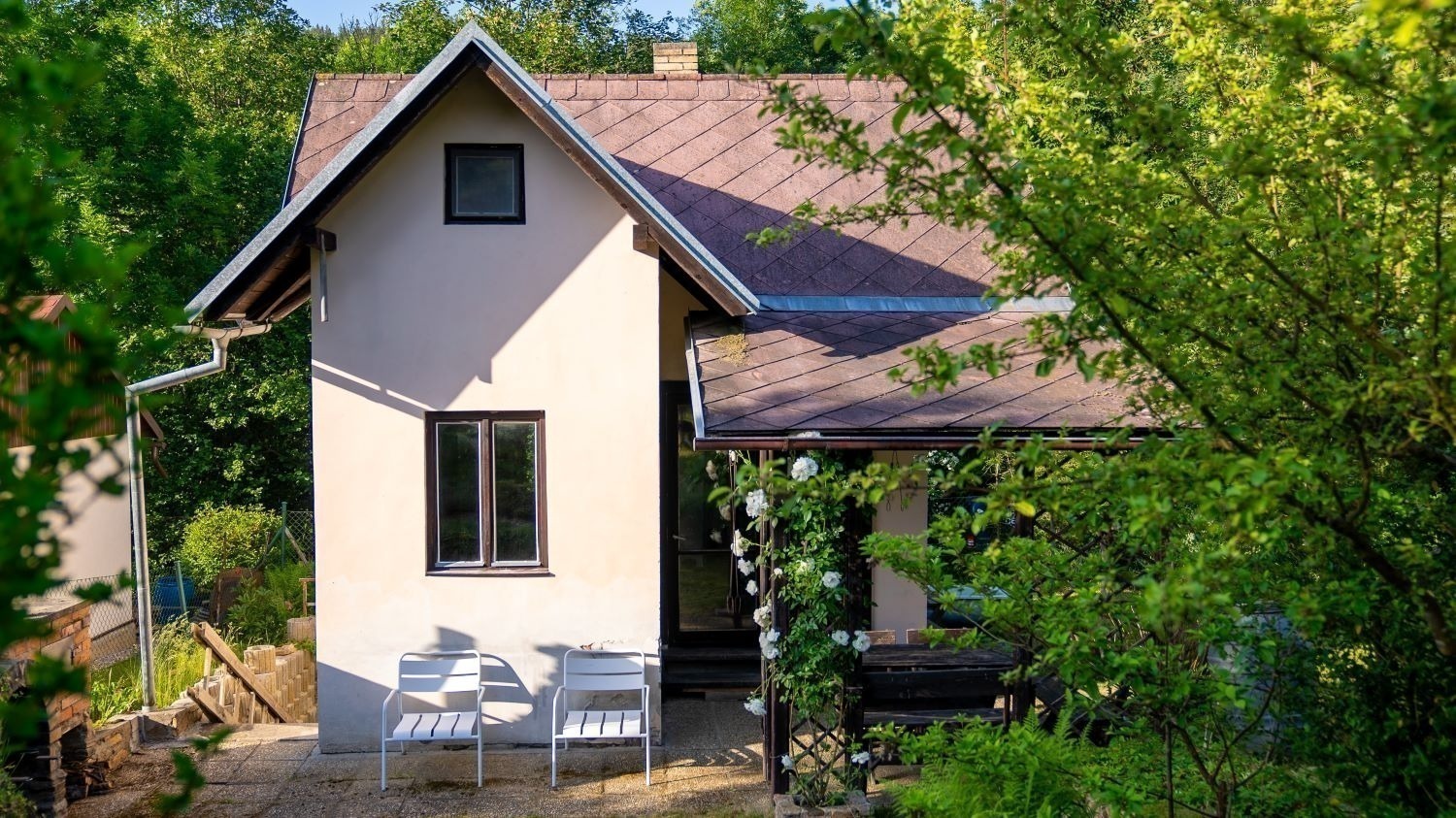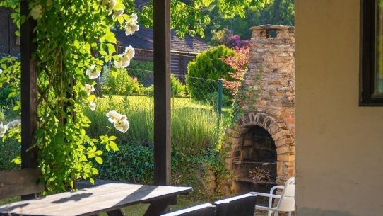 Chatka stojí na pozemku o velikosti 379 m² s ovocnými stromy a udržovanou zahrádkou. Místa tu budete mít dost na záhonky i bazén. Na chatku navazuje dlážděná krytá terasa, kde se schováte před deštěm i ostrým sluncem. A to nejlepší? Krásný venkovní krb s udírnou.