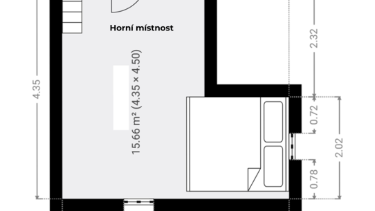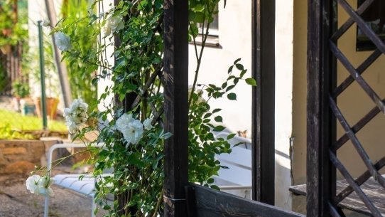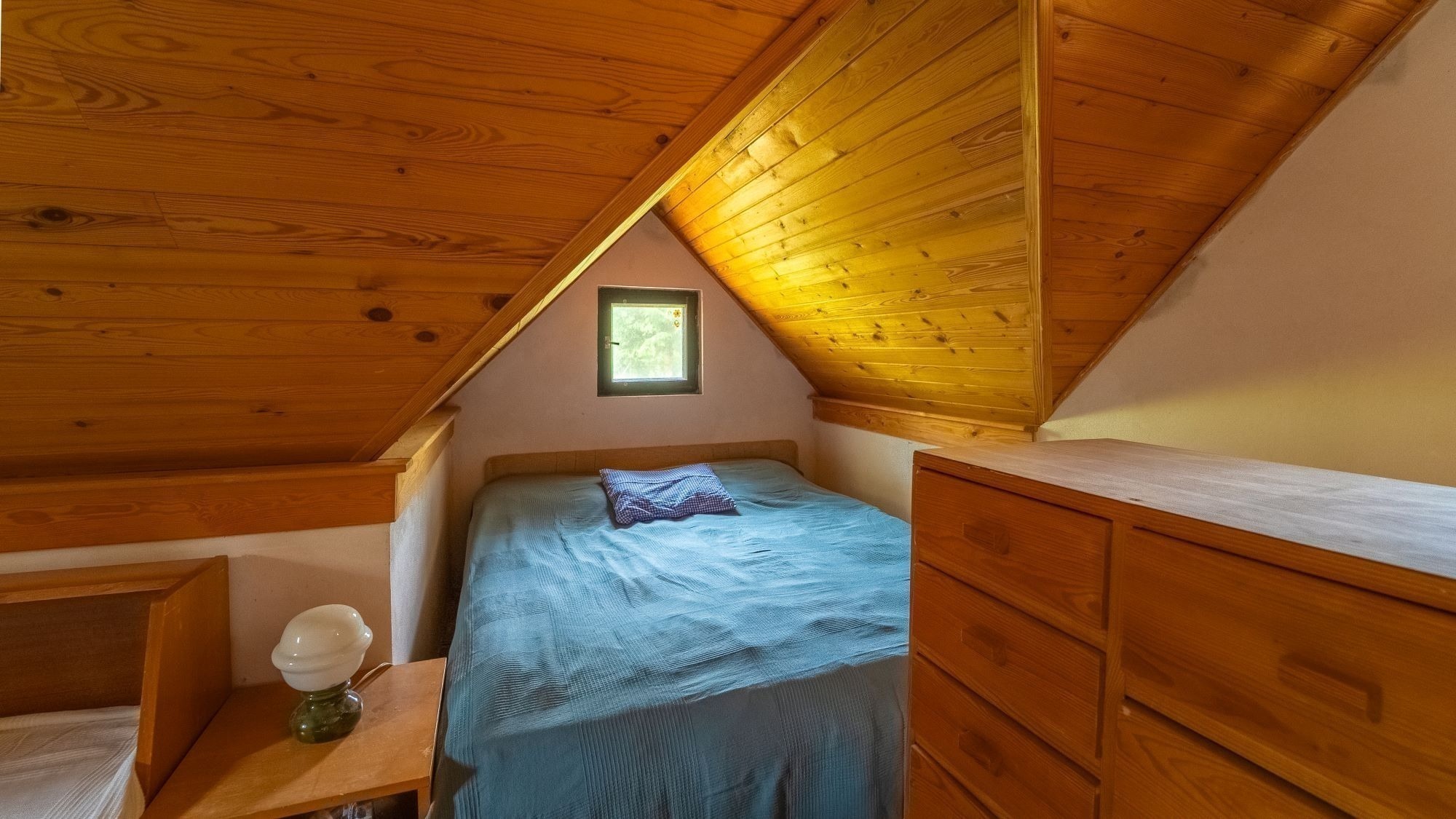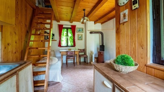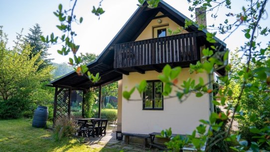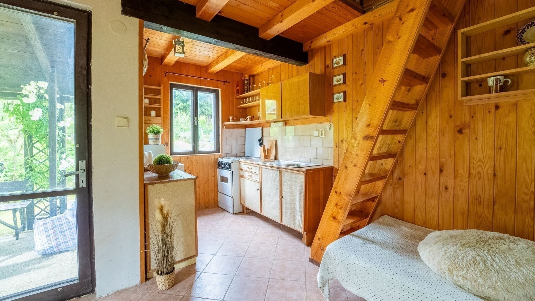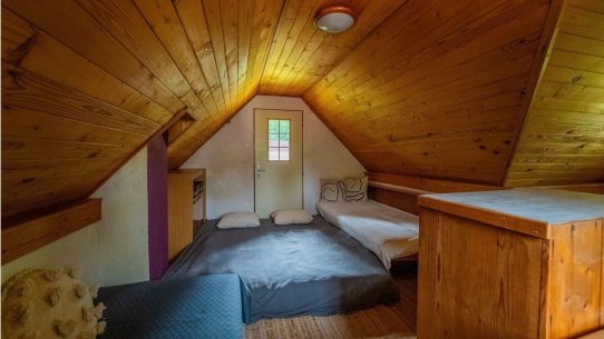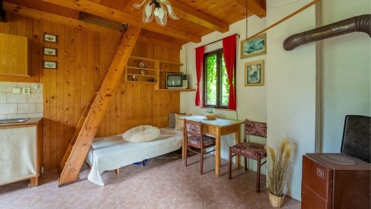 V přízemí je starší, ale funkční kuchyňka. Do patra, kde se pohodlně vyspí až 5 lidí, se dostanete po schůdcích. Nahoře na vás čeká balkon s výhledem do zahrady.