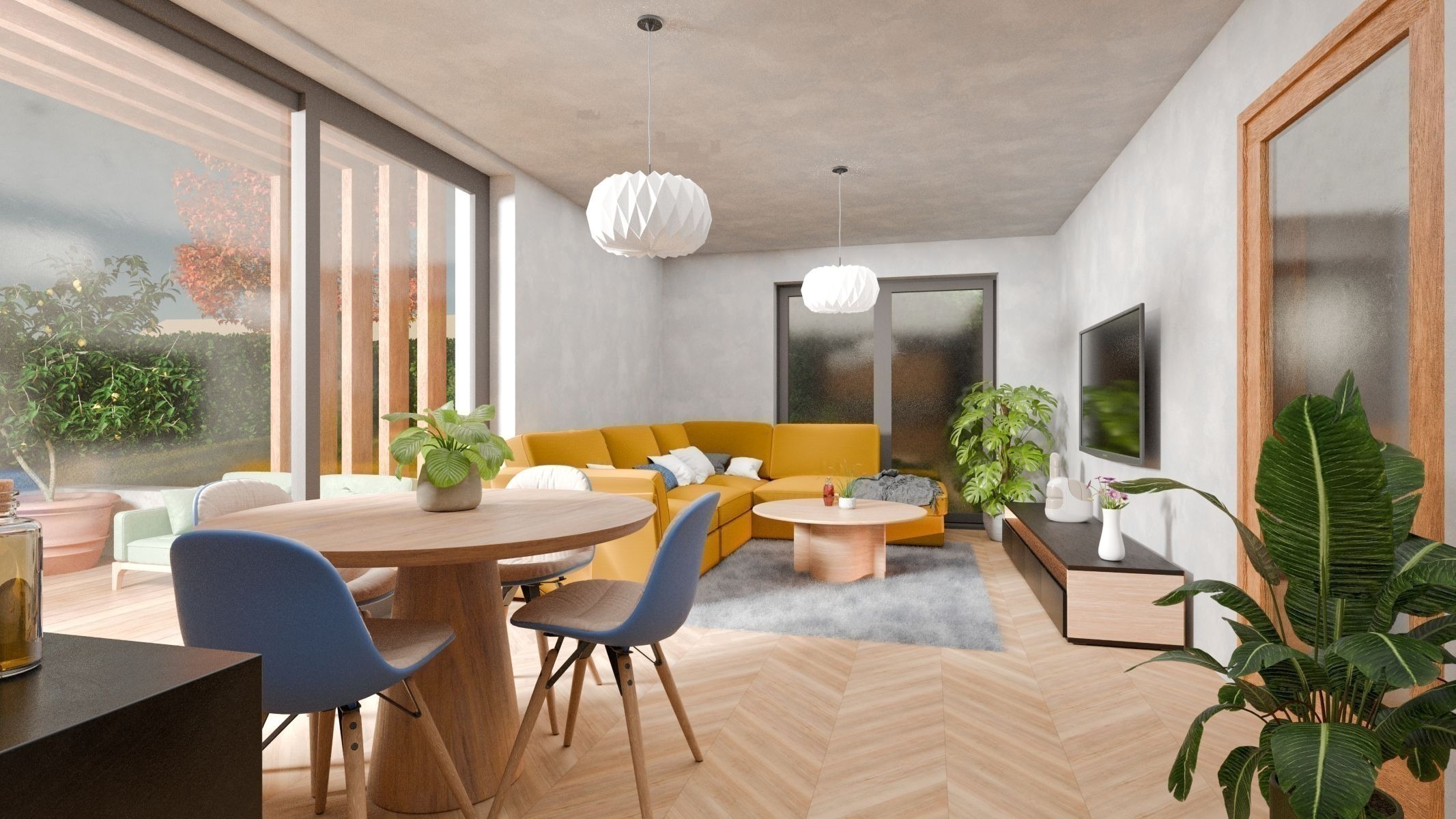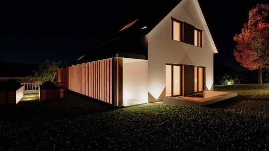 Na velkém pozemku bude stát zbrusu nový dvojdomek tvořený dvěma dvoupodlažními domy s dispozicí 5+kk a výměrou 180 m². V přízemí je obývák s kuchyní, pokoj a samostatná toaleta, v patře jsou tři ložnice a koupelna s WC.
