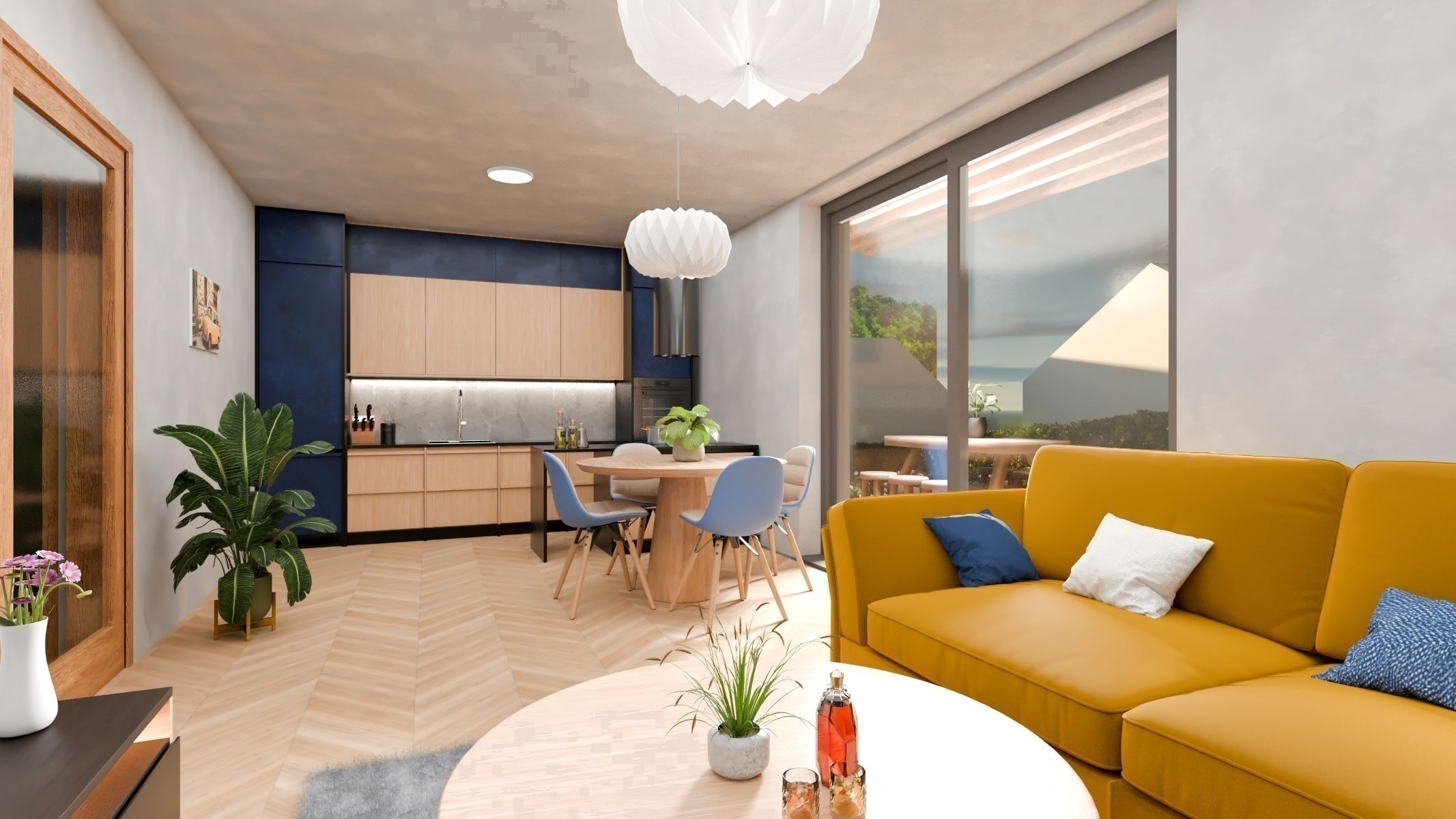 Prostorný obývák s kuchyní o velikosti skoro 29 m² si v létě ještě zvětšíte o celou venkovní atmosféru – stačí otevřít portál a vykročit na terasu. Ta má 18 m², je částečně zastíněná a budete z ní mít perfektní výhled do celé zahrady.
