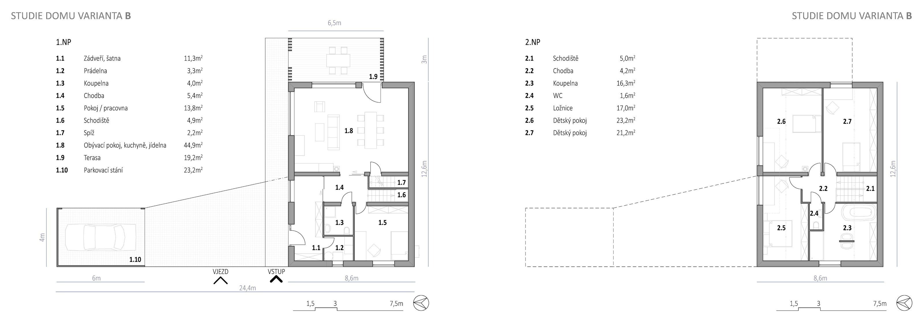 Domy jsou navrženy jako dvoupodlažní s výměrou 220 m² a dispozicí 5+kk. V přízemí bude obývací pokoj s kuchyní a jídelnou, ložnice, koupelna a prádelna. O patro výš tři ložnice a druhá koupelna.