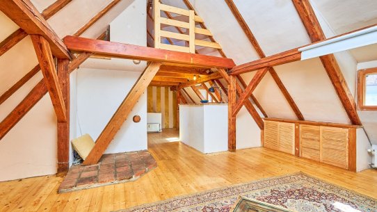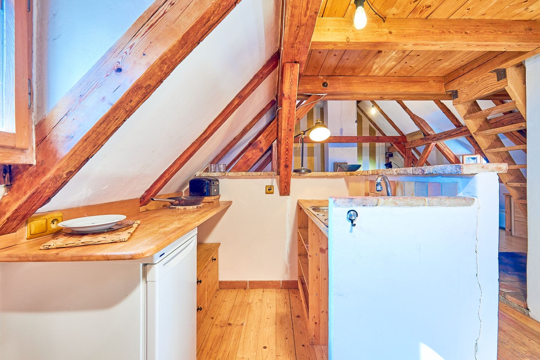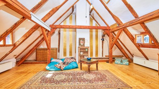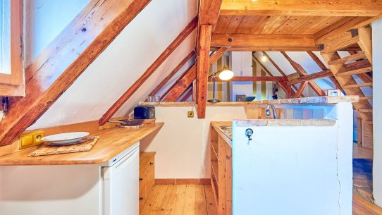 V horních patrech jsou dva apartmány s dispozicemi 2+kk a 2+1 a v podkroví je velké otevřené 1+kk s mezonetovou galerií, nádhernými odkrytými trámy a výhledem přímo na krumlovský zámek. Každý apartmán má kuchyňku a vlastní koupelnu.