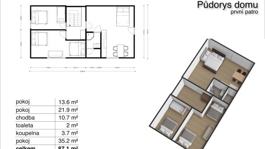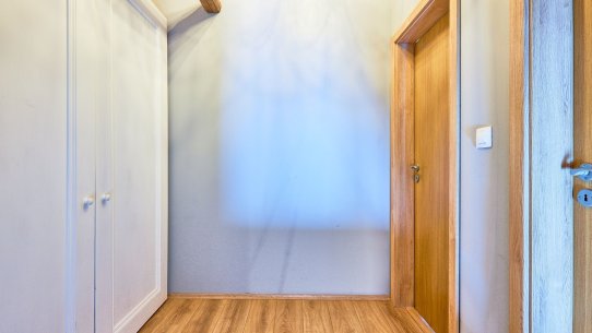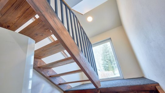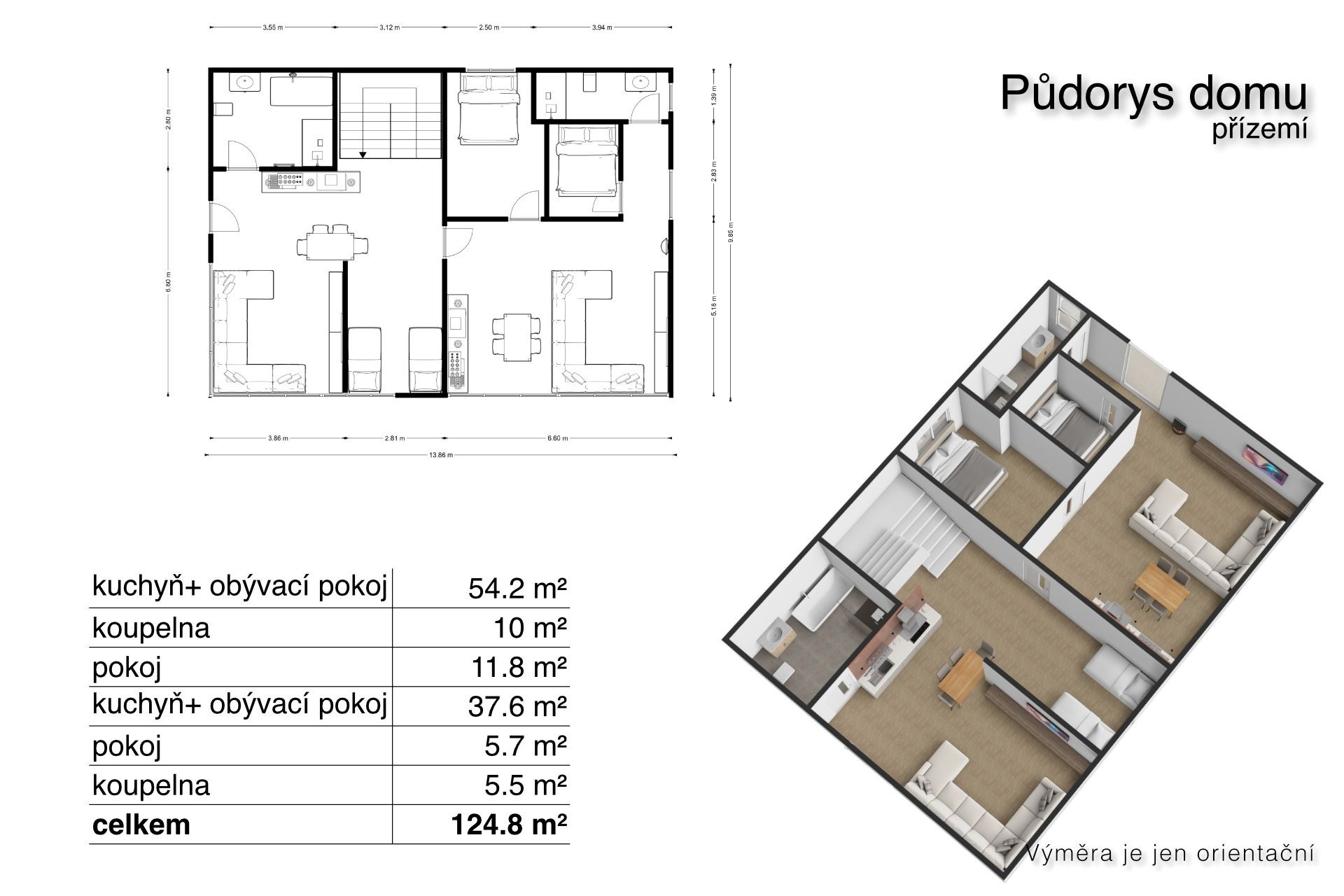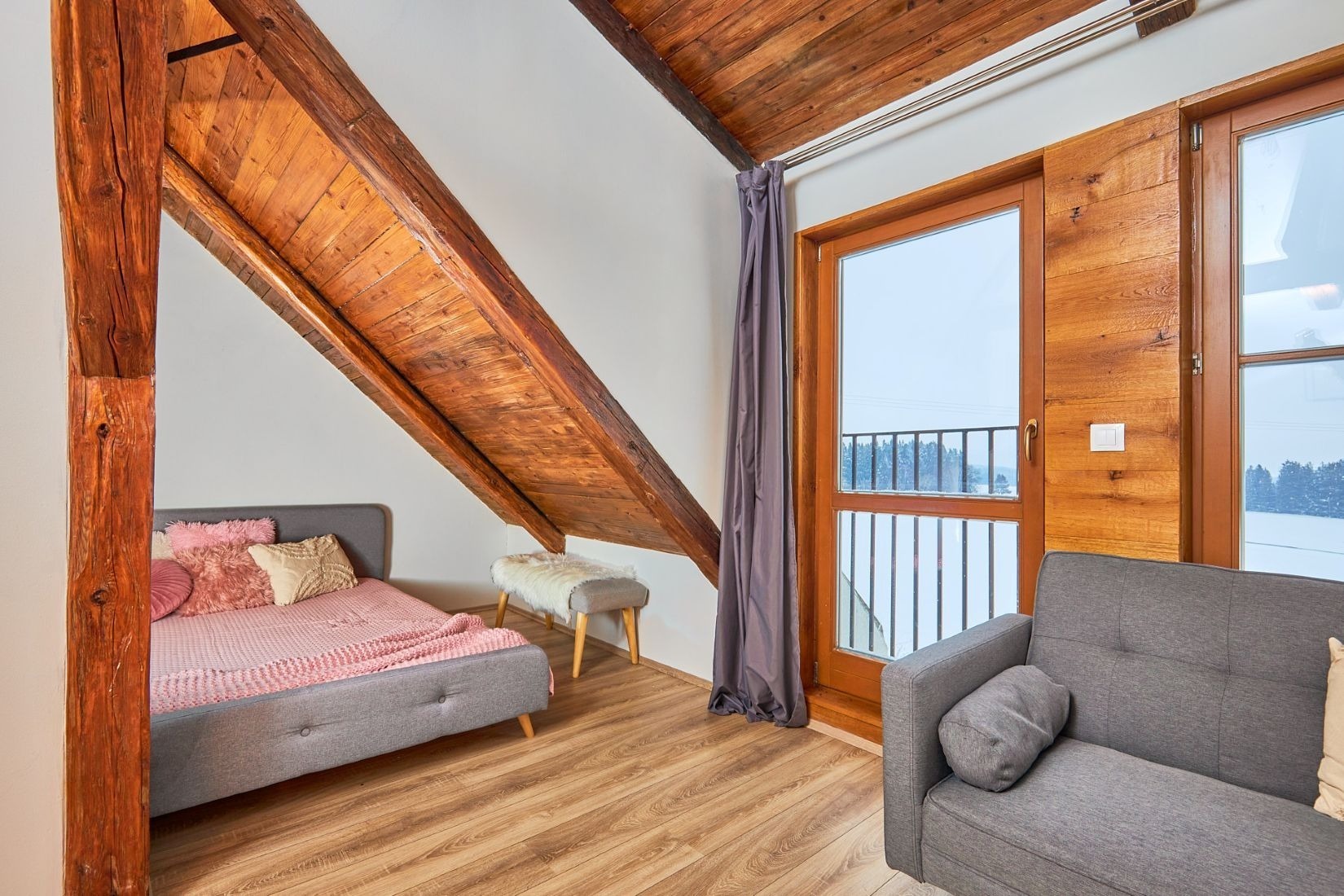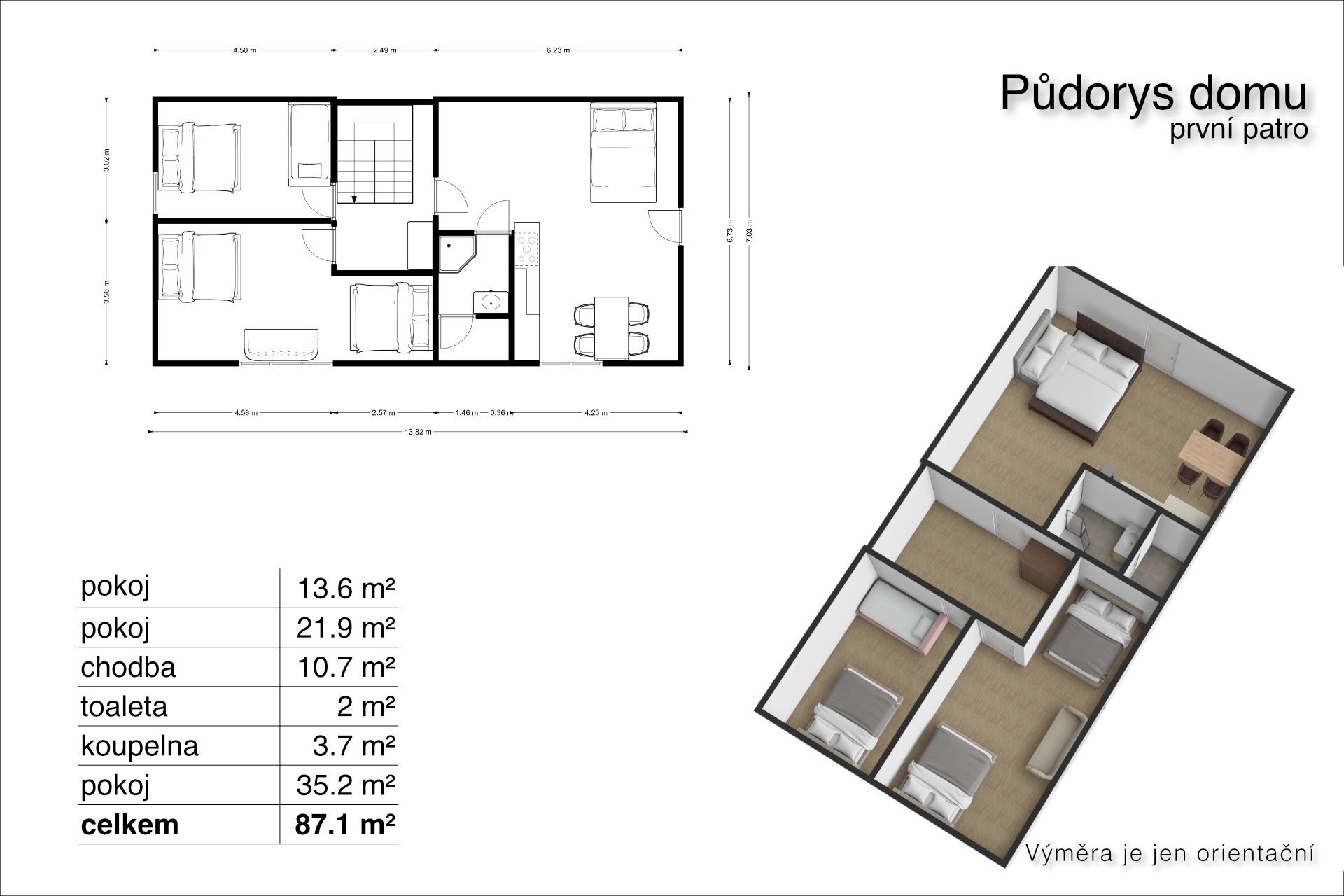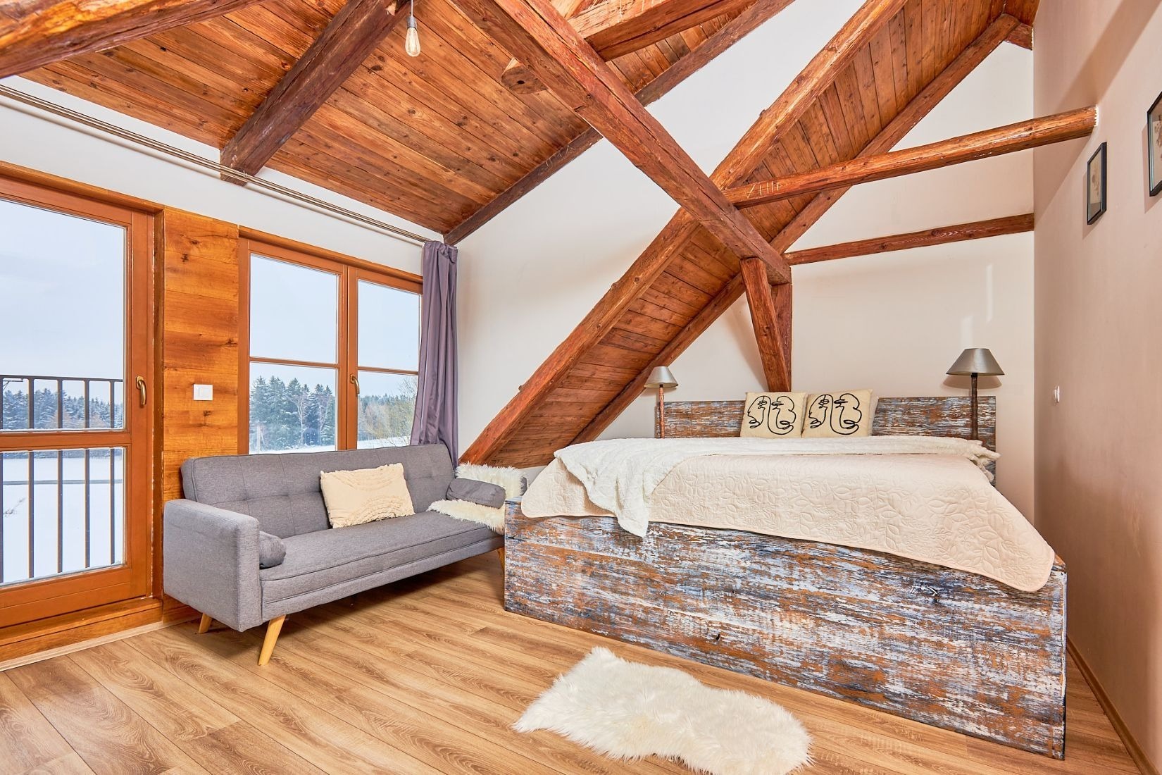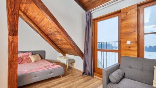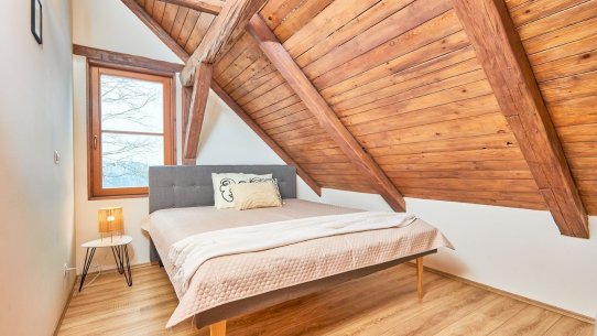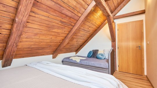 Podkrovní apartmán 1+kk je před dokončením a bude z něj útulné ubytování pro pár nebo menší rodinu. Kuchyňskou linkou a koupelnu si můžete dokončit přesně podle svých představ. Je přístupný po schodišti z přízemí a má také vstup po schodech přes terasu.