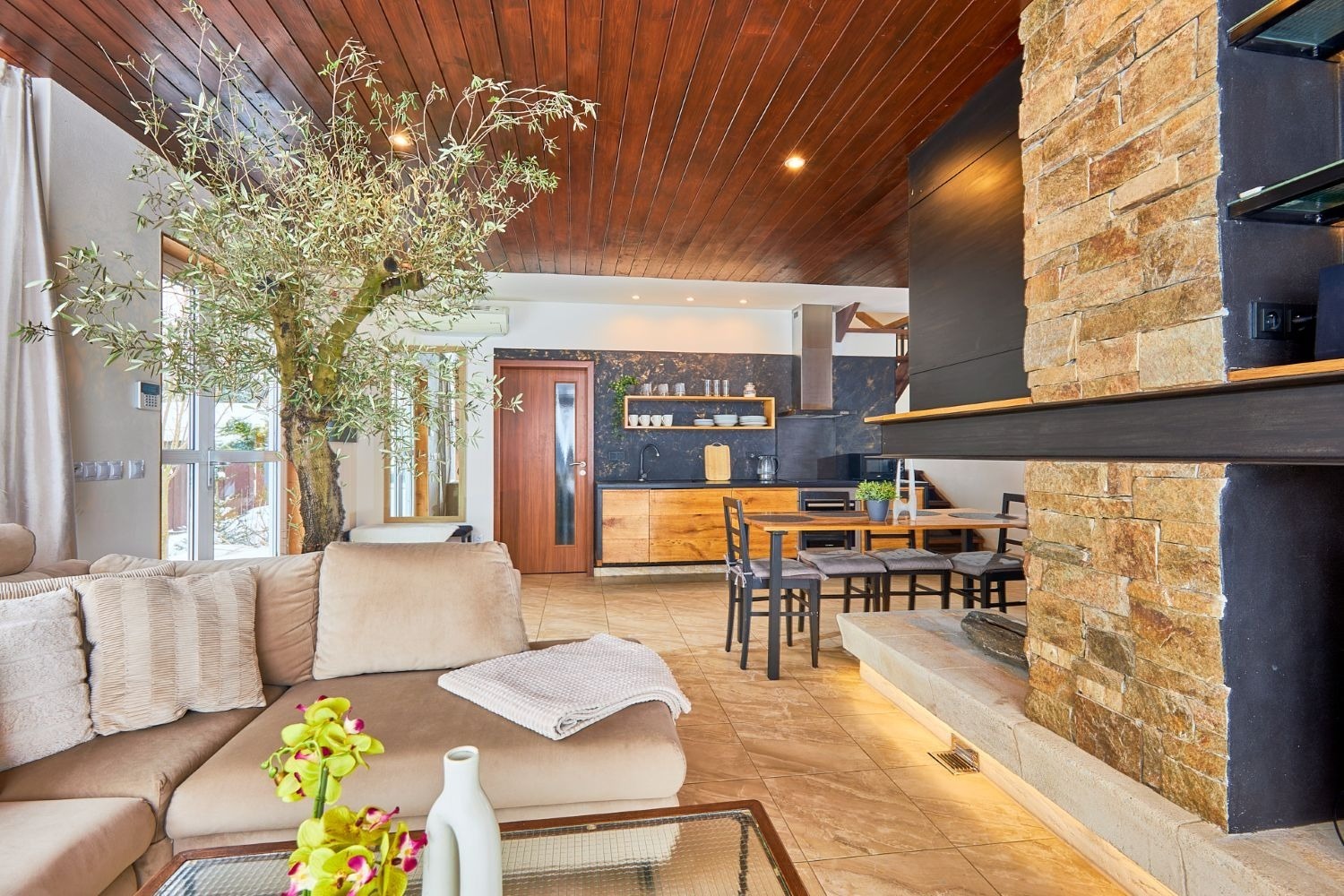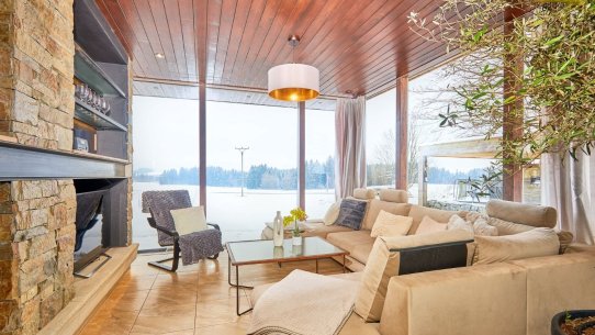 Druhý apartmán v přízemí tvoří ložnice, další menší pokoj, koupelna se sprchovým koutem a toaletou. V obývacím pokoji je zařízená kuchyně a posezení s krbem. Ani tady nechybí prosklená stěna s přístupem na terasu, která je od sousedů oddělená zídkou.
