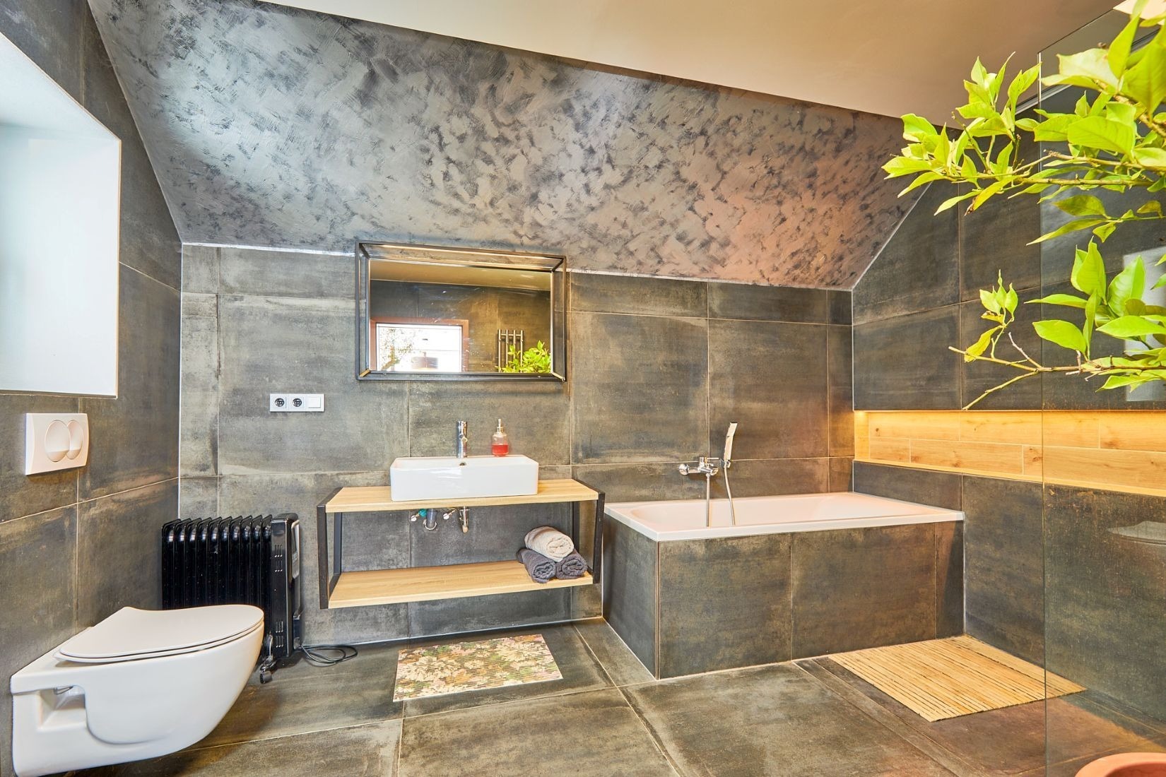 Jedinečnou atmosféru prostoru dodávají dvě stěny prosklené od podlahy po strop, které interiér propojují s přírodou. Ze dveří je to jen pár kroků k posezení pod pergolou. V přízemí je také koupelna s vanou a WC.