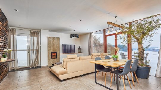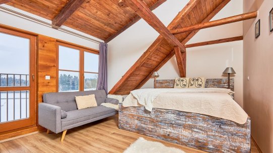 Největší apartmán se rozkládá ve dvou patrech. Obývací pokoj s vybavenou kuchyní má výměru 54 m² a dělí ho stěna, za kterou je místo na spaní pro dvě osoby. Dalších 7 osob se vyspí ve dvou ložnicích v patře.