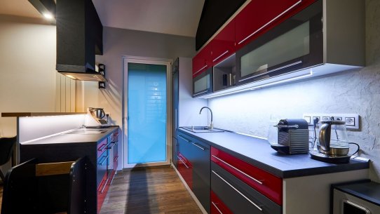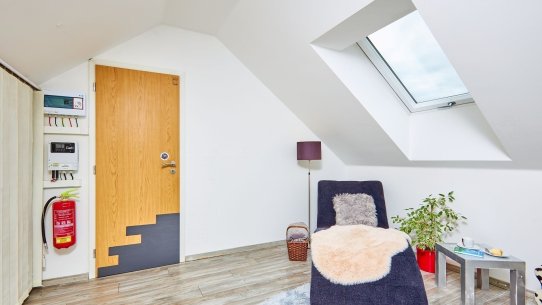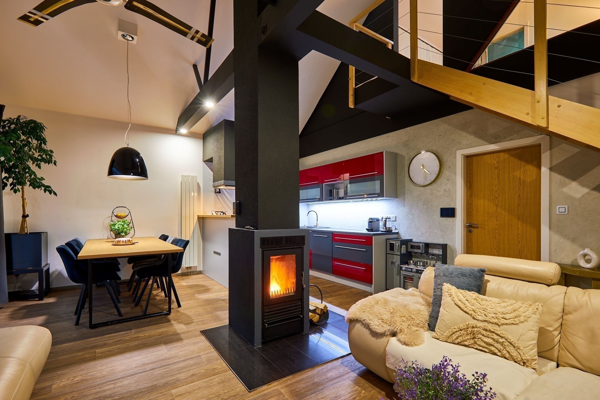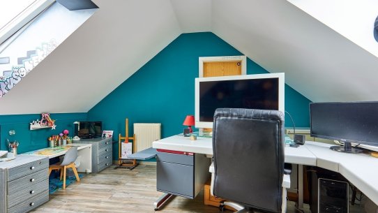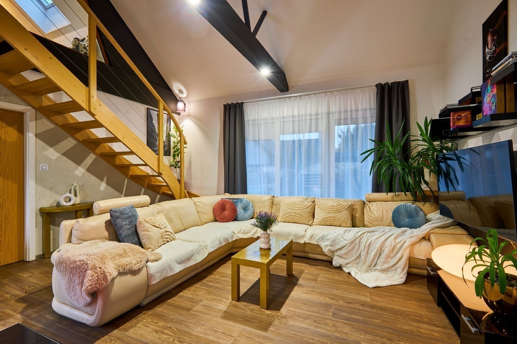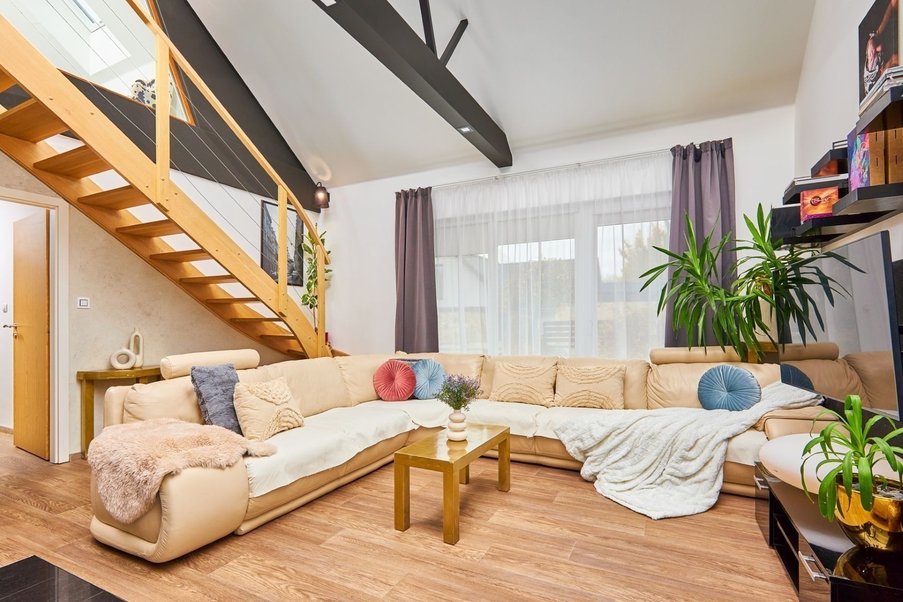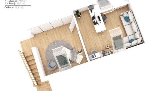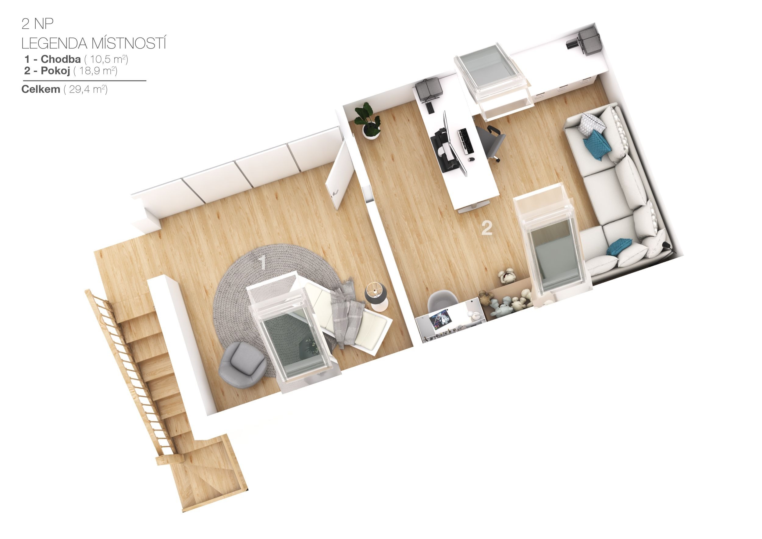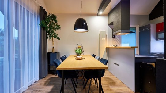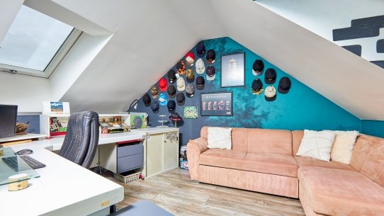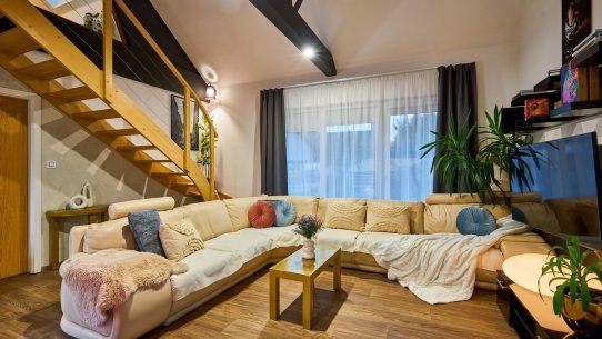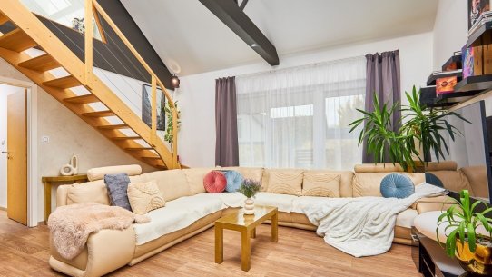 Dominantou domu je světlý obývací pokoj otevřený do krovu, díky čemuž působí prostorně, svěže a velmi moderně. Schodiště zde vede do otevřené pracovny, která se dívá přímo do obývacího prostoru. Je to ideální místo pro home office, klidné studium nebo knihovnu, kde se budete cítit nerušeně, ale stále propojeni s centrem dění v domě.