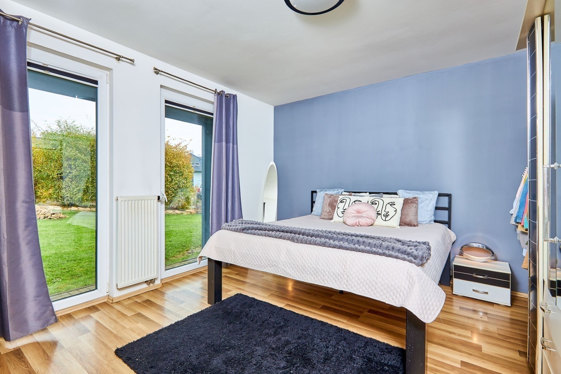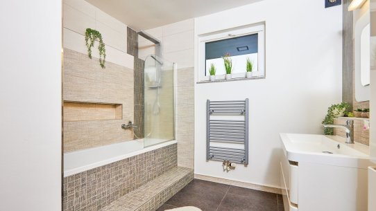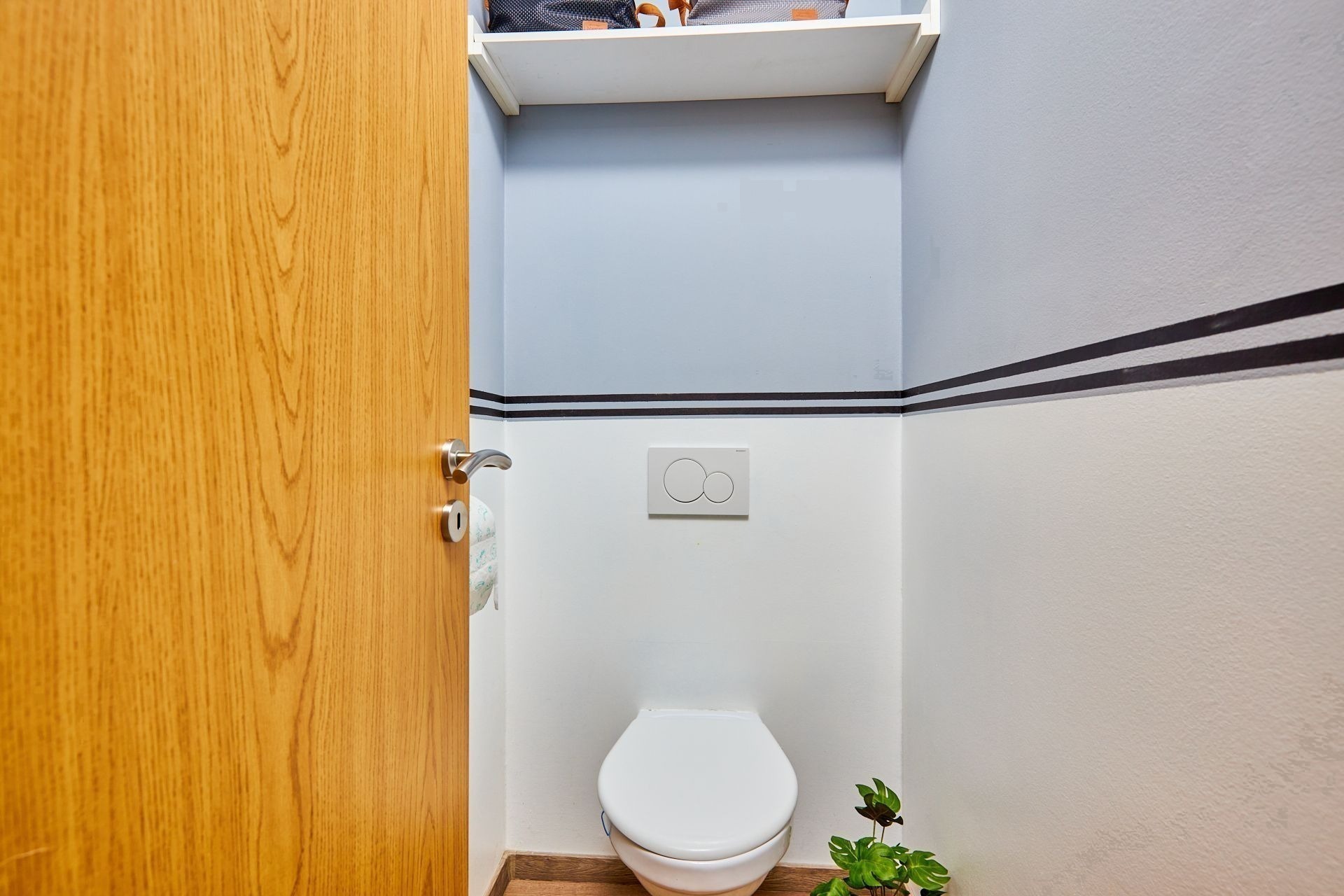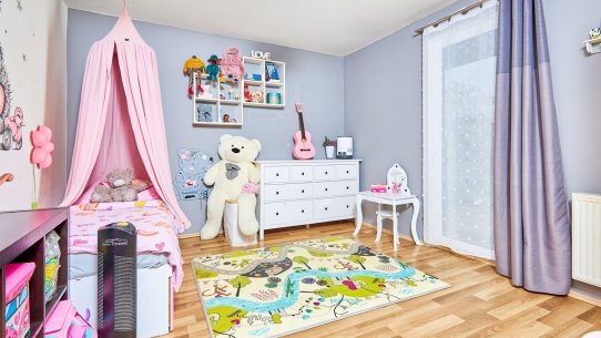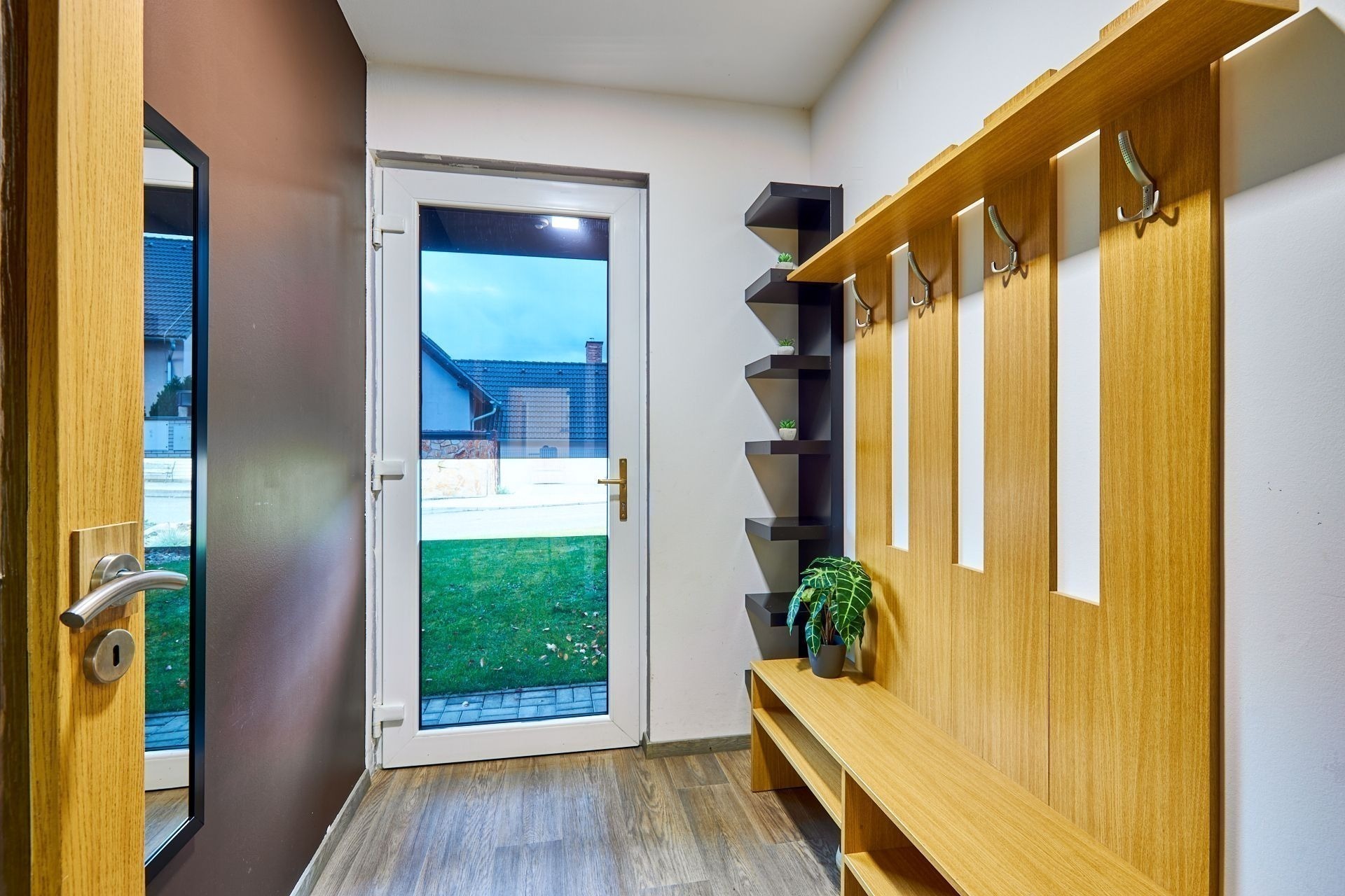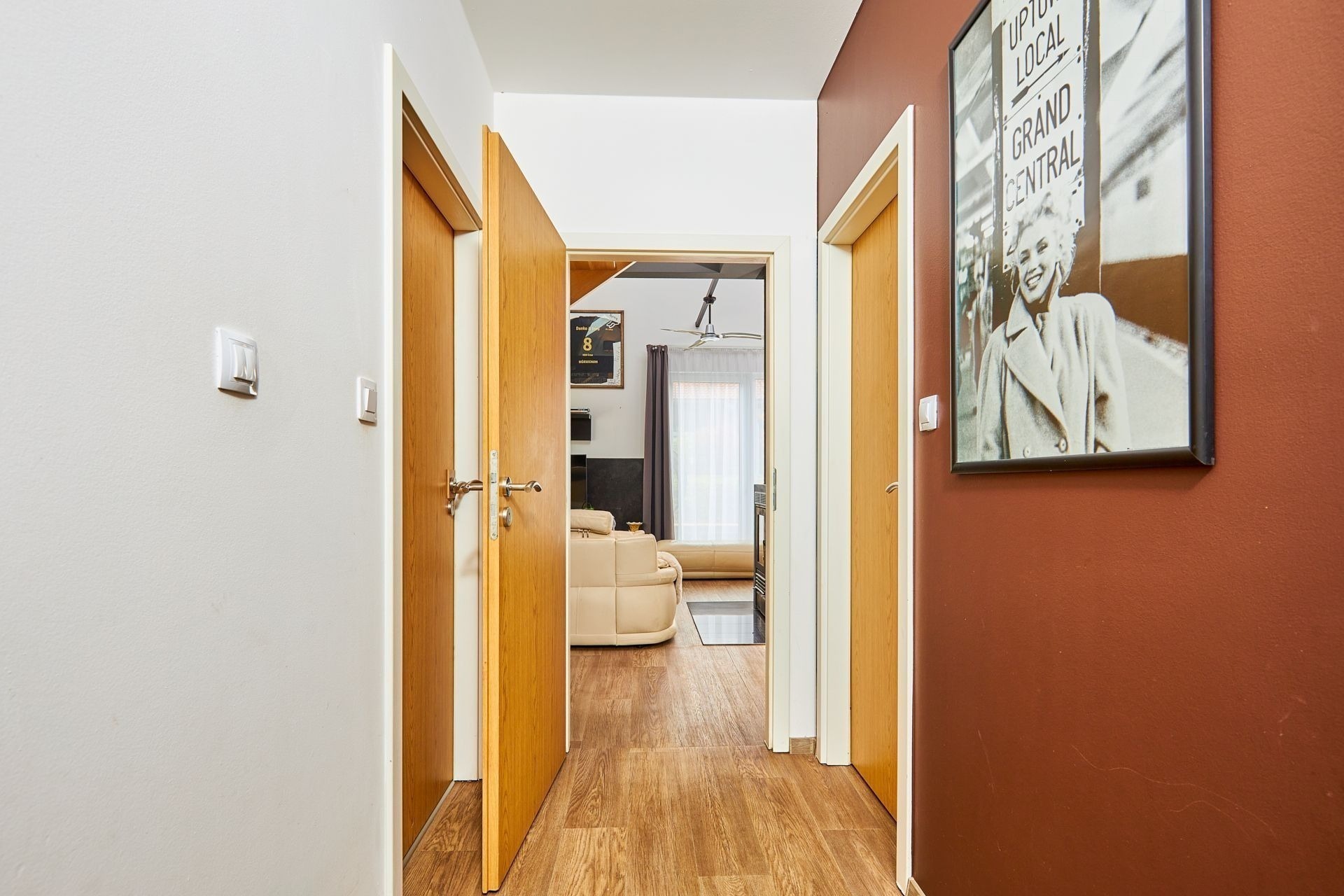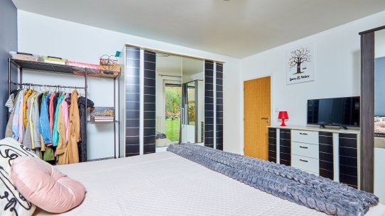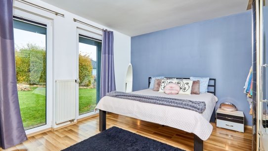 V přízemí najdete ložnici a dětský pokoj, oba s přímým vstupem na zahradu. Ranní káva na trávě? Děti běžící rovnou ven? Tady je to realita. K tomu nechybí ani koupelna a praktická spíž u kuchyně.