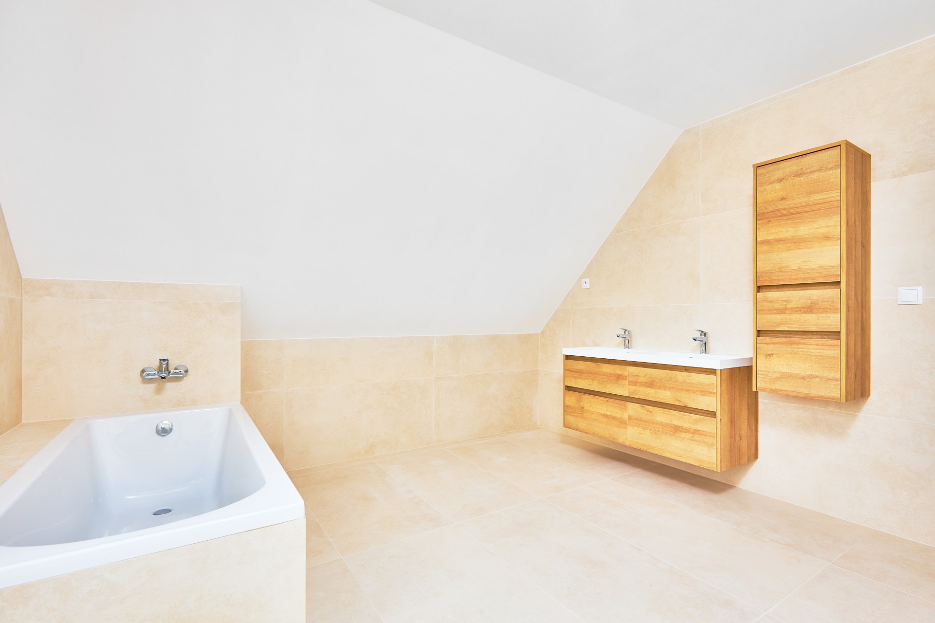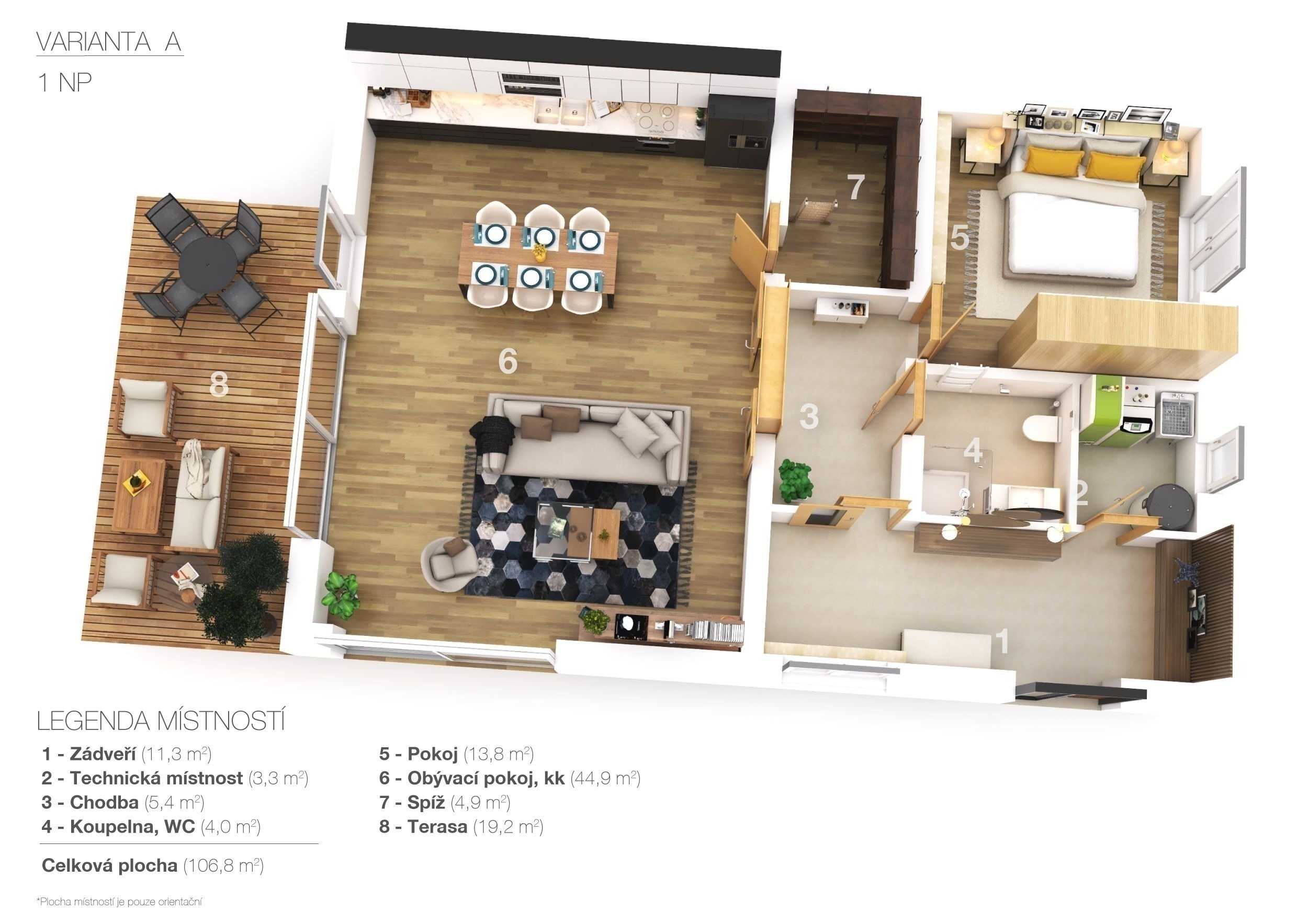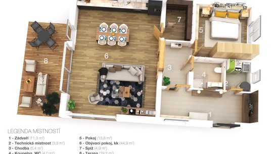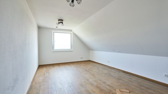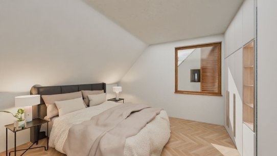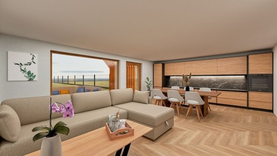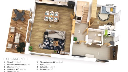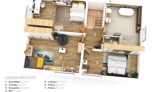 Domy jsou navrženy s důrazem na pohodlí i praktičnost. Dvoupodlažní dispozice 5+kk o velikosti 220 m² zahrnuje v přízemí prostorný obývací pokoj propojený s kuchyní a jídelnou, ložnici, koupelnu a prádelnu. V patře pak najdete tři ložnice a druhou koupelnu, ideální pro větší rodinu. Pokud si ale zatím vystačíte ve dvou, lze dům dokončit jako 2+kk s půdním prostorem připraveným na budoucí dostavbu dalších pokojů.