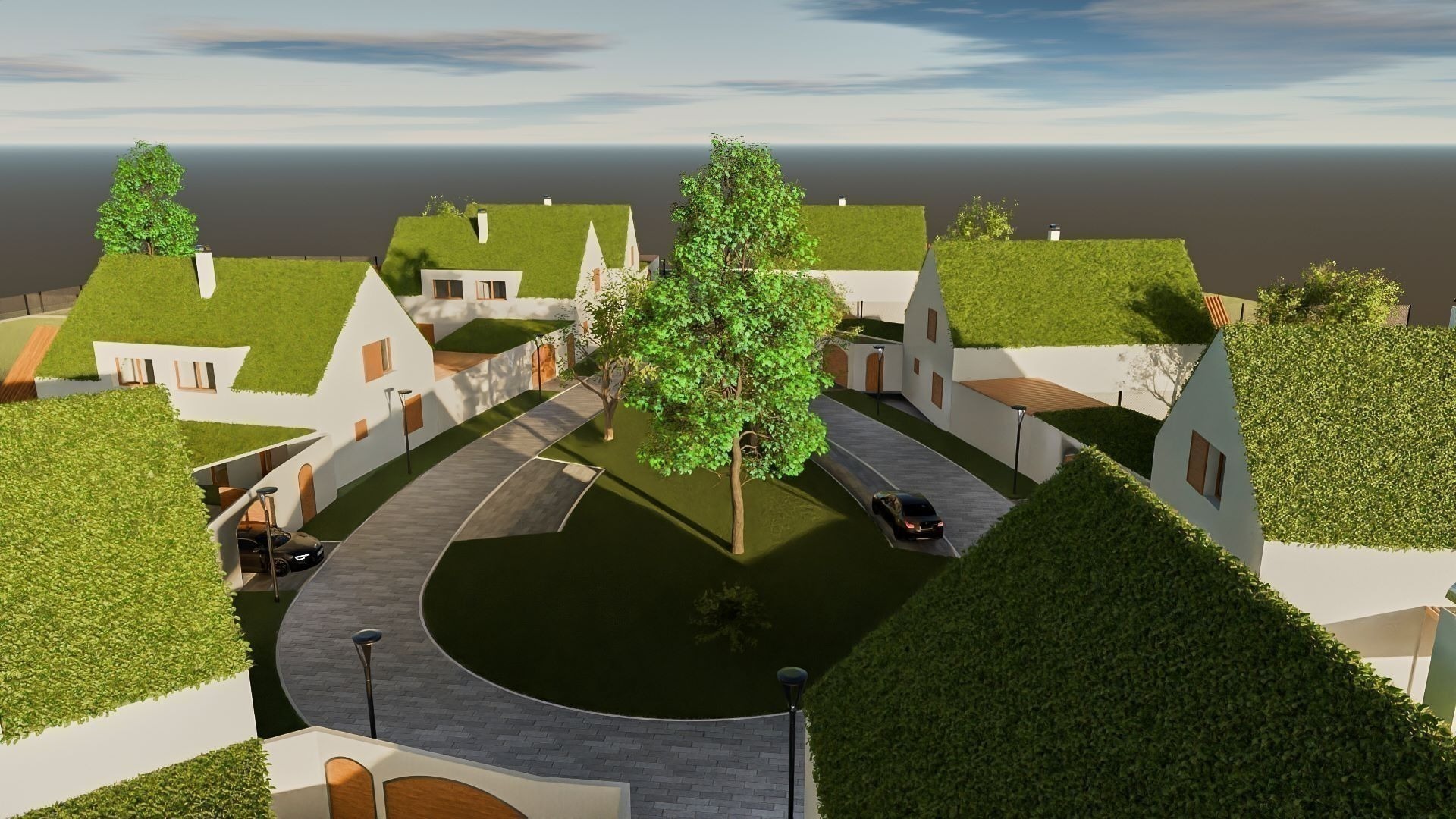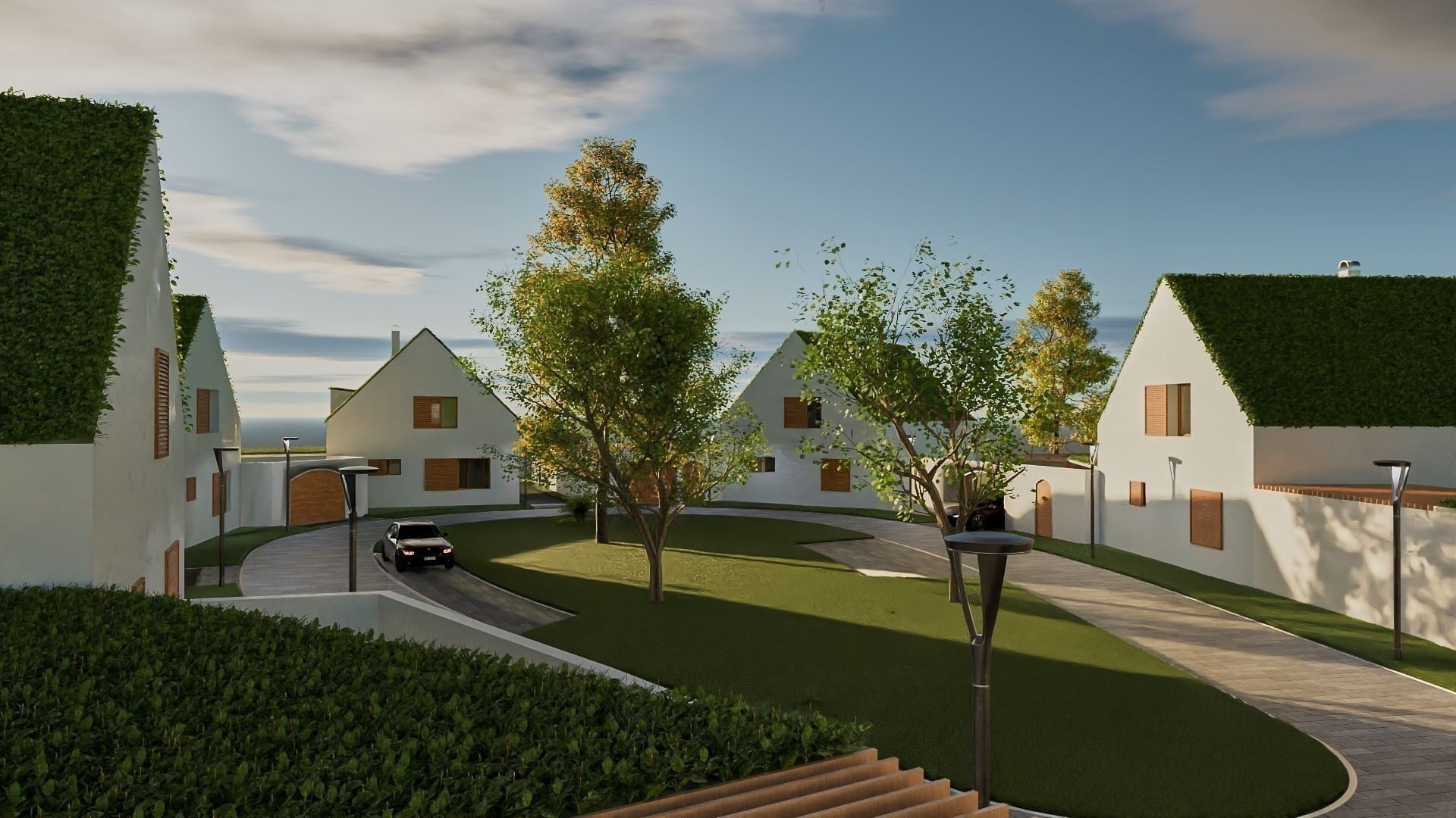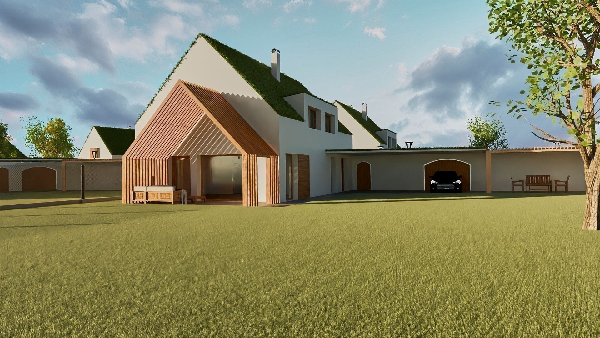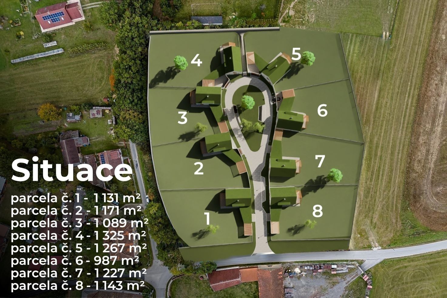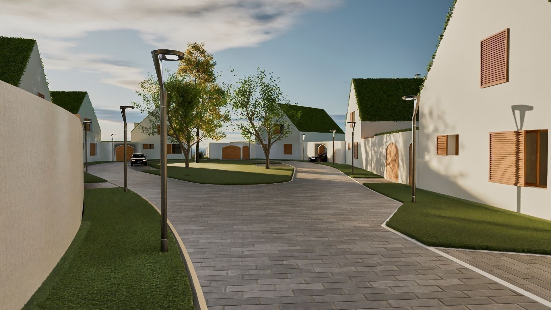 Každý z domů nabídne vlastní zahradu o výměře od 990 do 1 350 m², ideální pro relaxaci nebo rodinné aktivity, a také zastřešené parkovací stání pro vaše pohodlí.