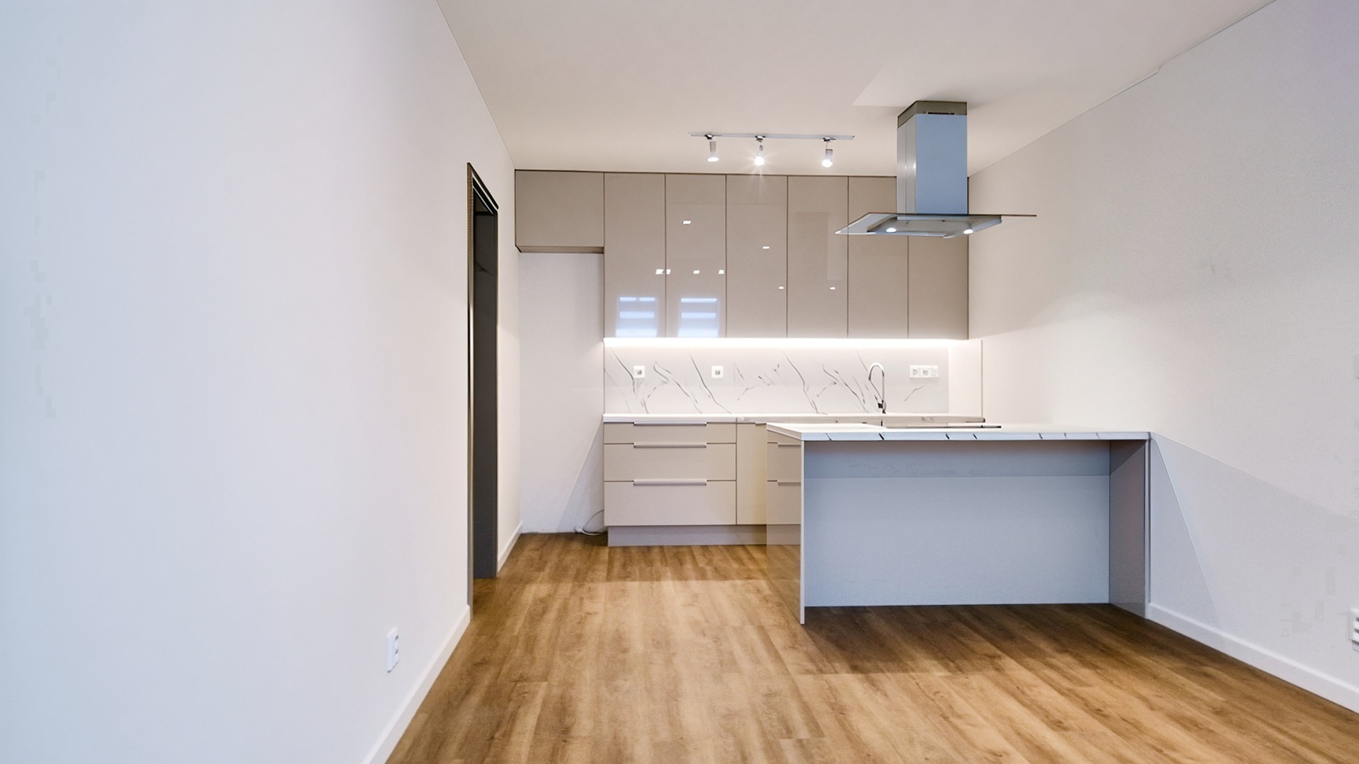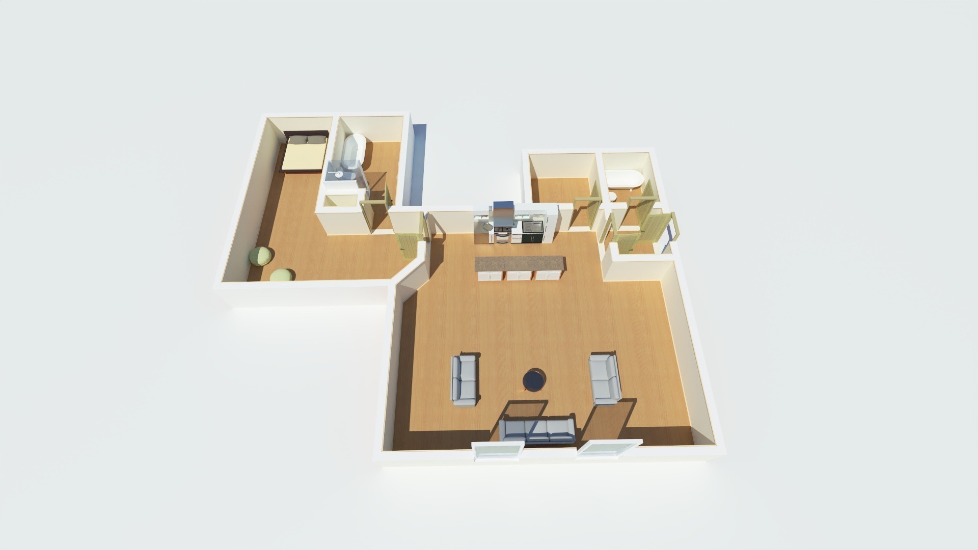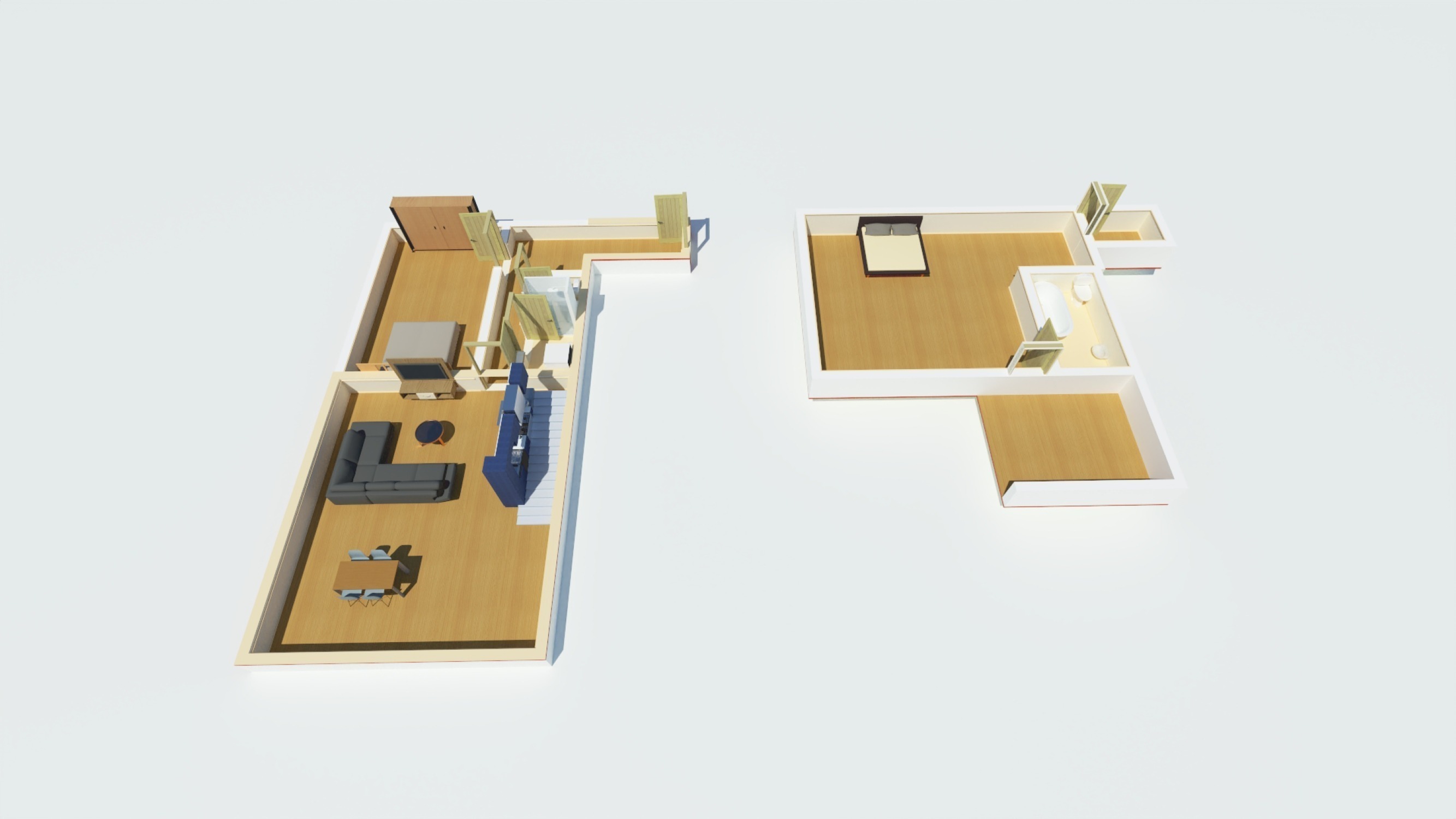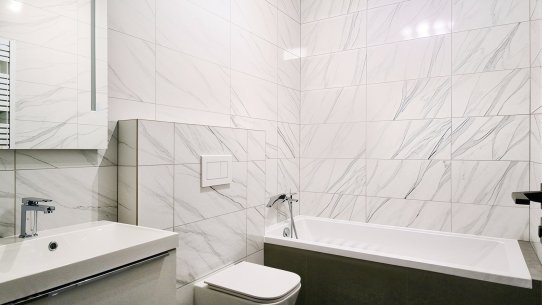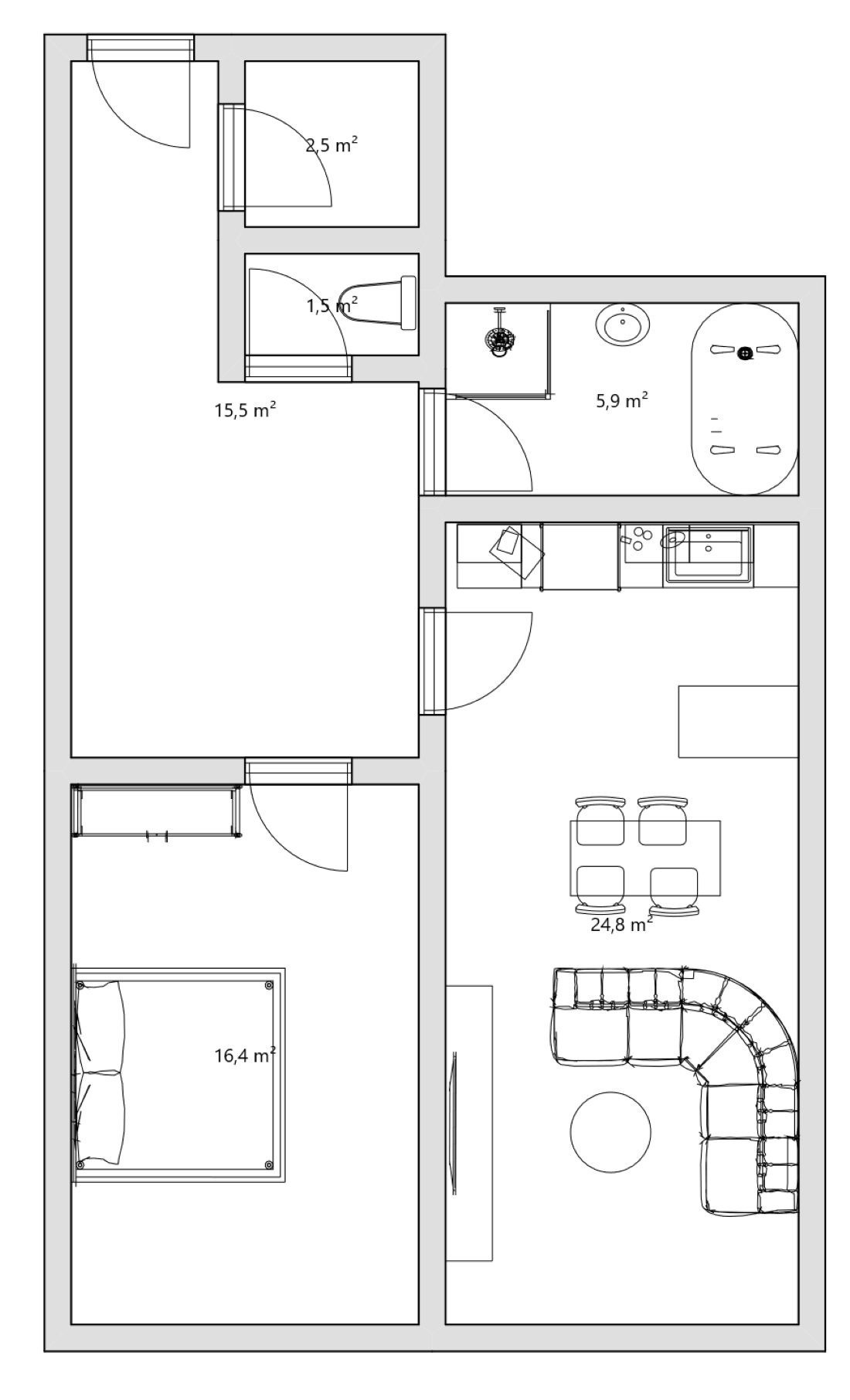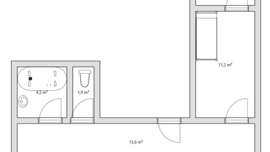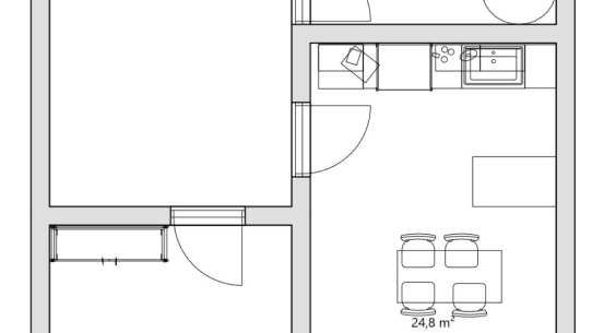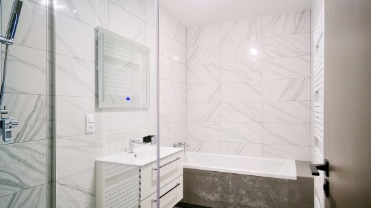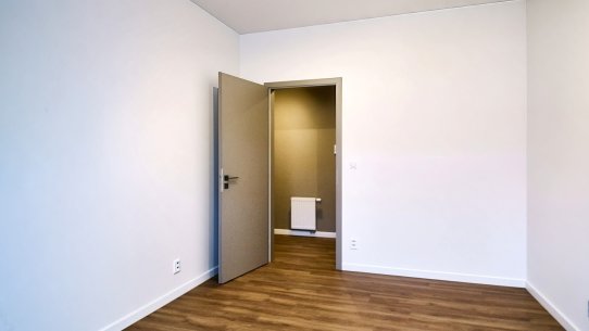 První byt 2+kk s výměrou 66 m² je ideální pro pár nebo menší rodinu. Je tu ložnice, obývák s novou kuchyňskou linkou s ostrůvkem, šatna a koupelna s vanou i sprchovým koutem. Toaleta je samostatná.