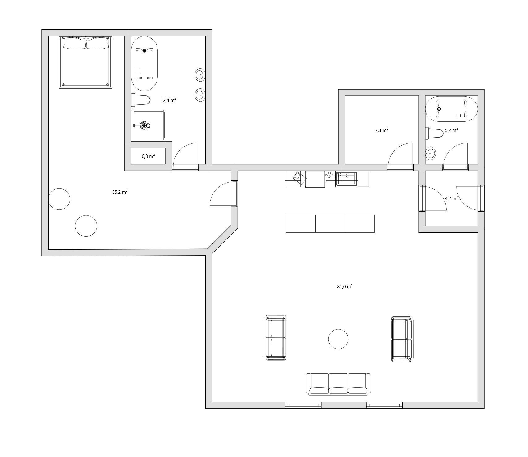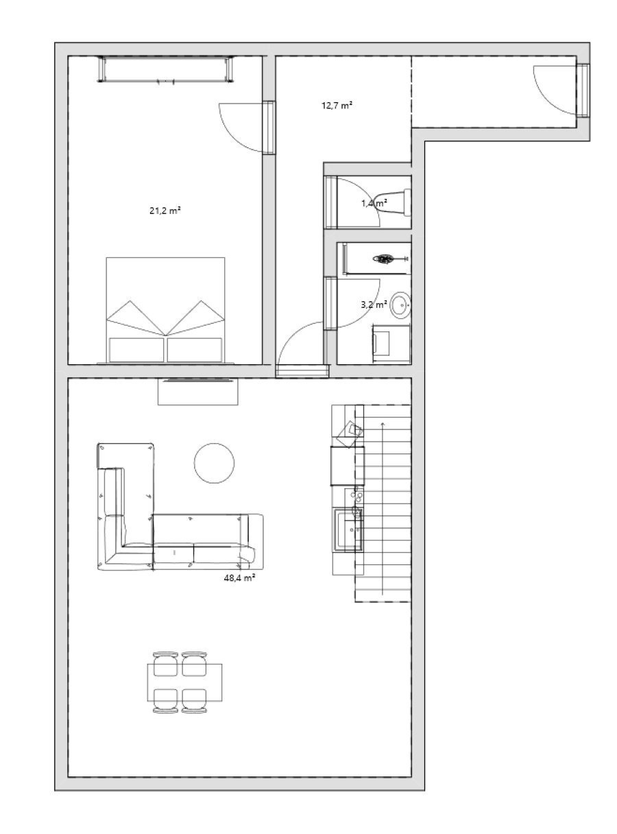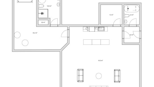 Druhý byt 2+kk s výměrou 146 m² je pro milovníky velkých prostor. Obrovský obývací pokoj o velikosti přes 48 m² s moderní kuchyňskou linkou a designovým barovým ostrůvkem vám dá pocit luxusu. Ložnice má skoro 26 m² a vlastní koupelnu s vanou, sprchou i WC. Nechybí ani komora a druhá koupelna.