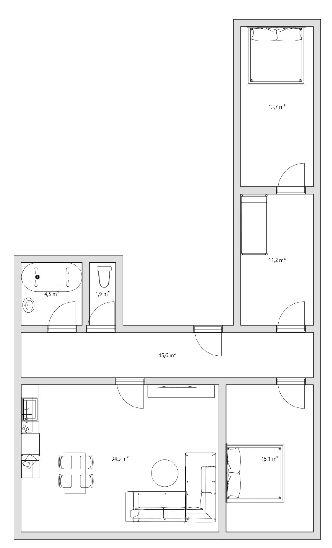 Byt 3+kk s výměrou 96 m² nabízí praktickou dispozici s obývacím pokojem s kuchyňskou linkou, koupelnou s vanou i sprchovým koutem, samostatným WC a dvěma ložnicemi. Navíc je tu třetí průchozí pokoj, který můžete využít jako hernu, pracovnu nebo šatnu podle toho, co zrovna potřebujete.