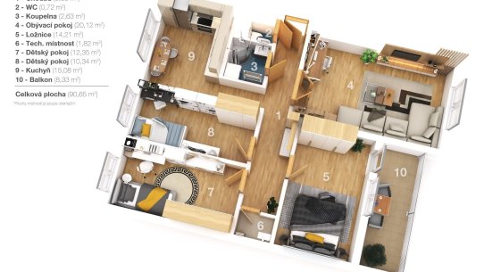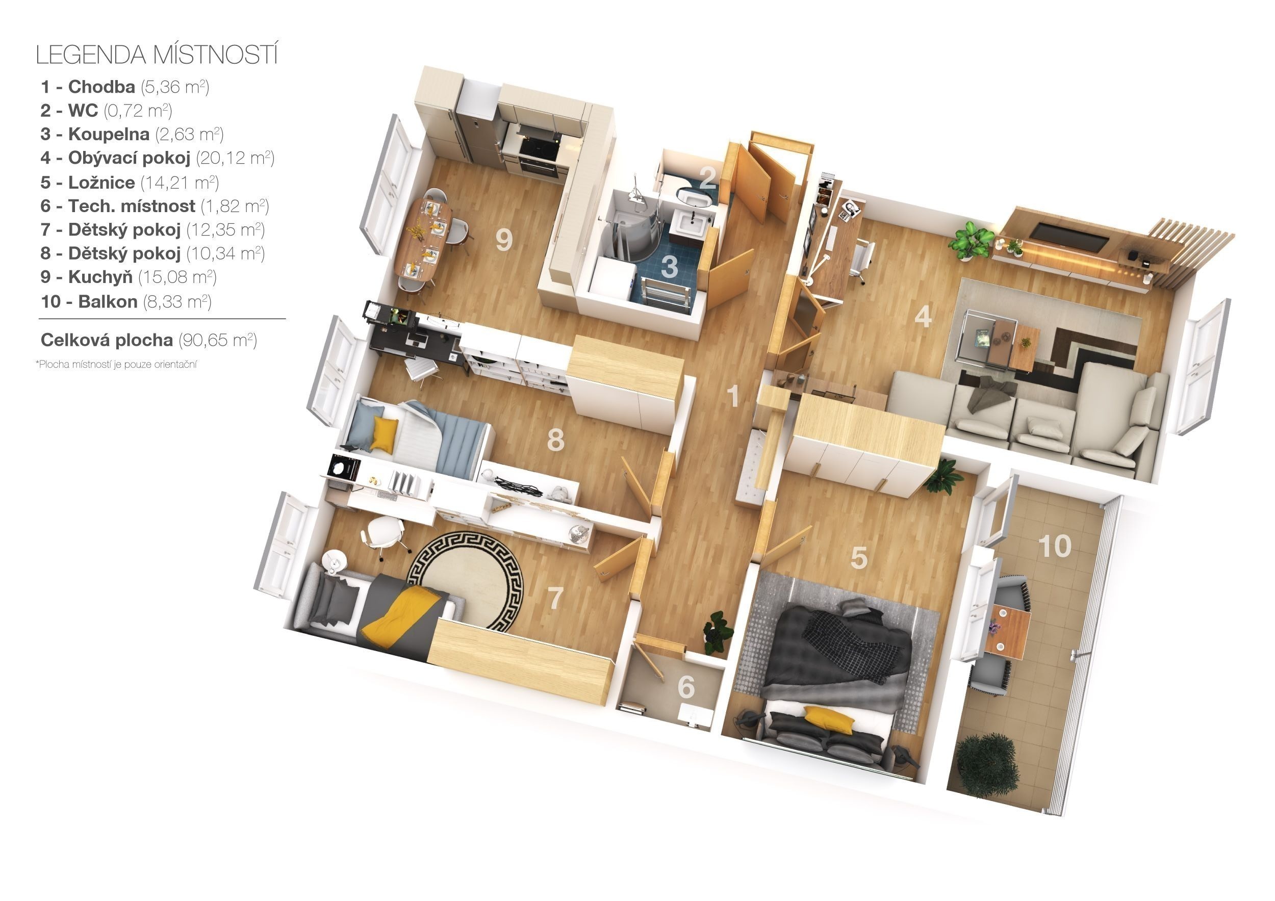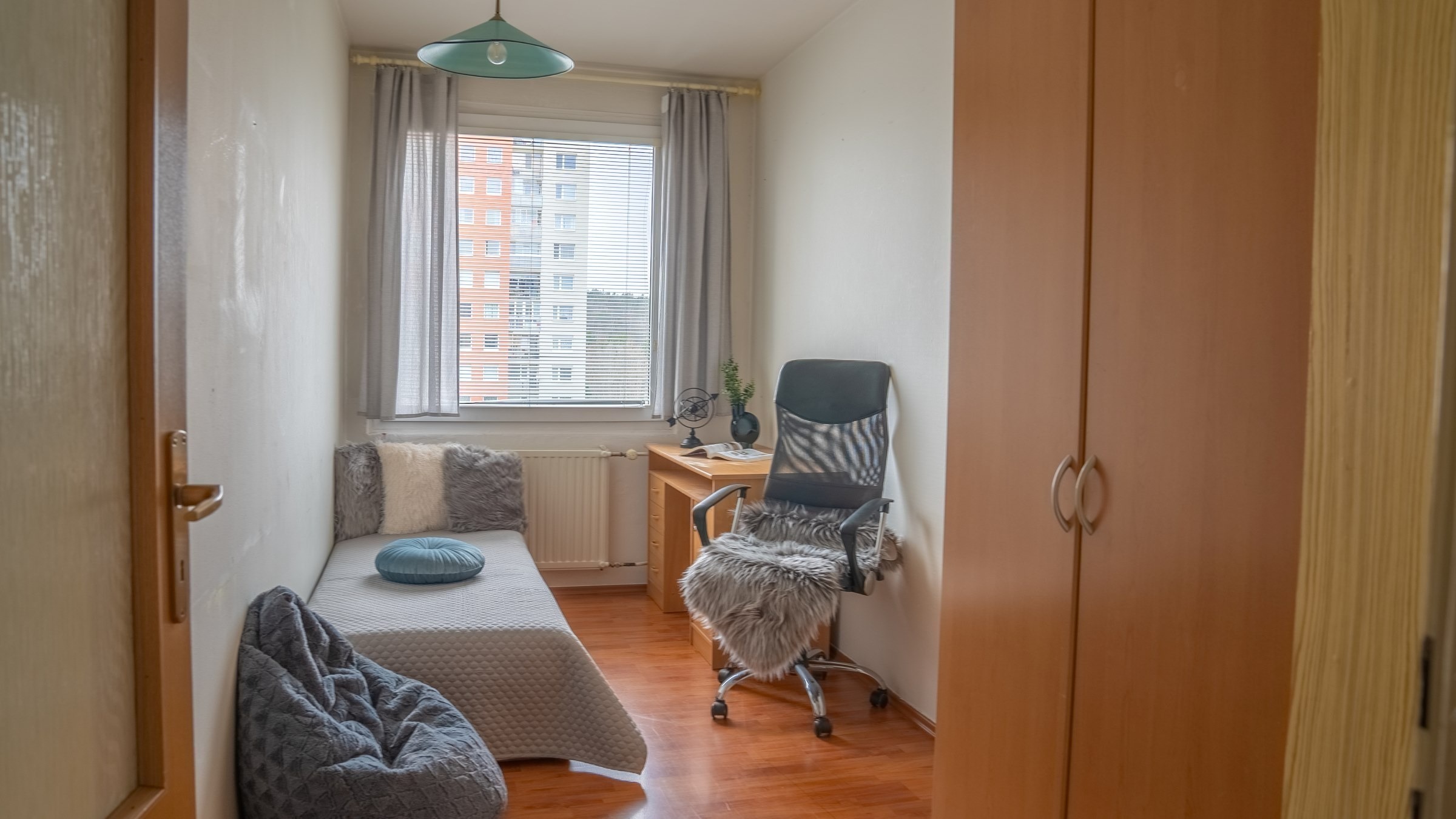 Byt o velikosti 90 m2 má dispozici 4+1 – je tu kuchyně, obývák, 3 ložnice, koupelna a samostatné WC. Na chodbě je komora.