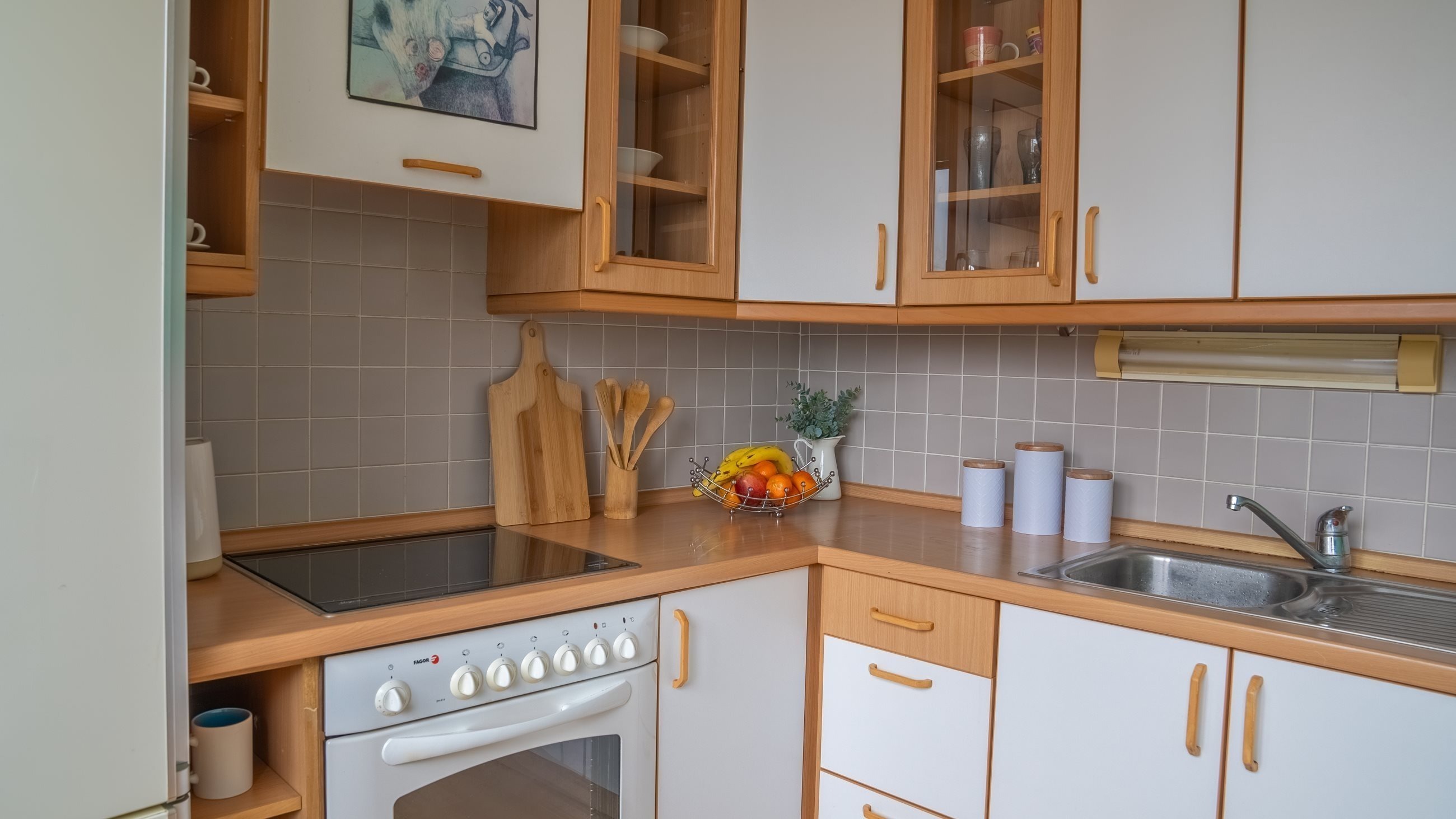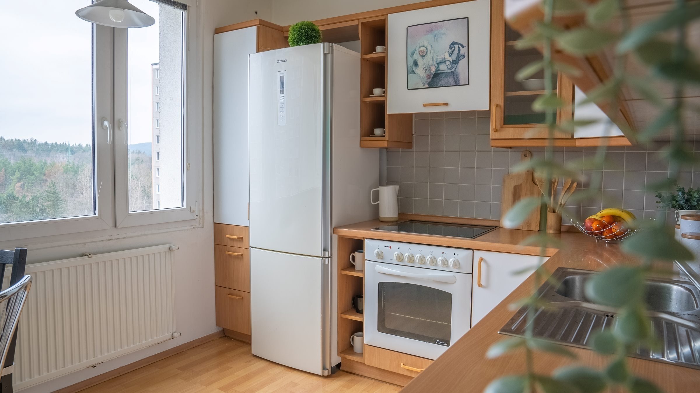 Kuchyně má rohovou linku s vestavěnými spotřebiči. A taky výhled na les, ve kterém si protáhnete svaly a vyčistíte hlavu.