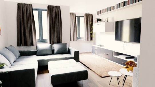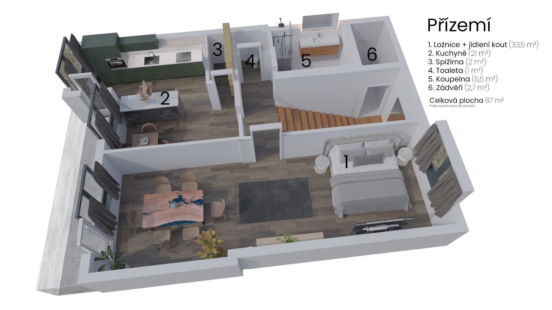 V přízemí o velikosti 80 m2 je velký obývák, samostatná kuchyně, koupelna se sprchou a toaleta. Kuchyně má výměru necelých 21 m2, takže tu budete mít dost místa třeba na novou velkou linku s barovým ostrůvkem i jídelní kout. Navíc ji můžete spojit s obývákem o velikosti 33 m2 a získat tak obrovský světlý prostor. A nechybí tu ani komora. Z kuchyně vyjdete balkonovými dveřmi přímo na dlážděný balkon se schody vedoucí do zahrady.