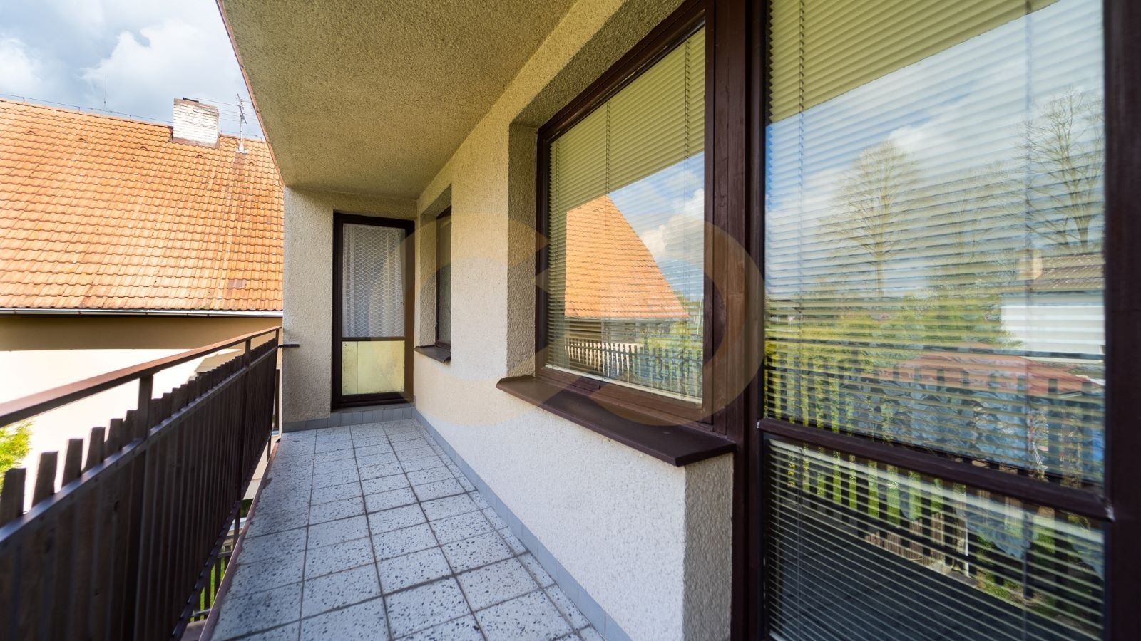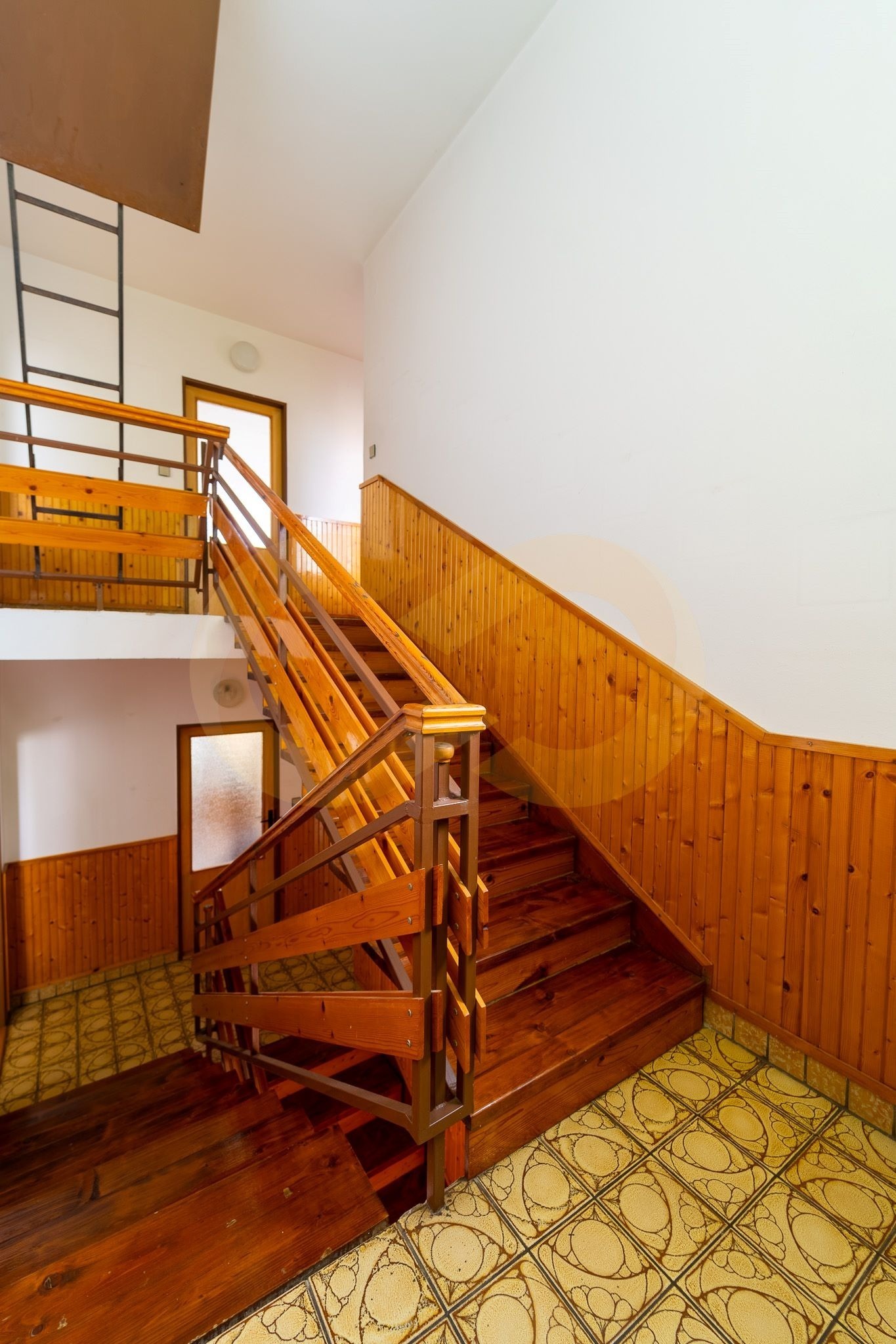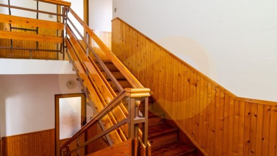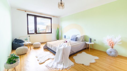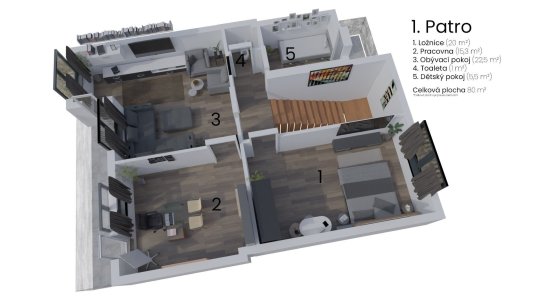Do prvního patra se dostanete po schodech ze vstupní chodby. V patře se nachází druhý obývací pokoj, ze kterého se vchází do velké ložnice se vstupem na balkon orientovaný do zahrady. Další dvě ložnice jsou přístupné z chodby, menší z nich má vstup na balkónek do ulice. Kromě toho je tu samostatná toaleta a přístup na půdu.