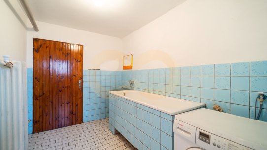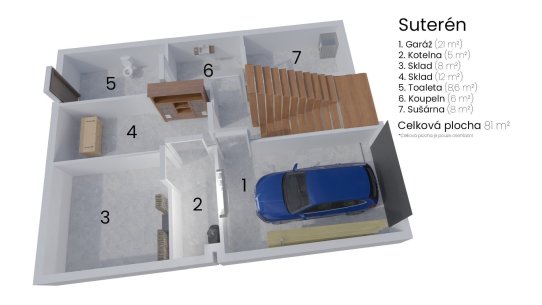 Ze suterénu vedou dveře do garáže i na zahradu. Dům je podsklepený a v prostorách je prádelna a sušárna s koupelnou, kotelna se skladem na dřevo i sklep ideální třeba na brambory.