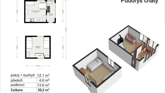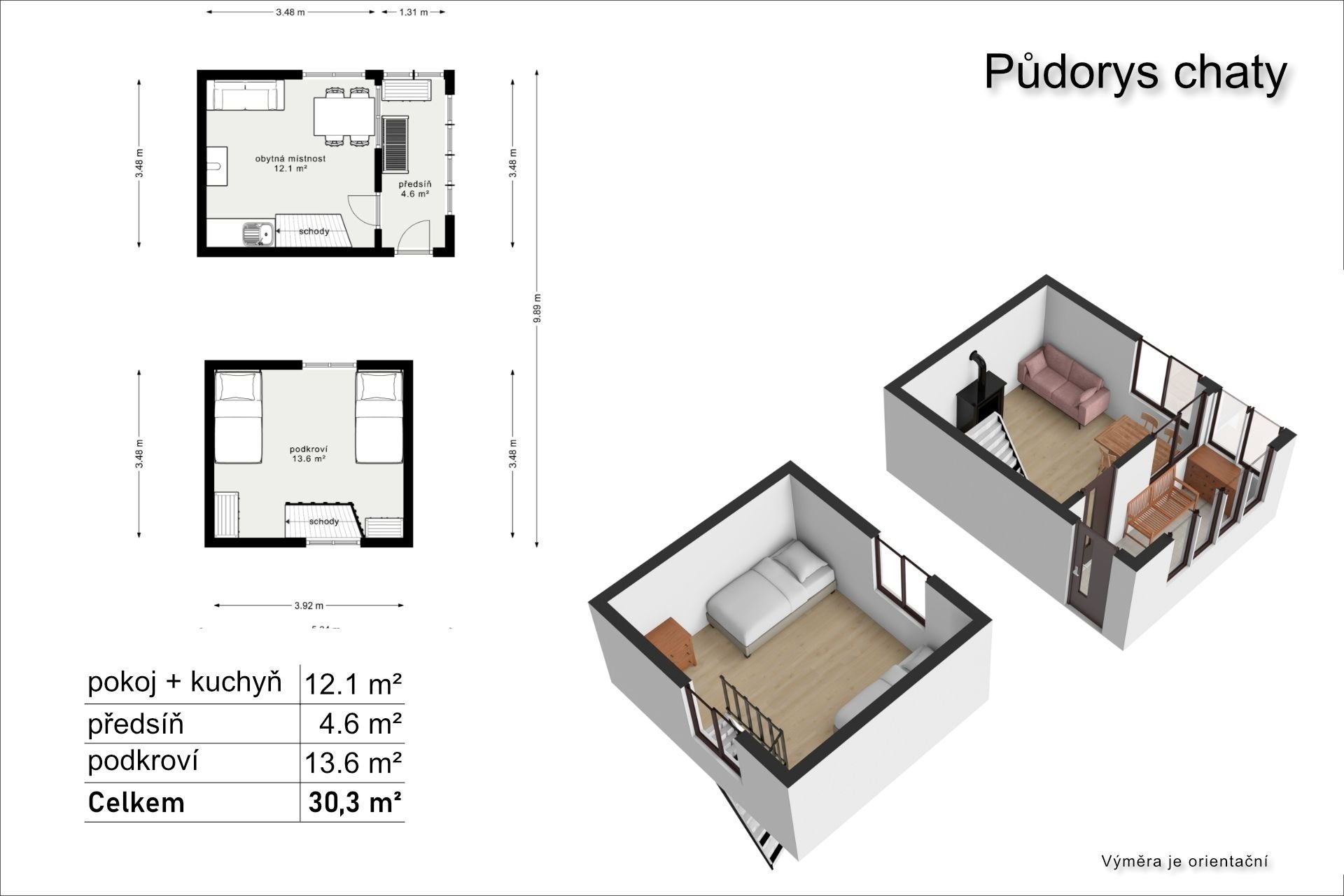 Chata má dvě podlaží s obytnou plochou 40 m². Nachází se na prostorném pozemku o rozloze 400 m², který nabízí dostatek soukromí i prostoru pro relaxaci, zahradničení či rodinné posezení u ohně.