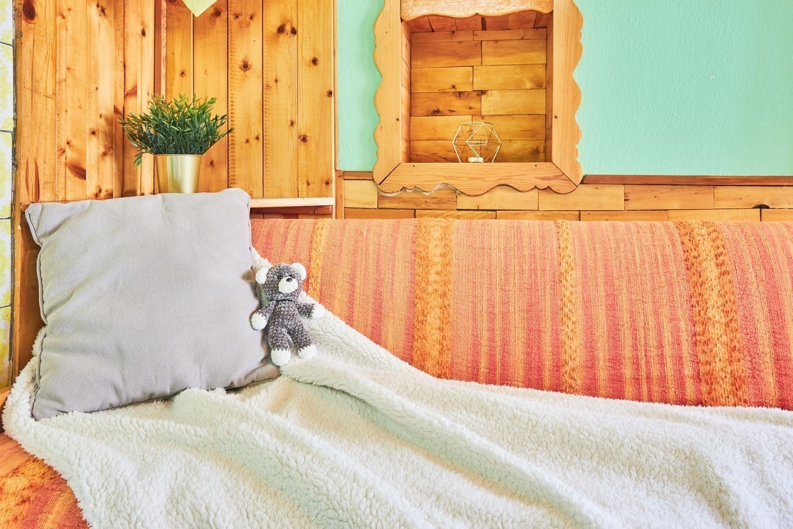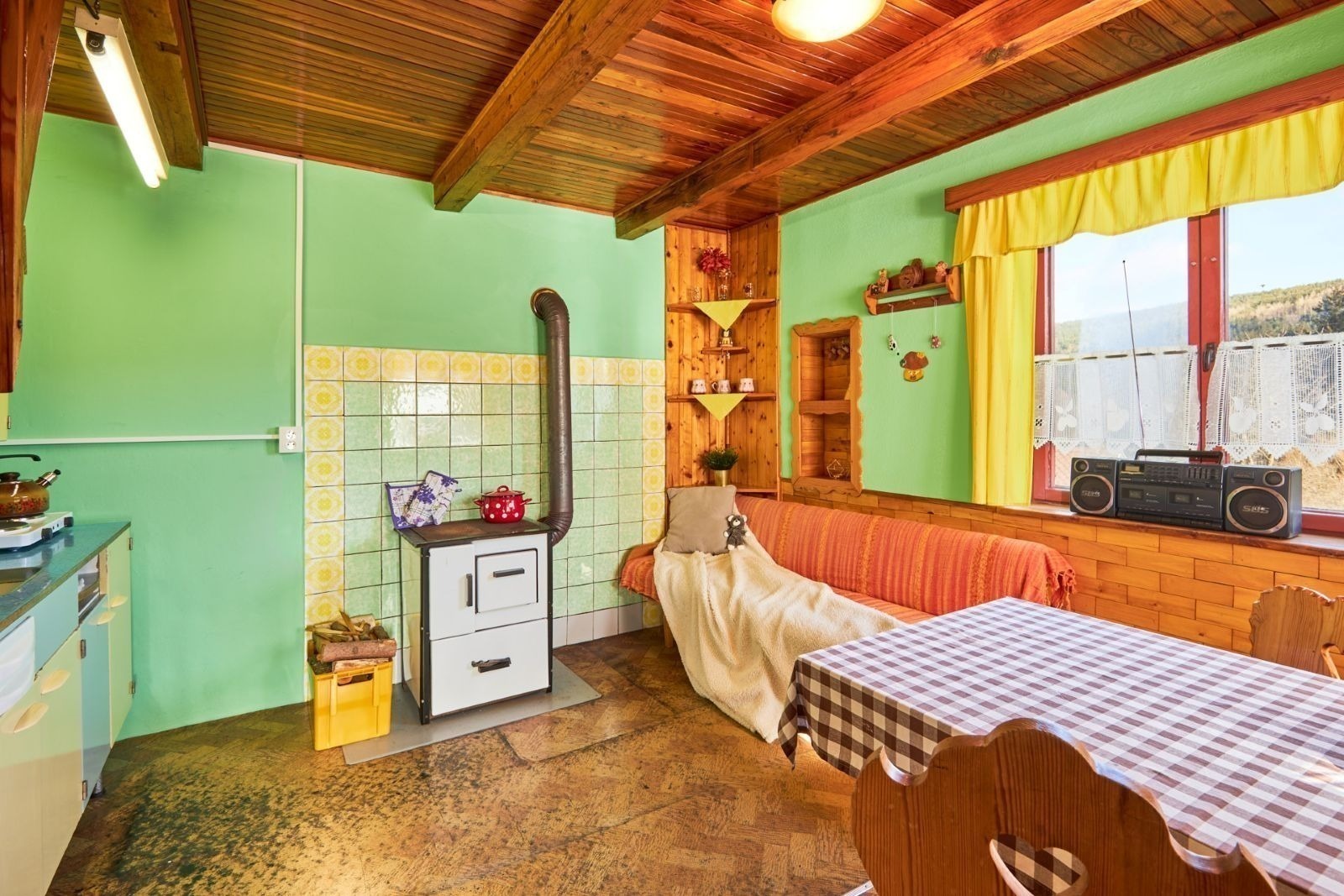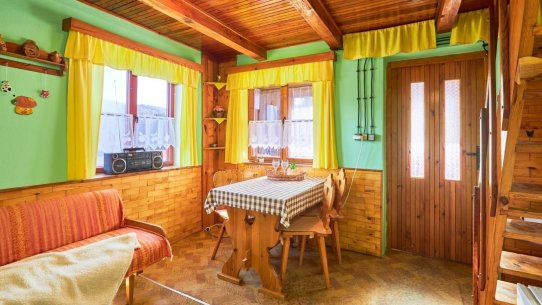 V přízemí se nachází vstupní prostor, který vede do hlavní obytné místnosti. Zde je kuchyňský kout s prostorem na vaření, jídelní stůl, kde se pohodlně usadí celá rodina, a také pohovka, která poslouží k odpočinku po dlouhém dni stráveném venku. Atmosféru zpříjemňují kamna, která jsou napojena na zcela nový komín, což zajišťuje efektivní vytápění v chladnějších měsících.