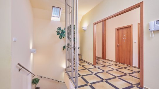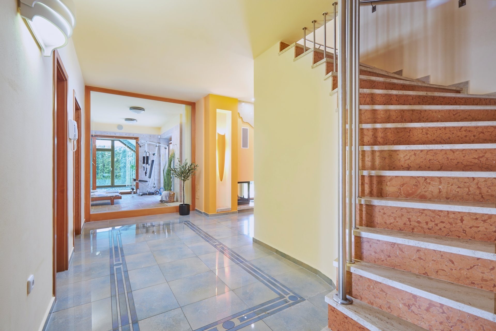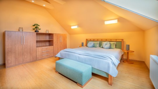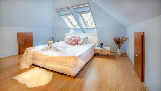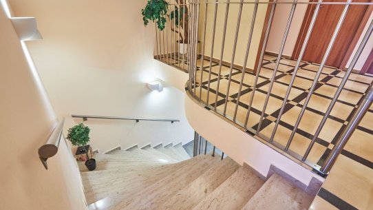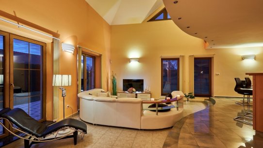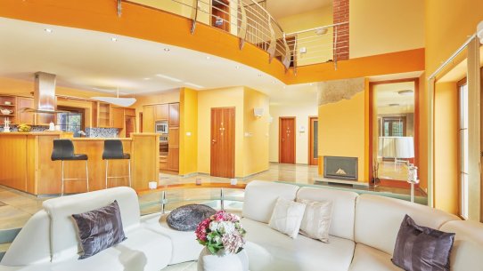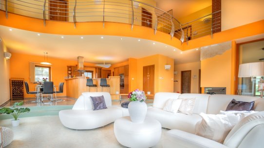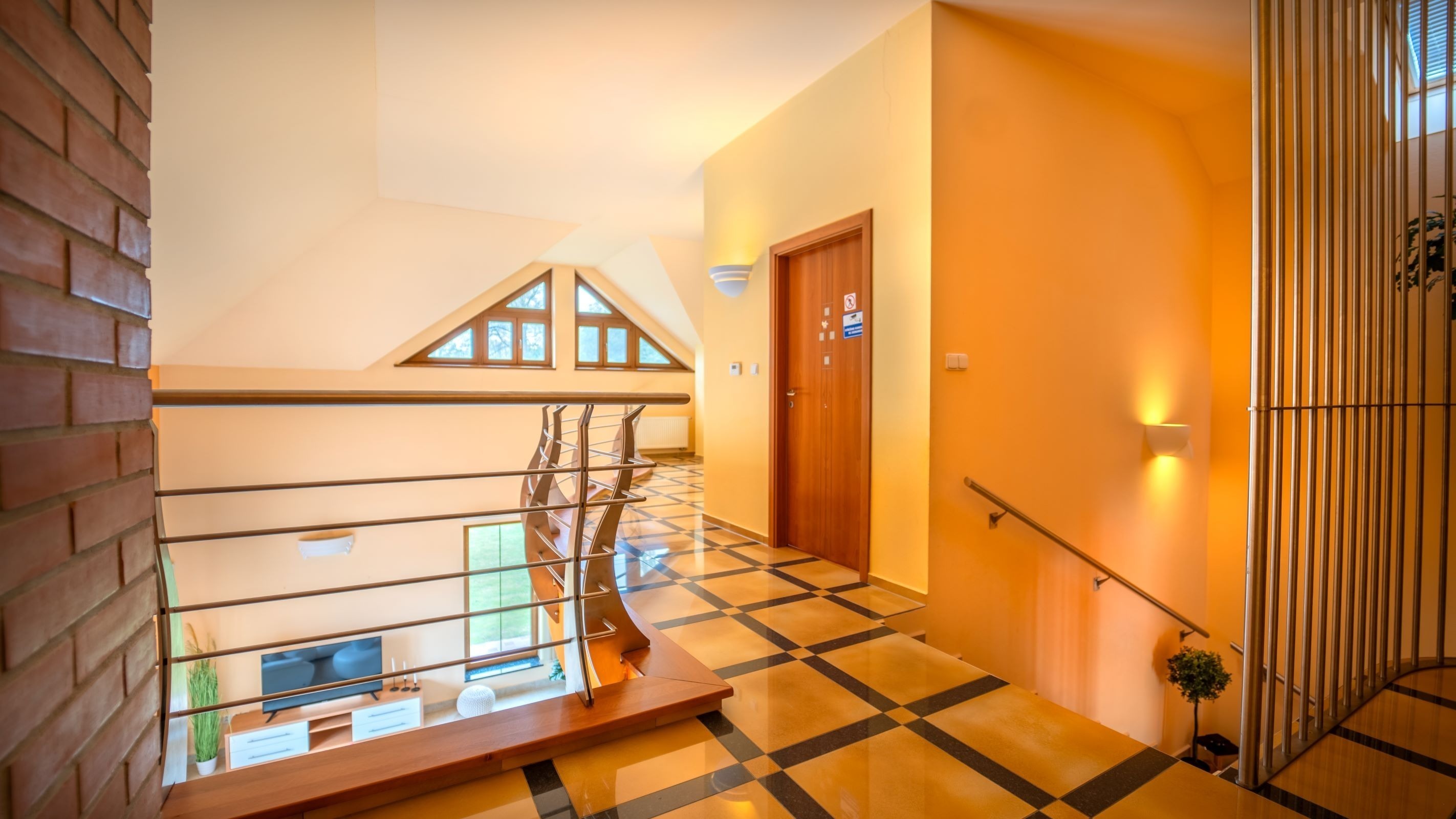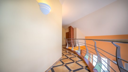 Po mramorovém schodišti vystoupáte do patra a pokocháte se pohledem na svůj nový obývák. Z galerie zamíříte nachytat bronz do solária nebo si odpočinete v jedné ze čtyř ložnic.