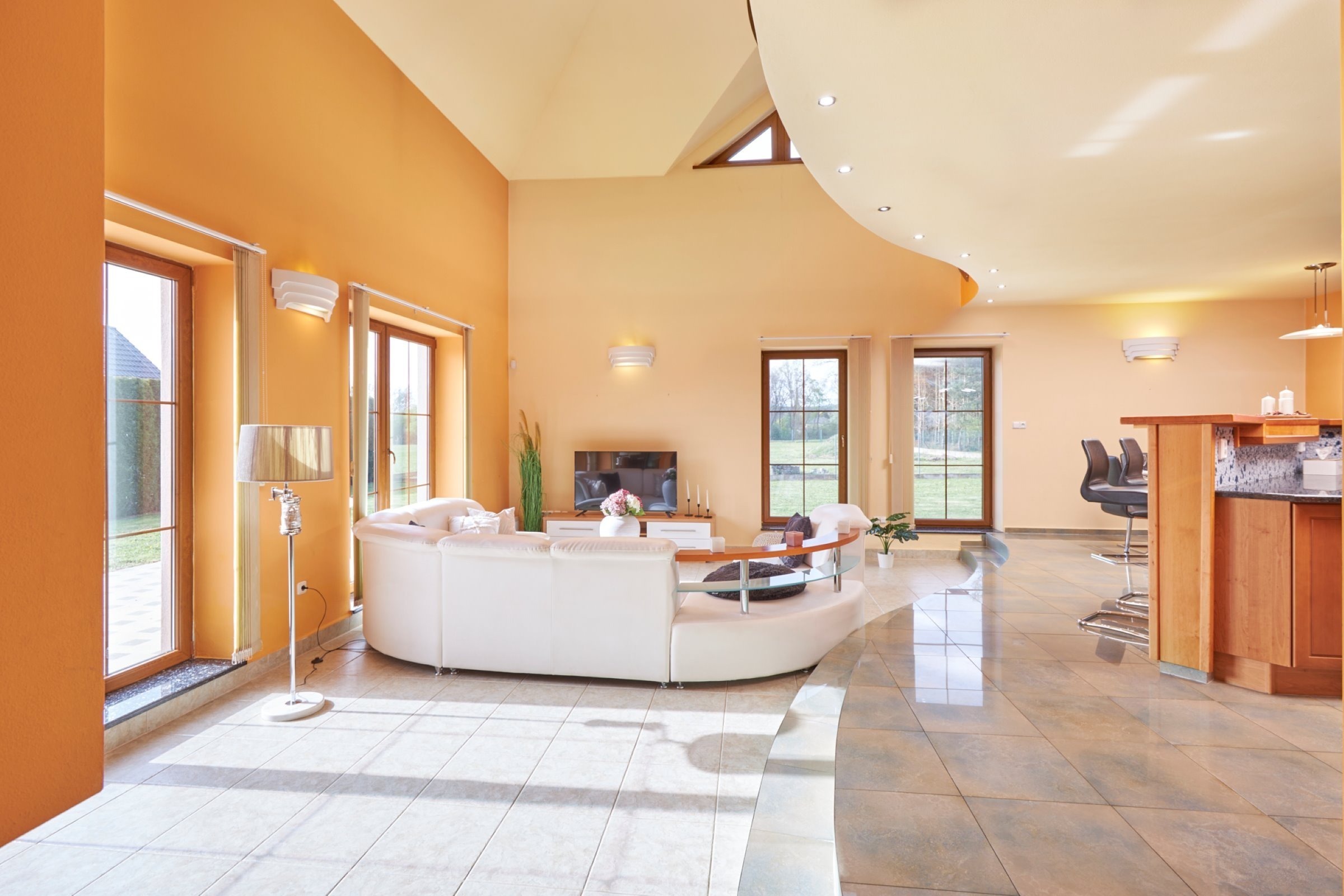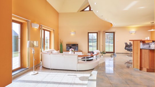 Dominantou domu je prostorný obývací pokoj s kuchyní, kde se vám bude vařit i relaxovat jedna báseň. Jeho rozloha je 62 m2 a v létě si ho ještě rozšíříte – stačí otevřít dveře na terasu.