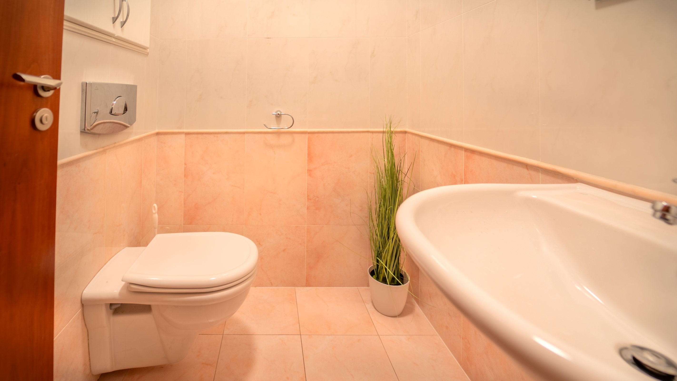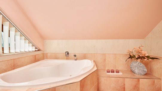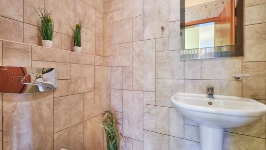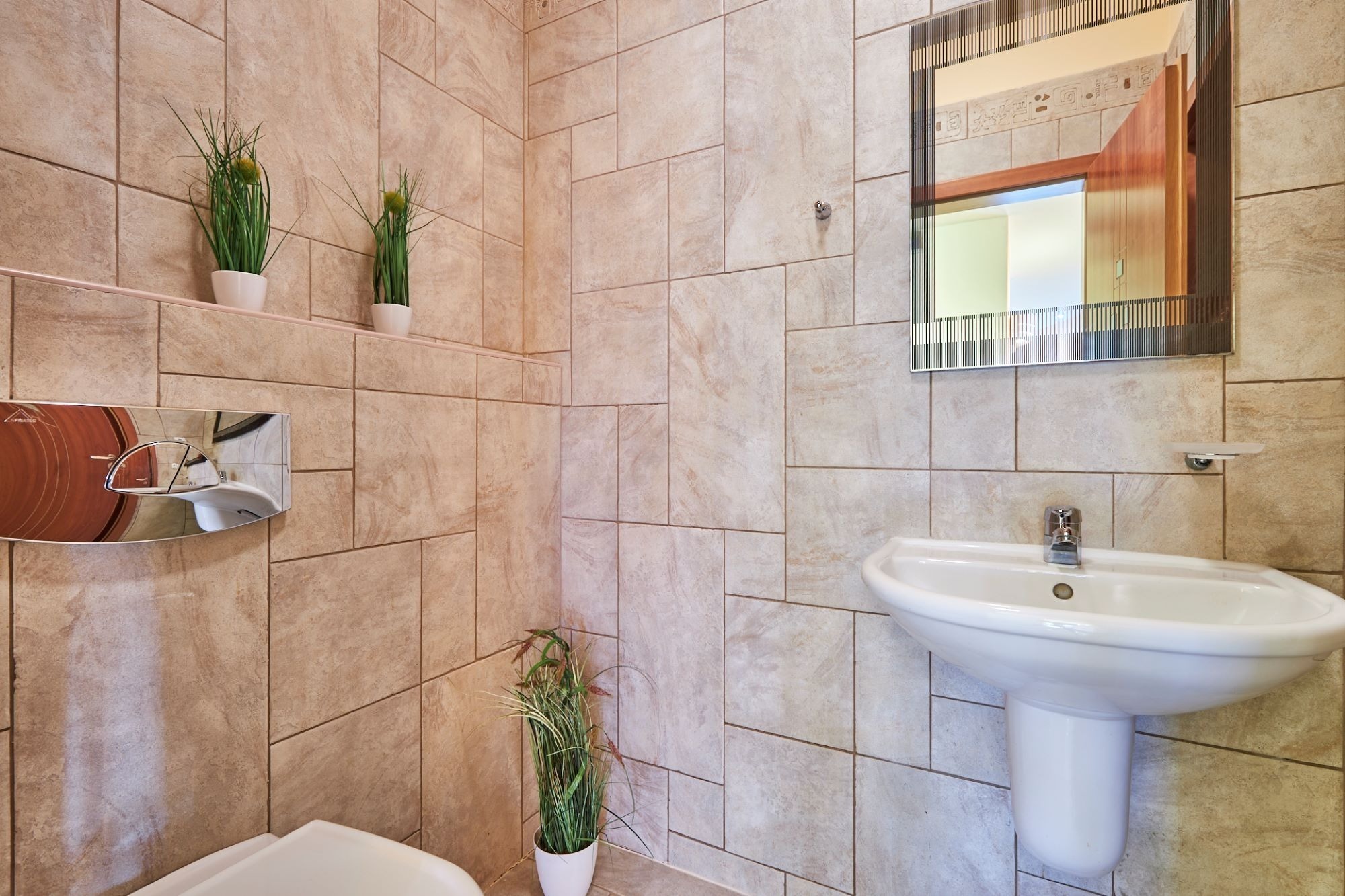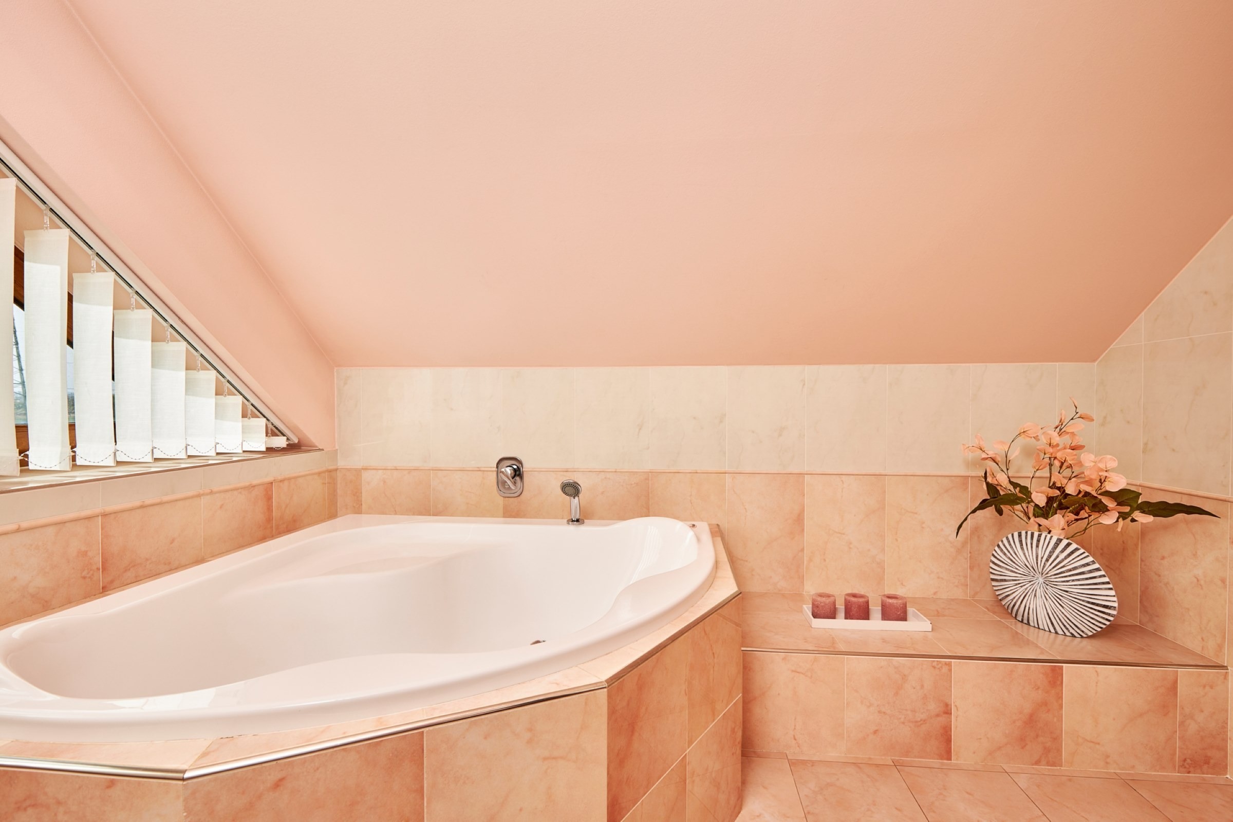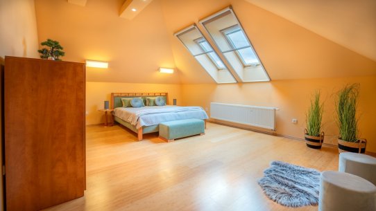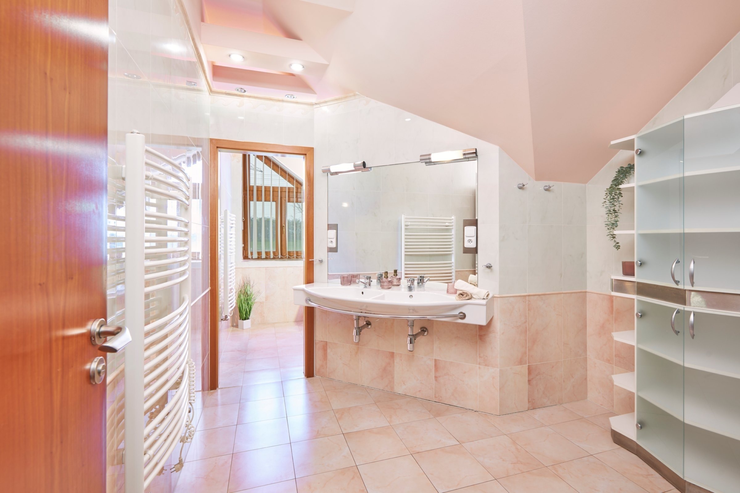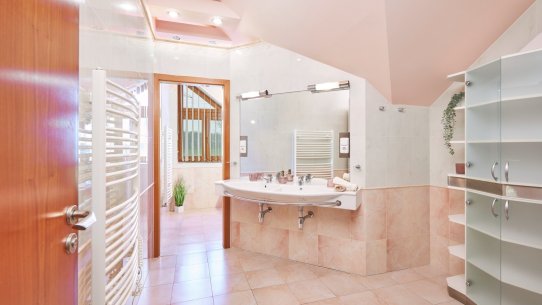 V patře je velká koupelna s rohovou vanou, toaleta je oddělená. Další WC a také sprcha je v přízemí u wellness zóny.